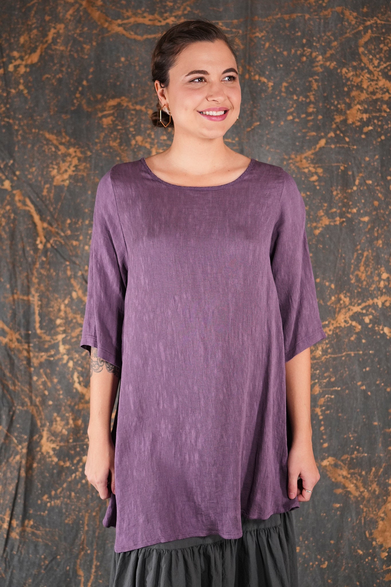 A luxurious drape and feel characterizes this simple, A-lined tunic. Made from a washable heavier silky feeling fabric that comprises 66% rayon, 17% cotton, and 17% nylon. This fabric has a delicate textural effect- Dyed beautifully. Simply unprinted.