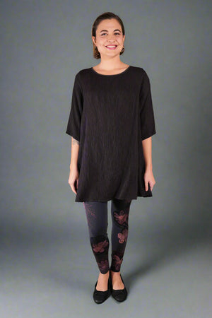 A soft black legging is printed with peach blossoms and black floral silhouettes with hints of brighter line texture.