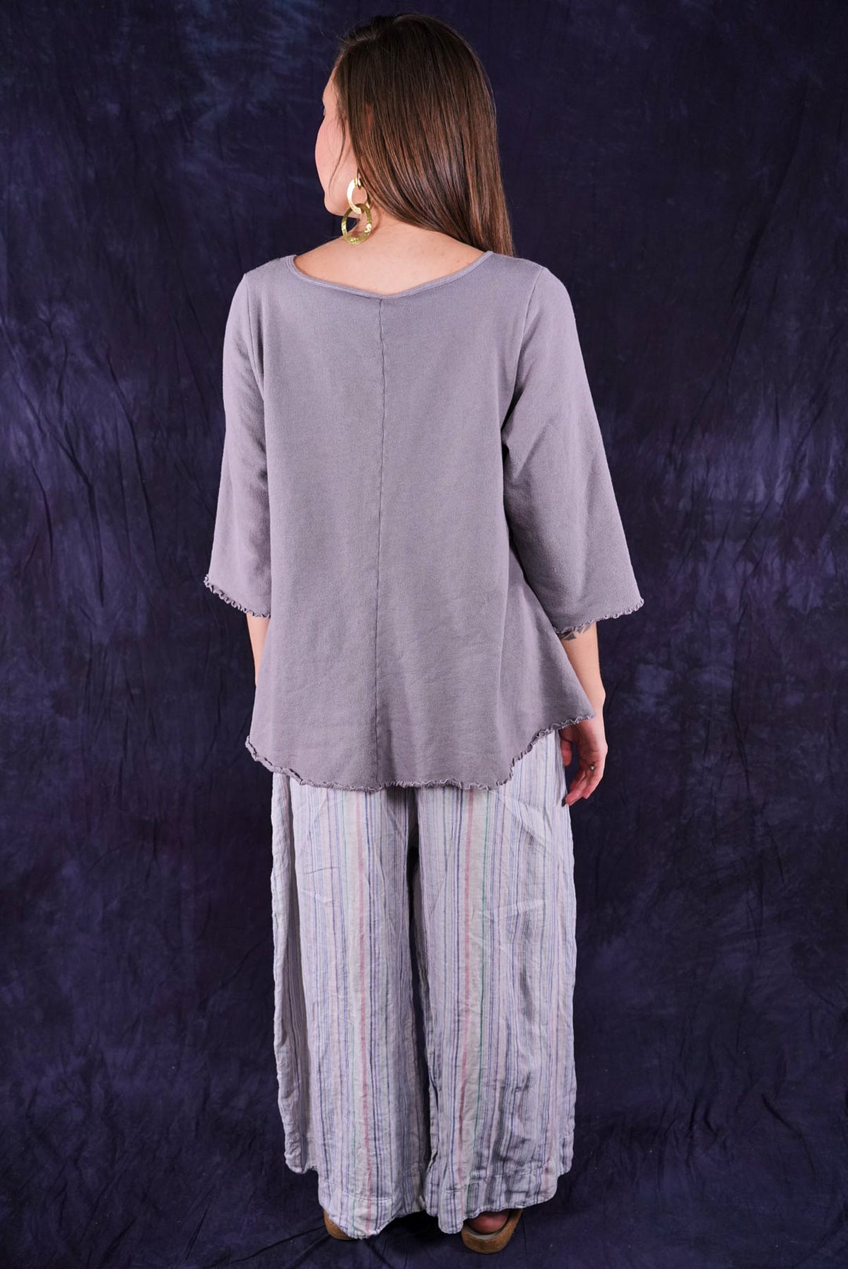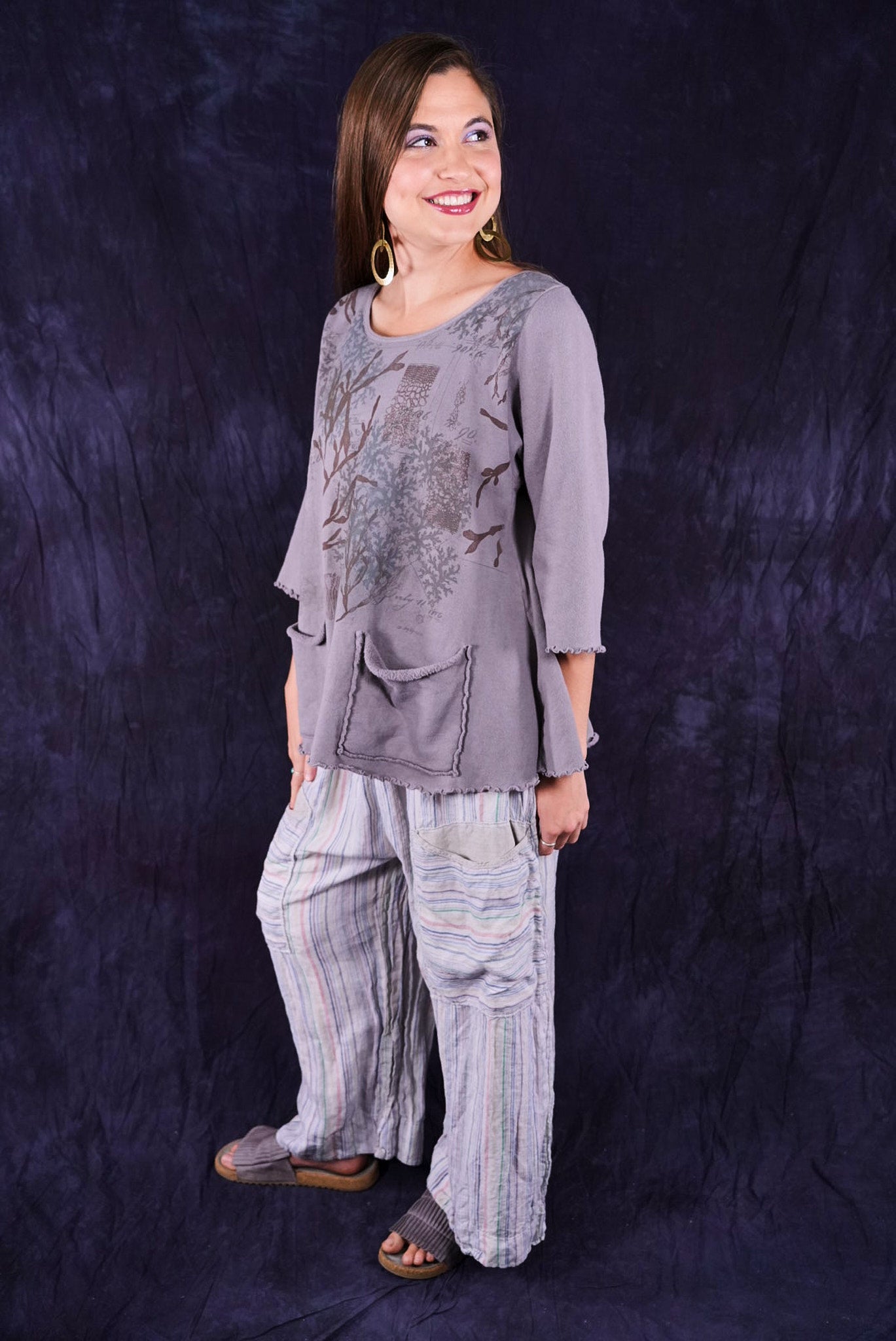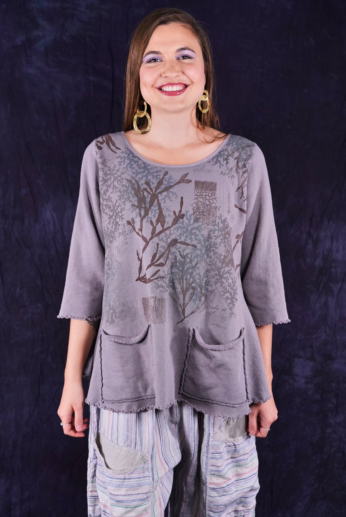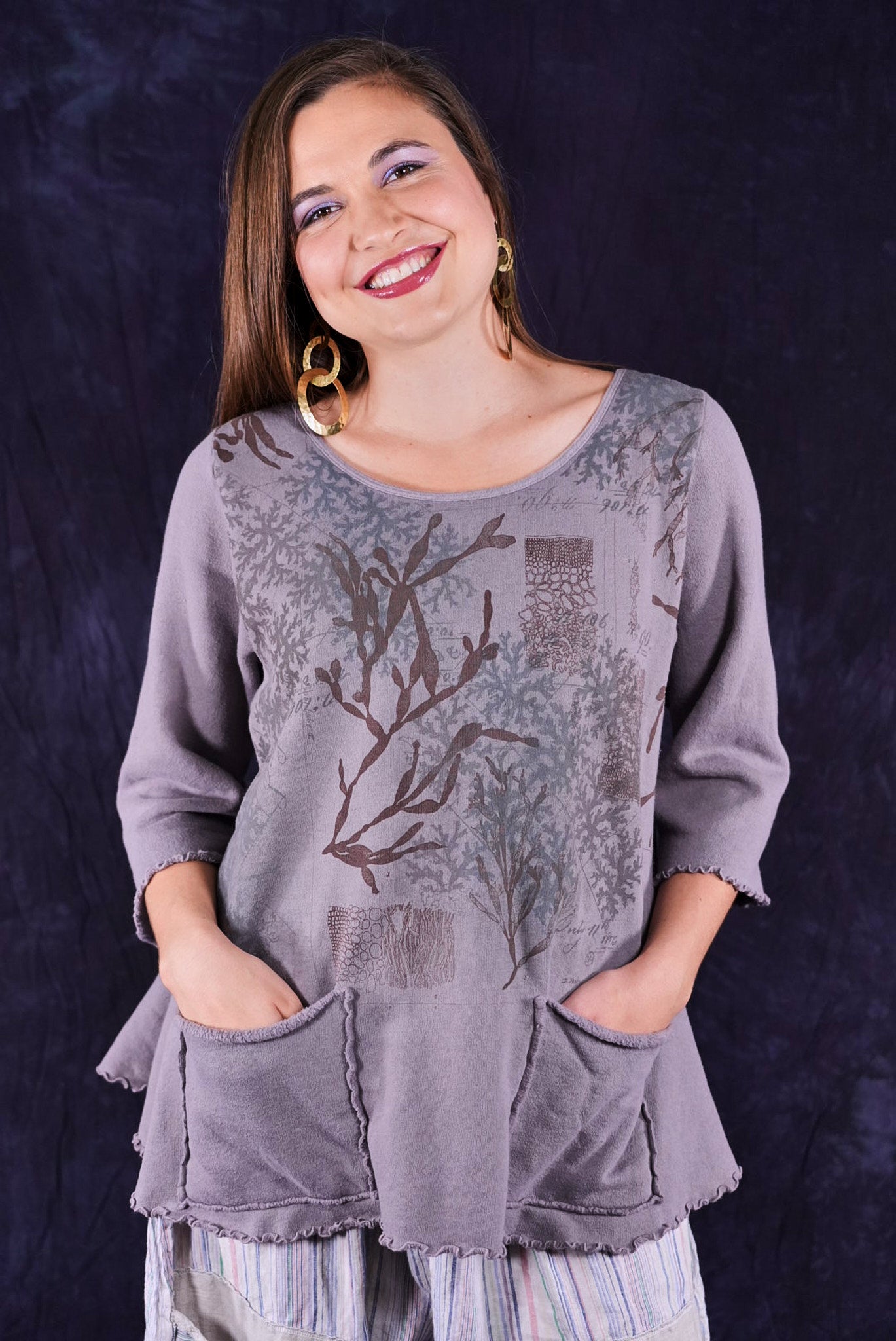Our cafe tee in a plush sweatshirt with raw edges- so sweet! There are 2 pockets and it goes over everything... From the Zen Tunic to the Linen Tank. Soft organic cotton and a beautiful print!