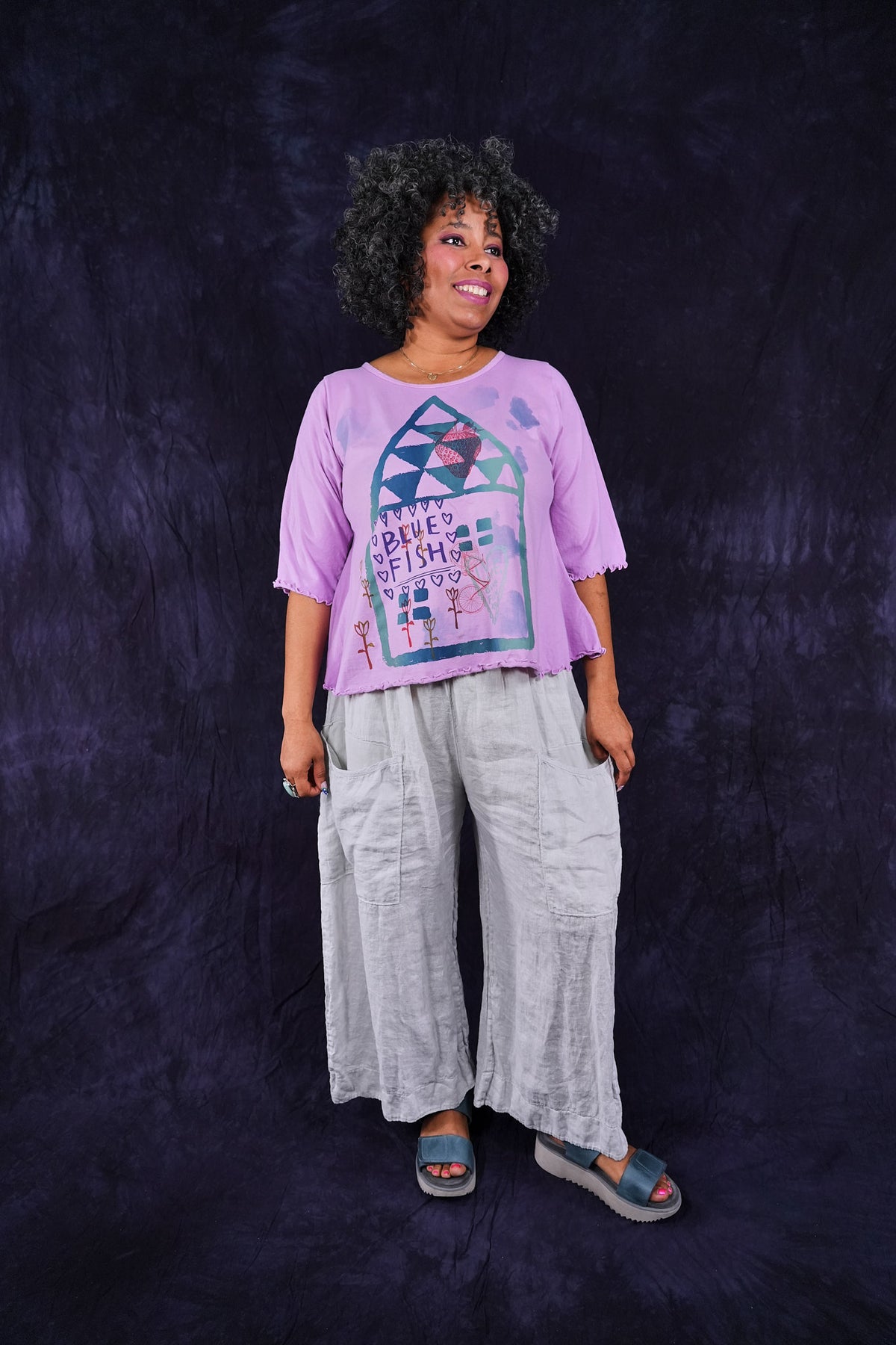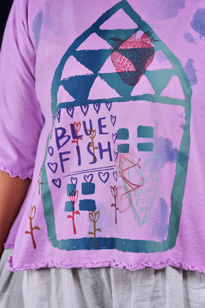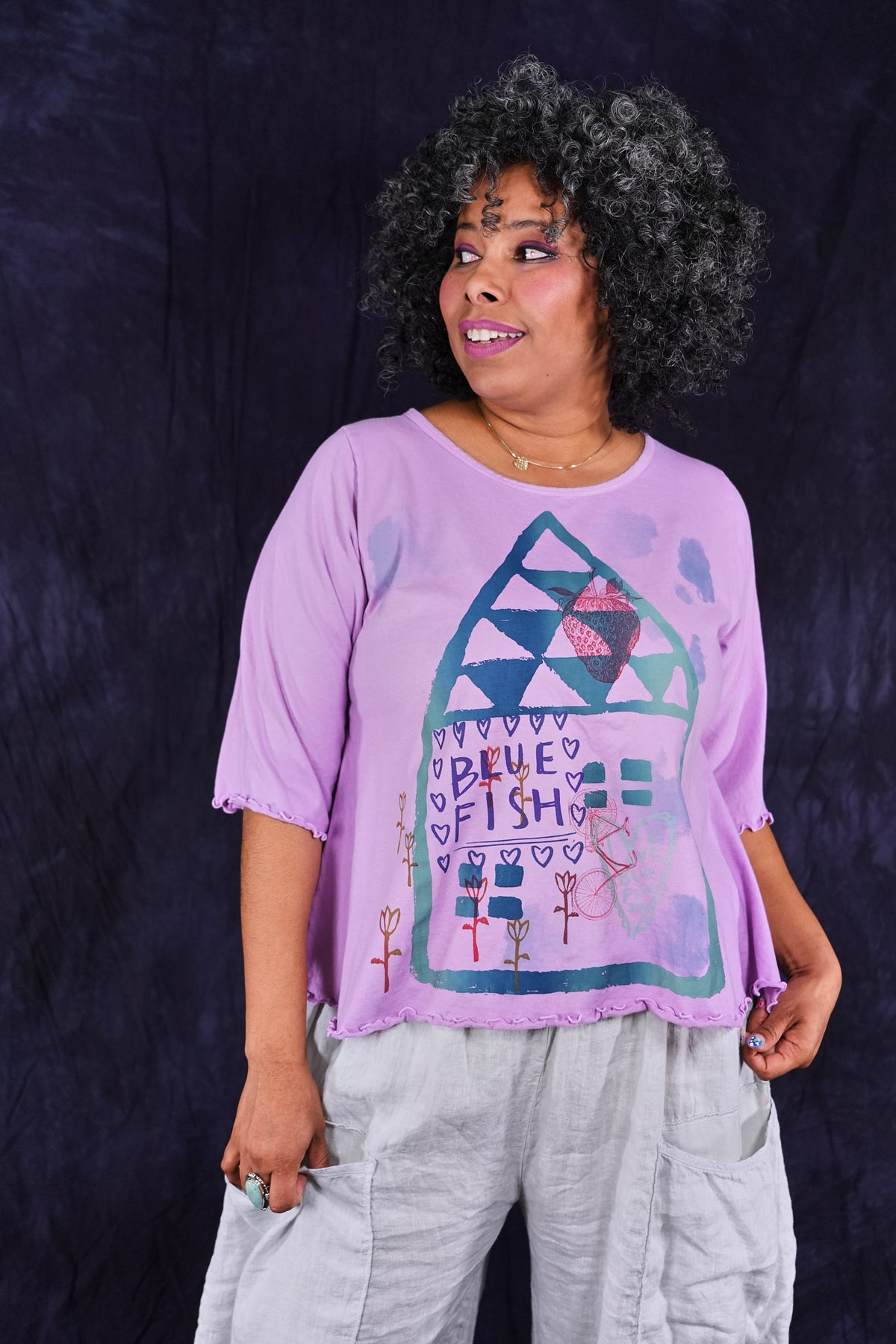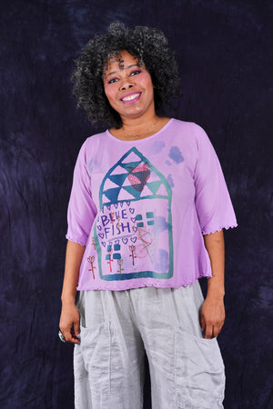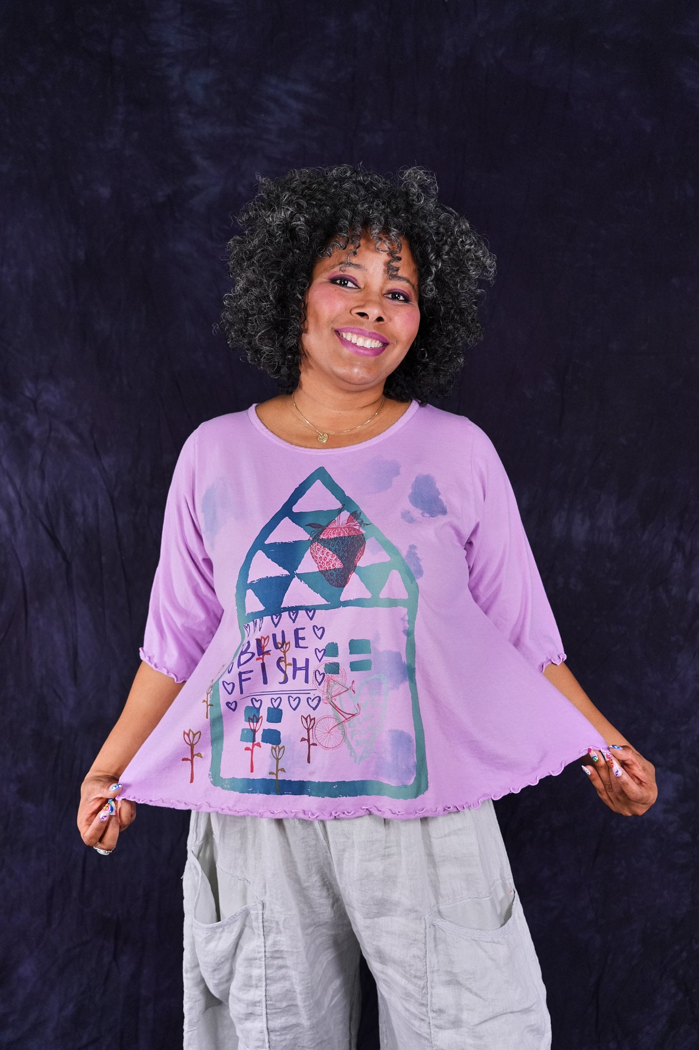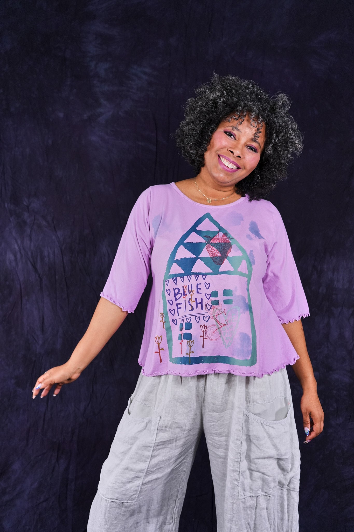 HOT off the print tables! Super cute and happy. Only a few made :) A 3/4 Sleeve Cafe Tee in a slightly shorter length to create perfect summer outfits. Can be worn over a longer tank that peeks out from underneath as a layering option.