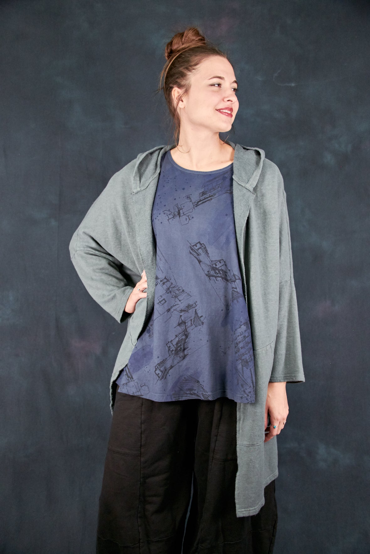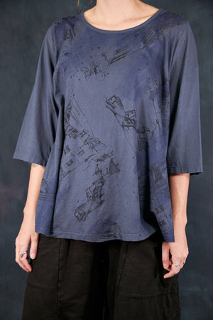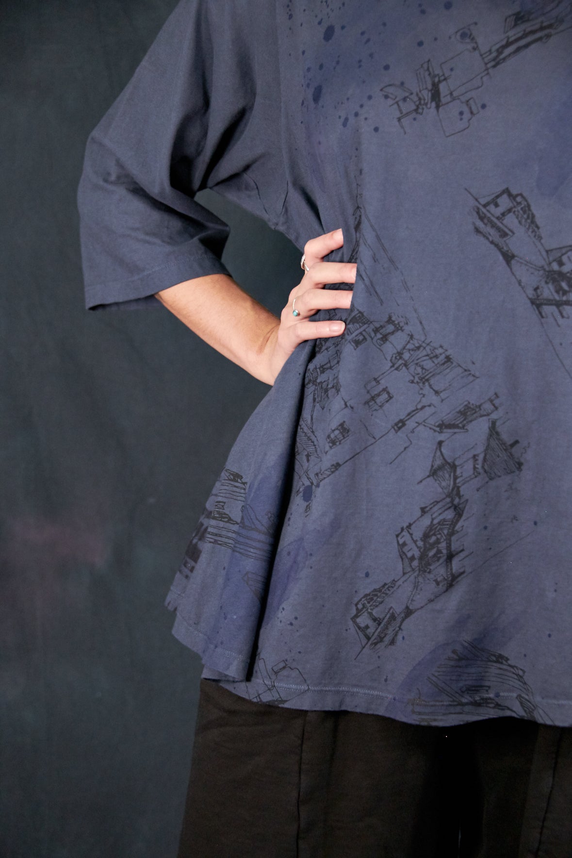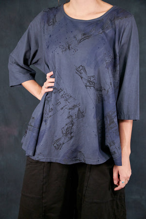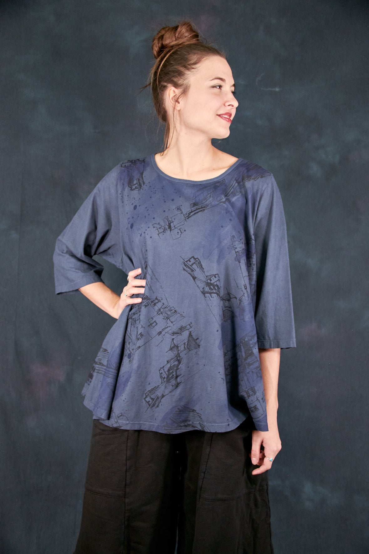 This A-line tee is always a favorite. Made in the USA from medium-weight organically grown cotton that is knit for us in the Carolinas. It has the characteristic A-line swing, wide at the bottom. A great piece because it can be layered or worn alone. Hand printing is always different and transforms this top into a singular artful garment.