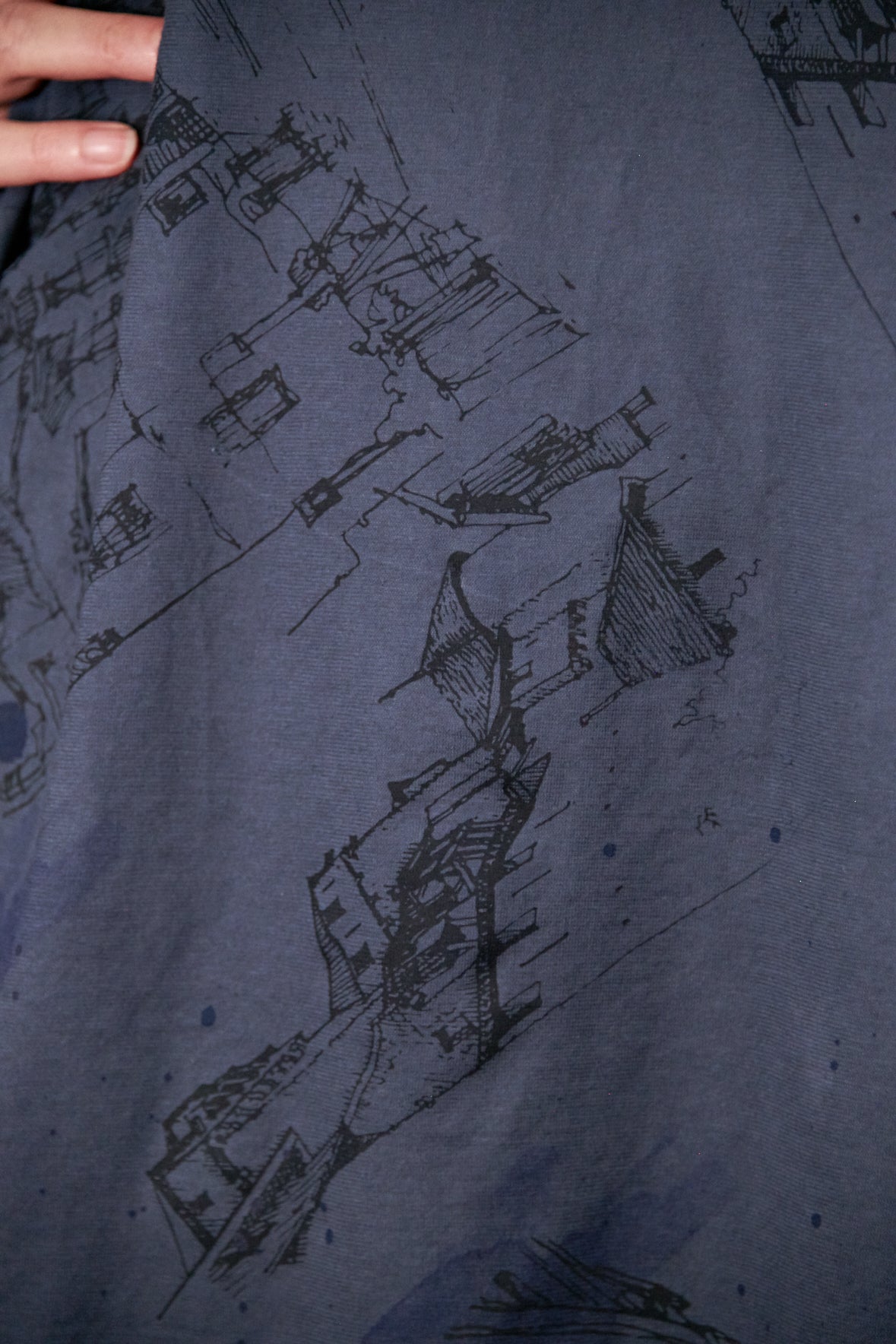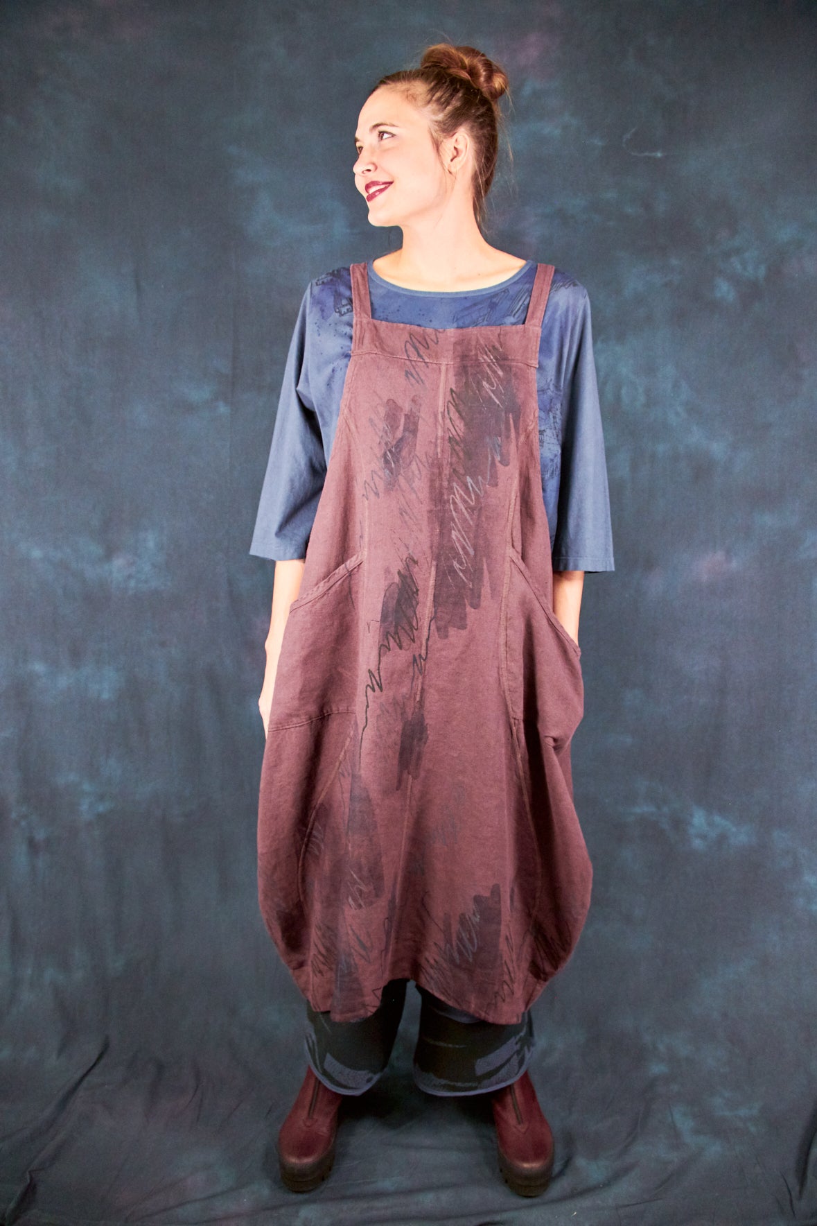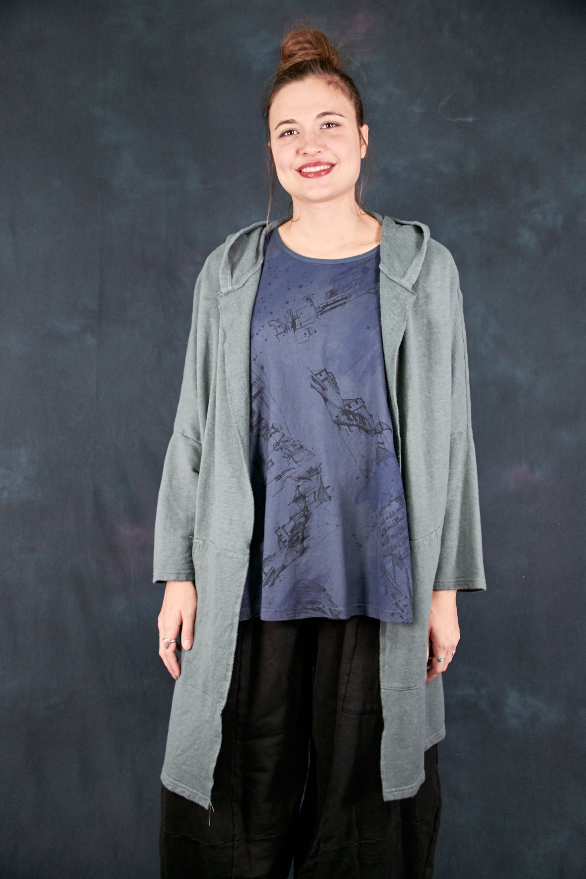 This A-line tee is always a favorite. Made in the USA from medium-weight organically grown cotton that is knit for us in the Carolinas. It has the characteristic A-line swing, wide at the bottom. A great piece because it can be layered or worn alone. Hand printing is always different and transforms this top into a singular artful garment.