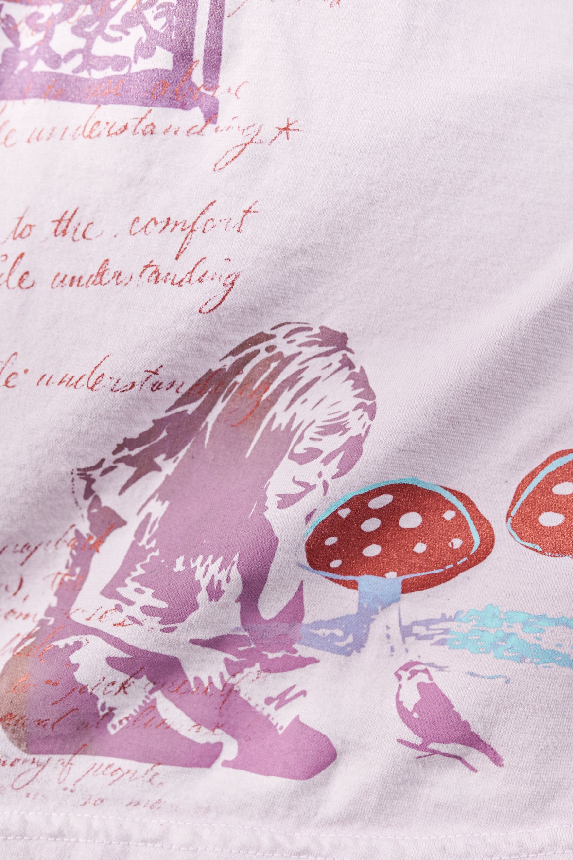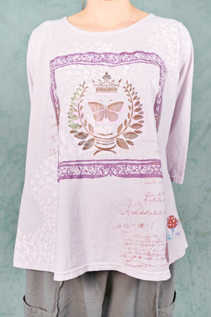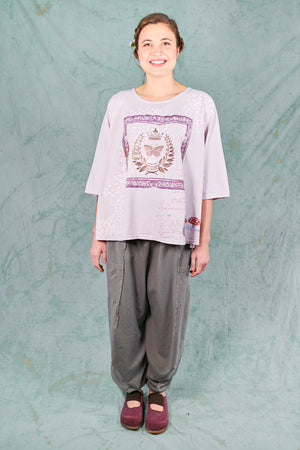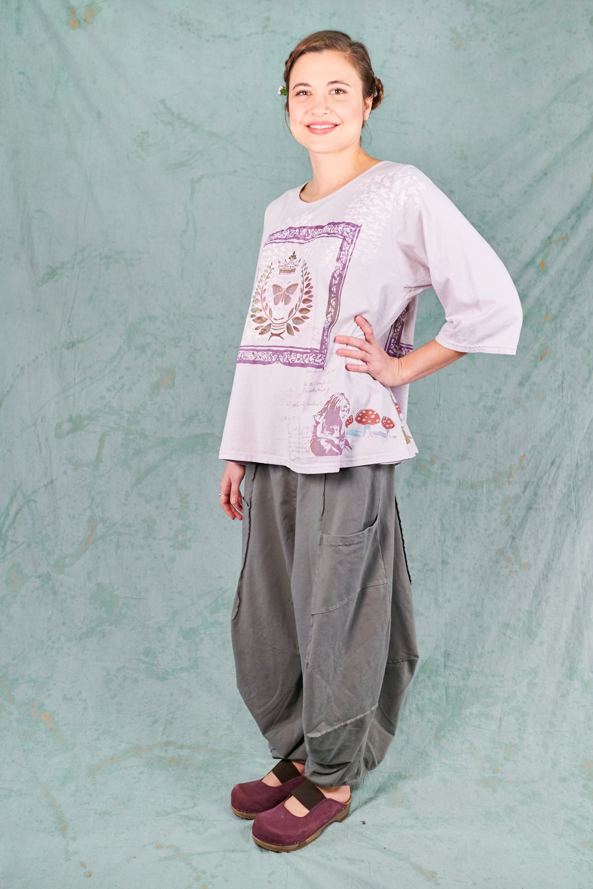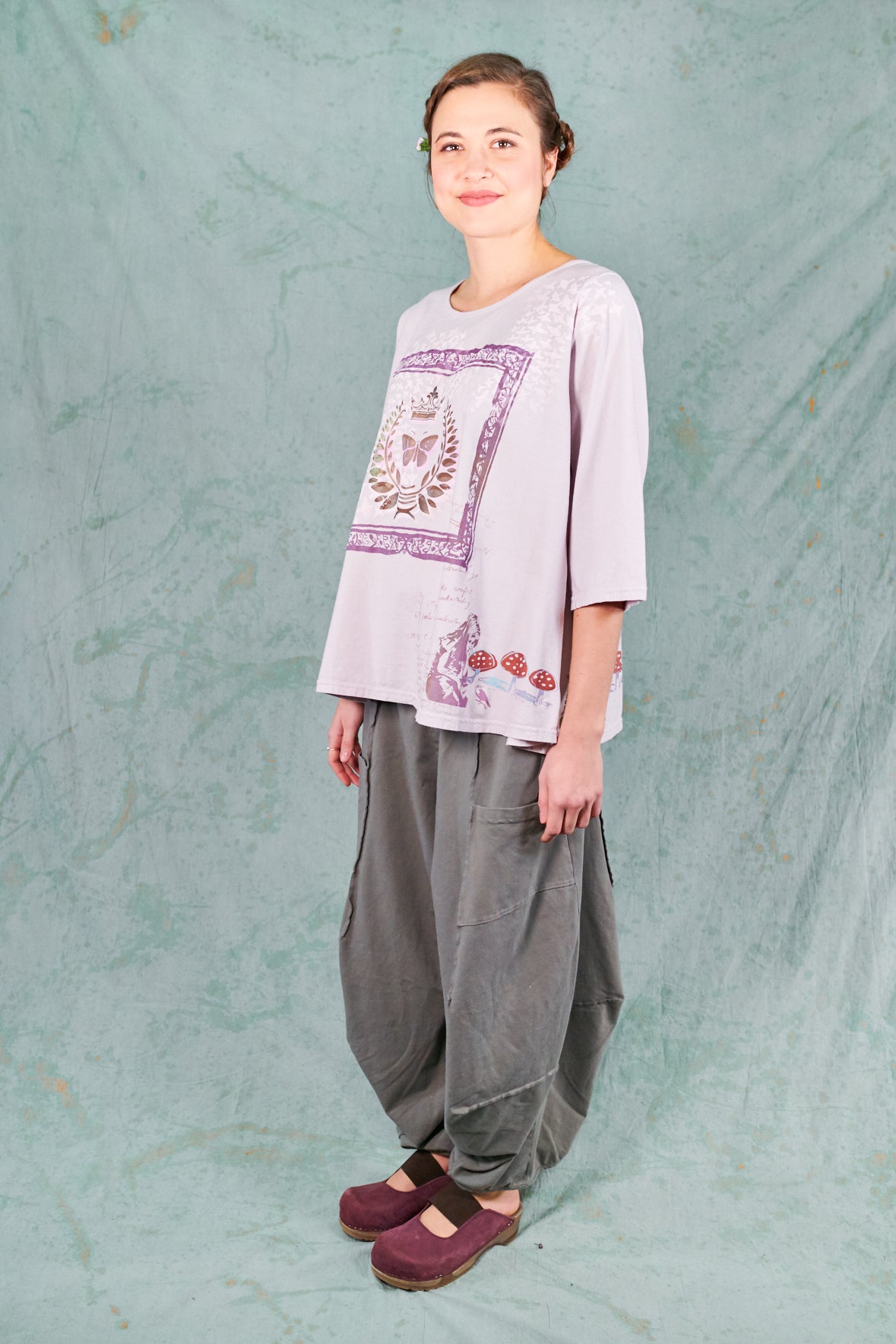 Your favorite café tee style with sleeves to just past the elbow. Lettuce-edged finish at hem and sleeves. Perfect lightweight organic cotton, somewhere in between tissue weight and our heavier weight studio tee fabric. This top has the characteristic A-line swing, wide at the bottom. A great piece because it can be layered or worn alone.