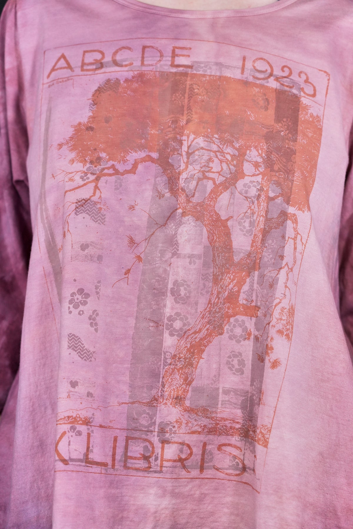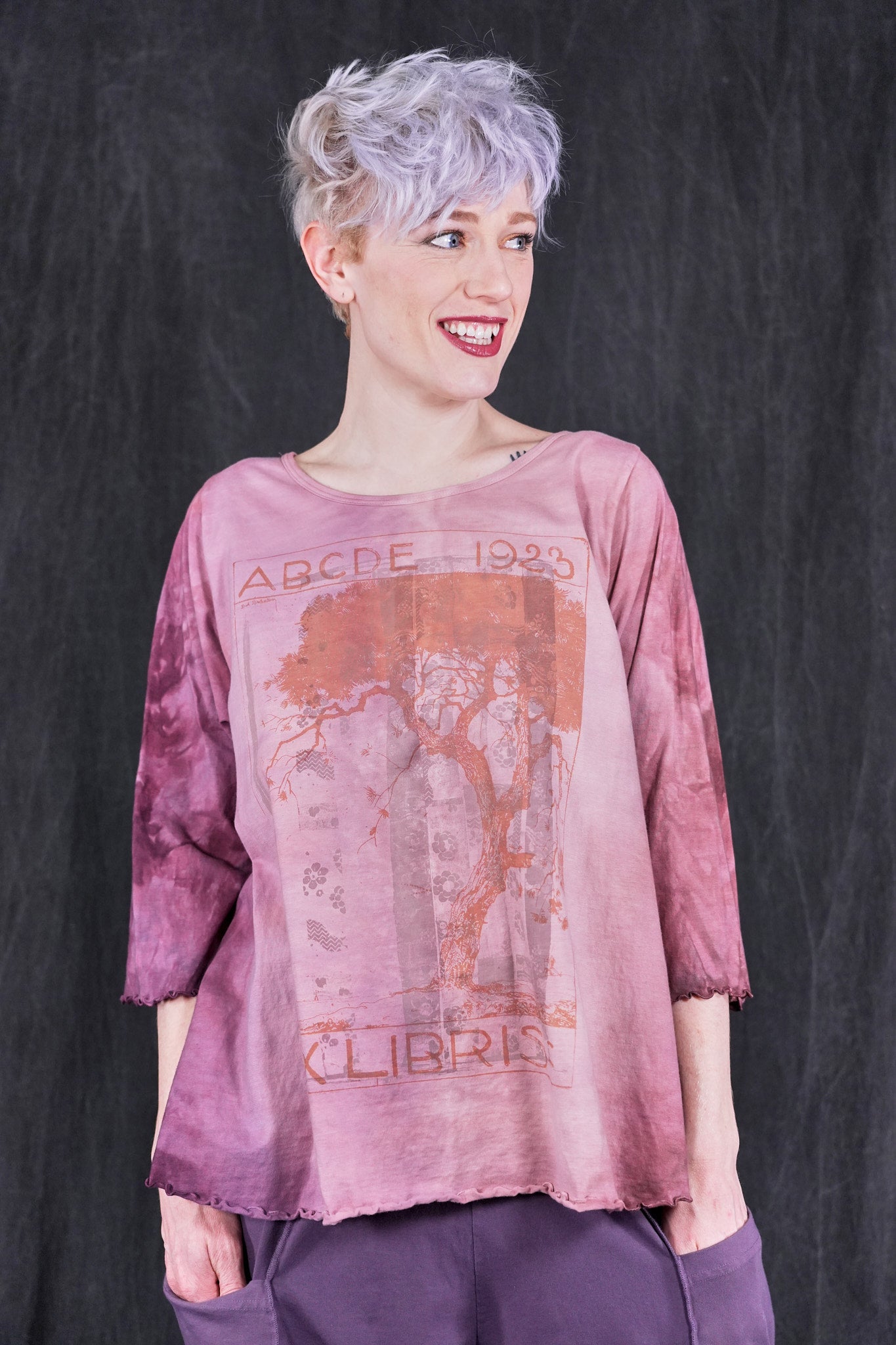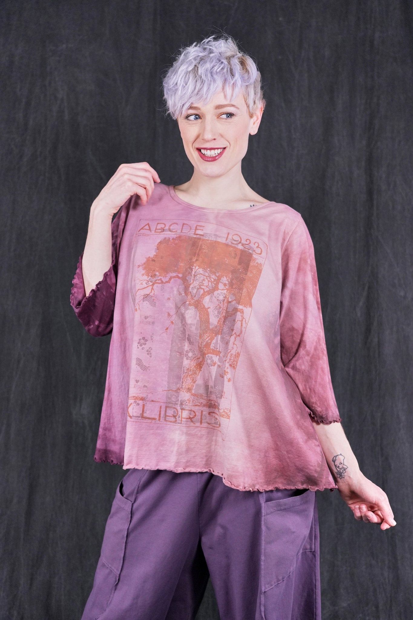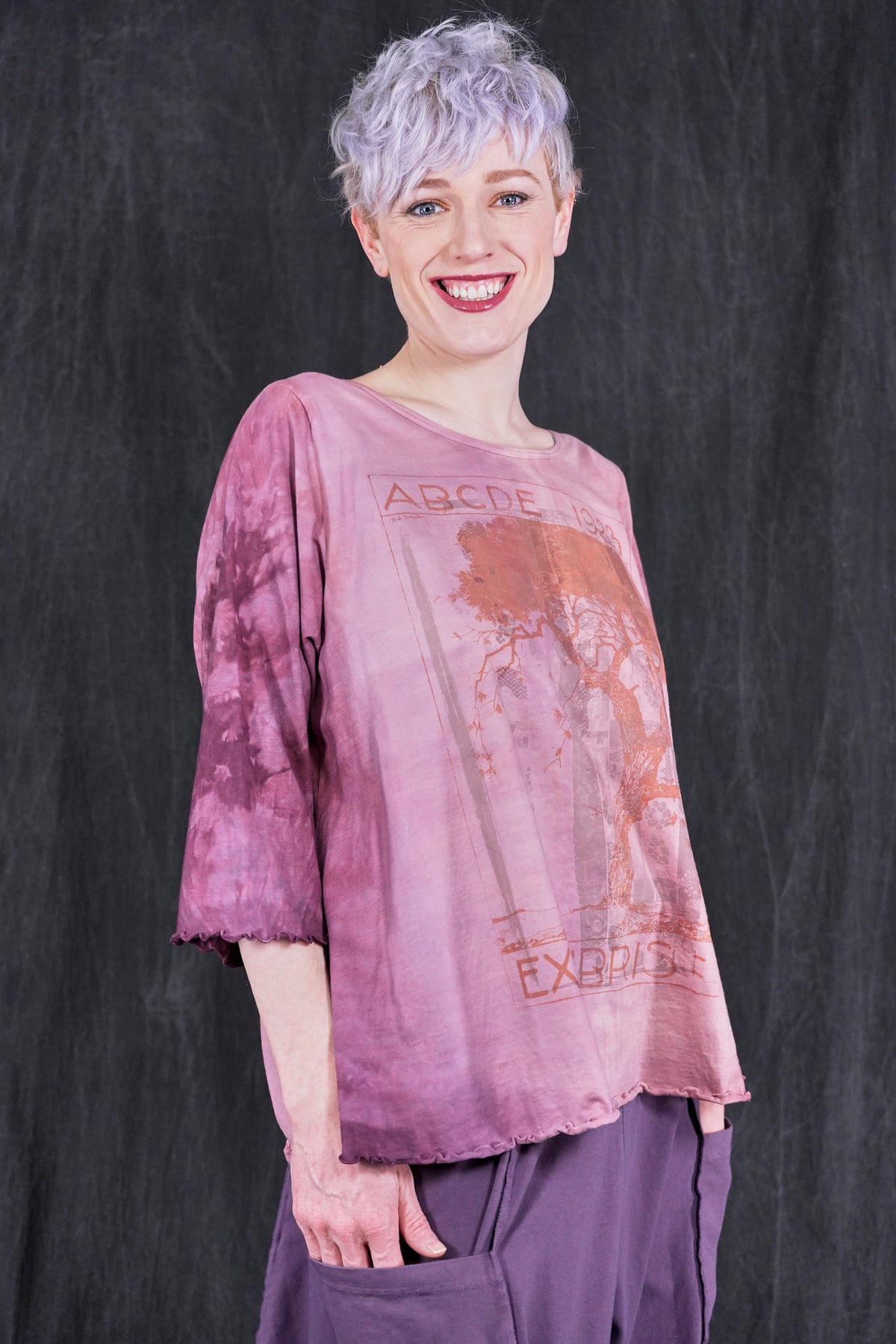 An exquisitely hand dyed organic cotton top with layering of antique textile and a magical Ex Libris Tree. Your favorite café tee style with lettuce-edged finish at hem and elbows. Perfect weight organic cotton, somewhere in between tissue and our heavier weight studio tee fabric. This longer top has the characteristic A-line swing, wide at the bottom. A great piece because it can be layered or worn alone.