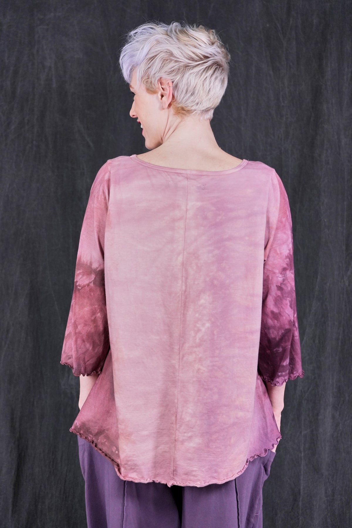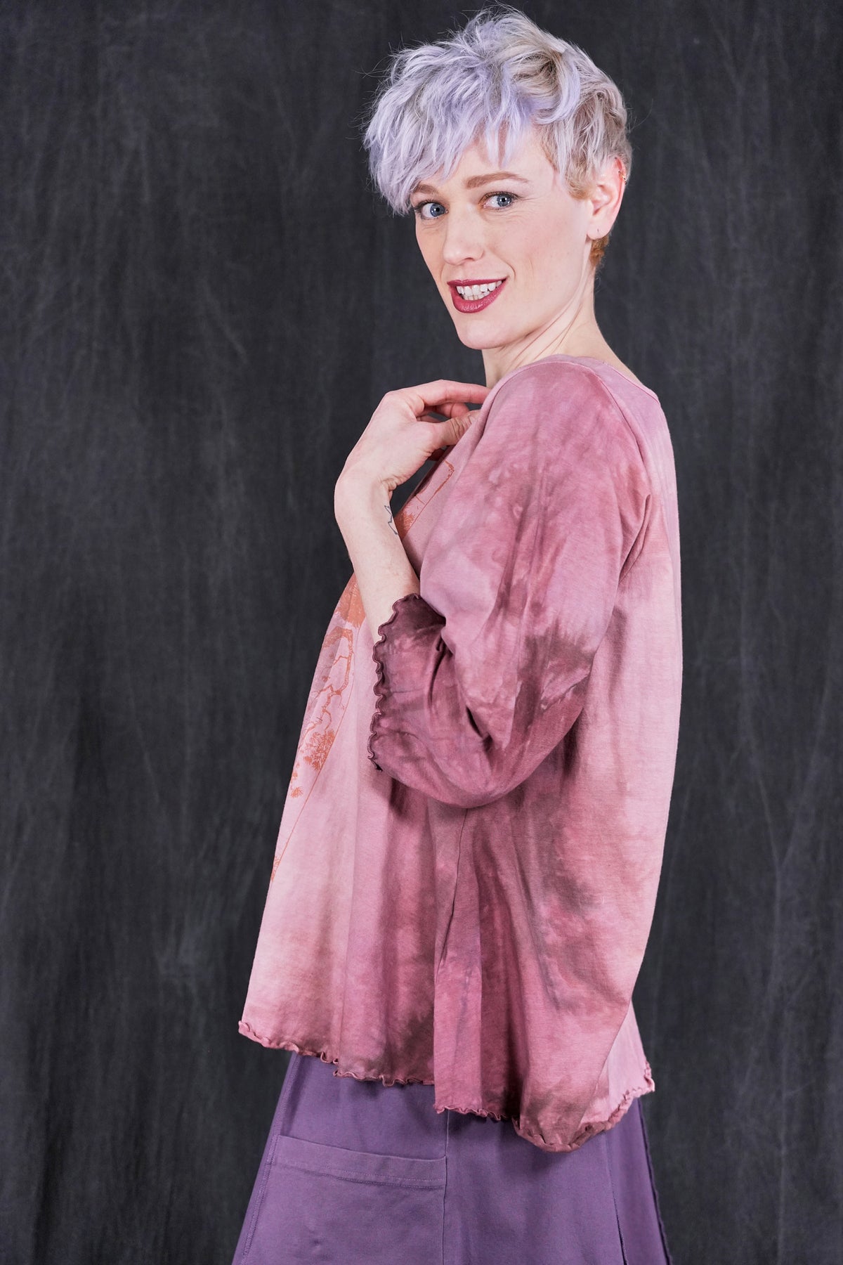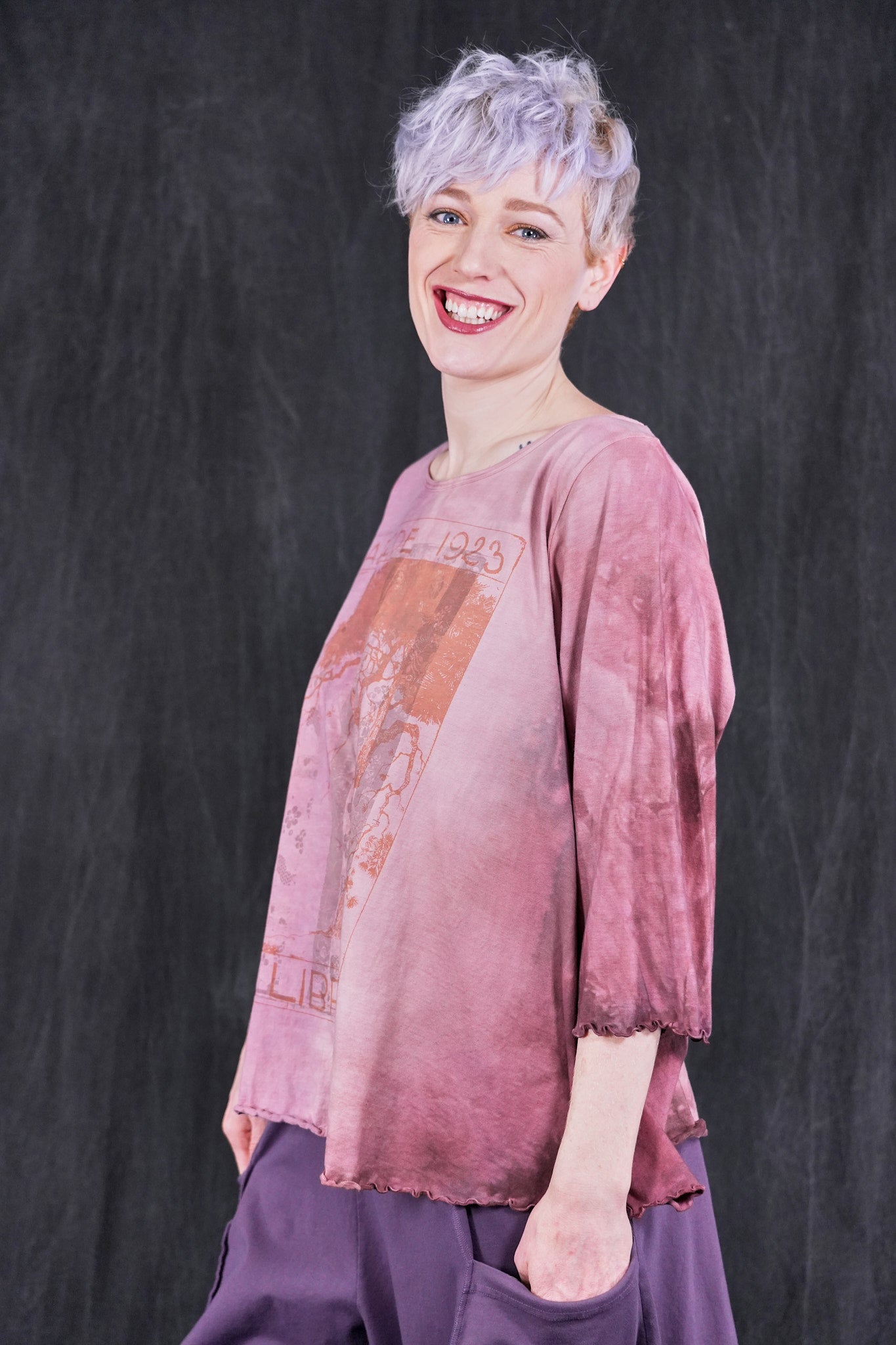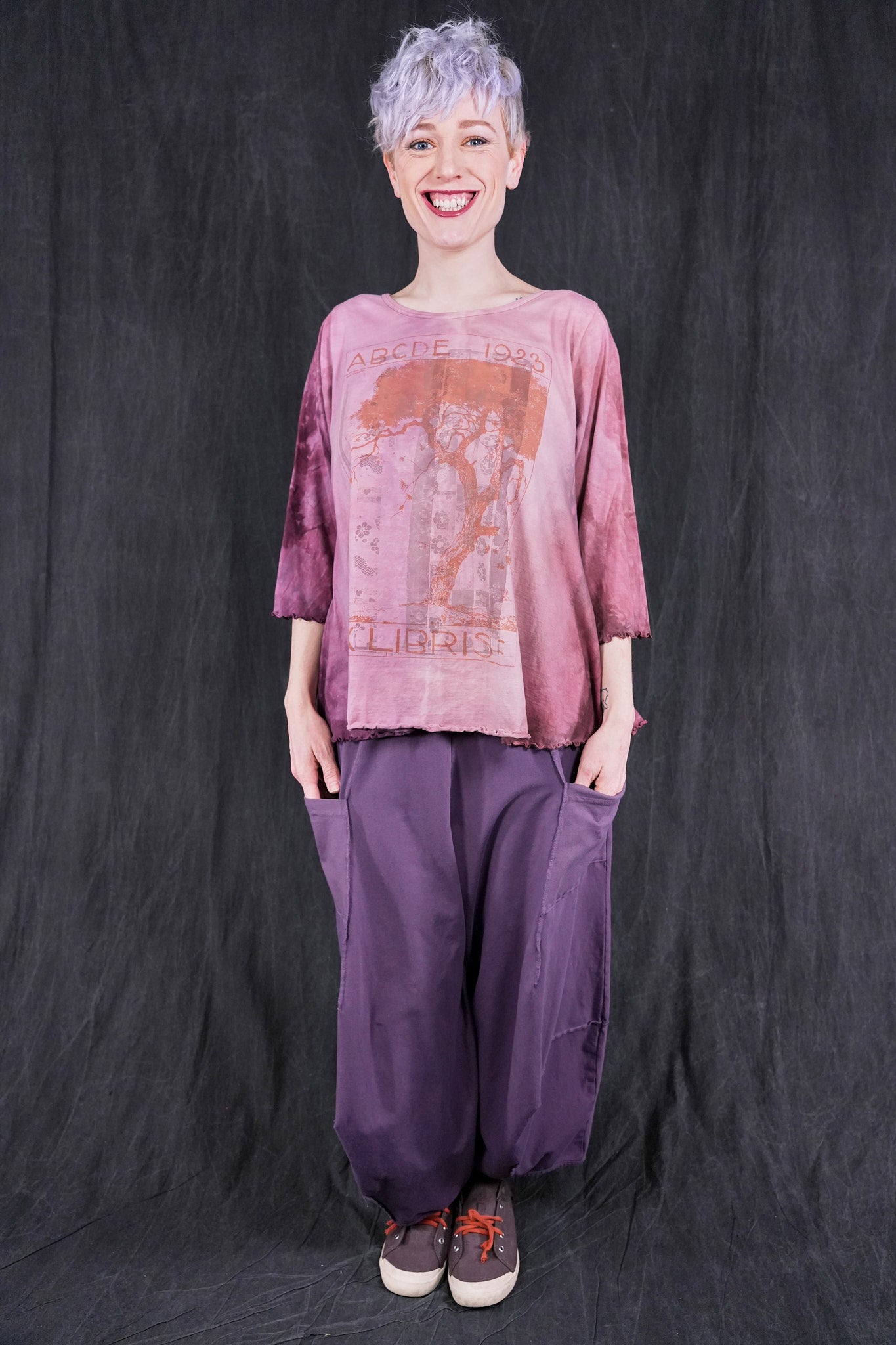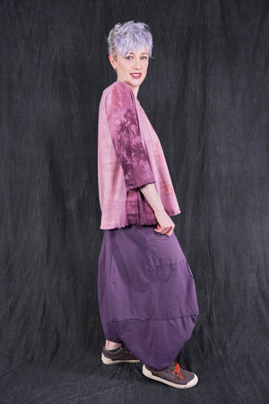 An exquisitely hand dyed organic cotton top with layering of antique textile and a magical Ex Libris Tree. Your favorite café tee style with lettuce-edged finish at hem and elbows. Perfect weight organic cotton, somewhere in between tissue and our heavier weight studio tee fabric. This longer top has the characteristic A-line swing, wide at the bottom. A great piece because it can be layered or worn alone.