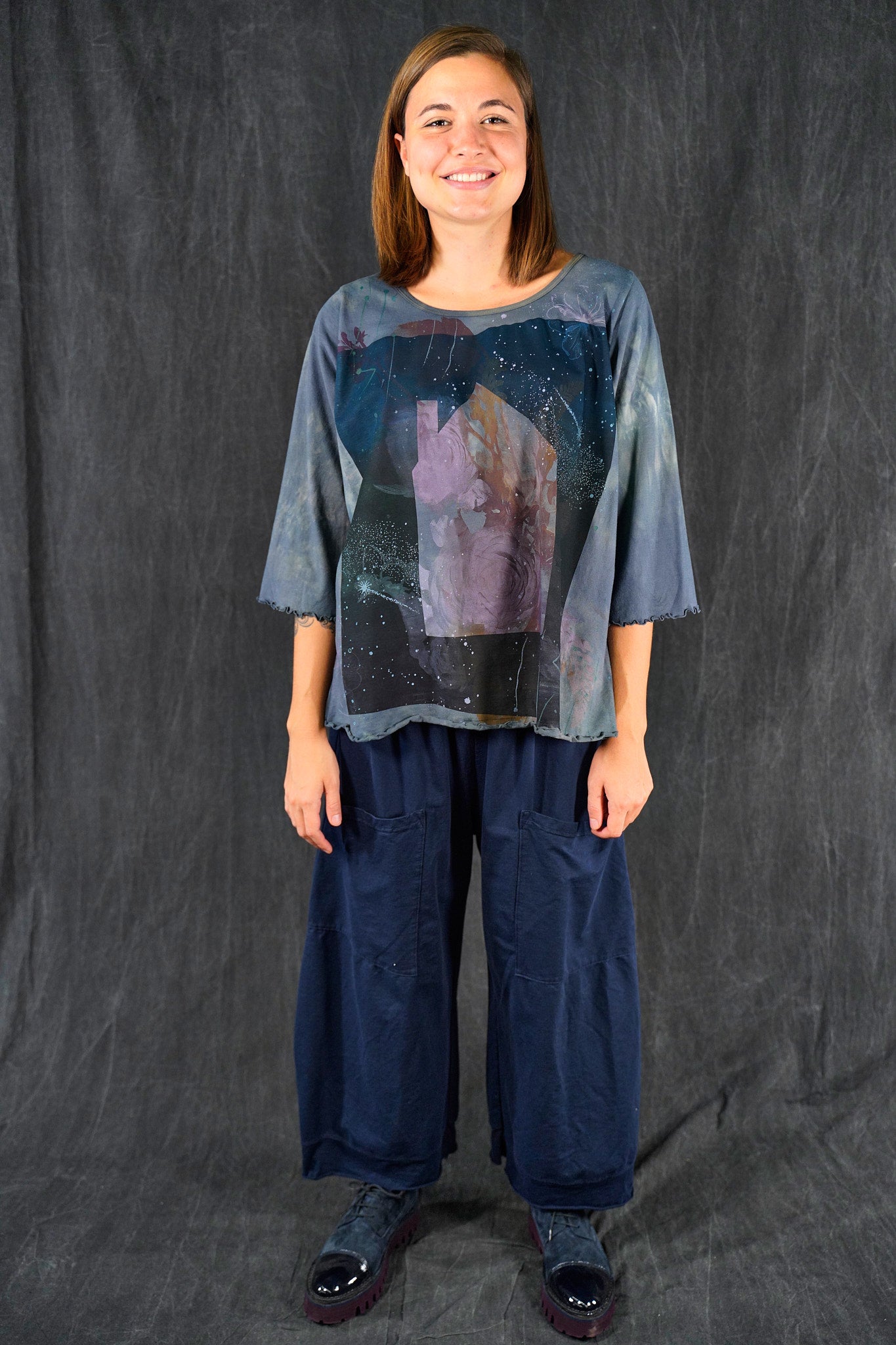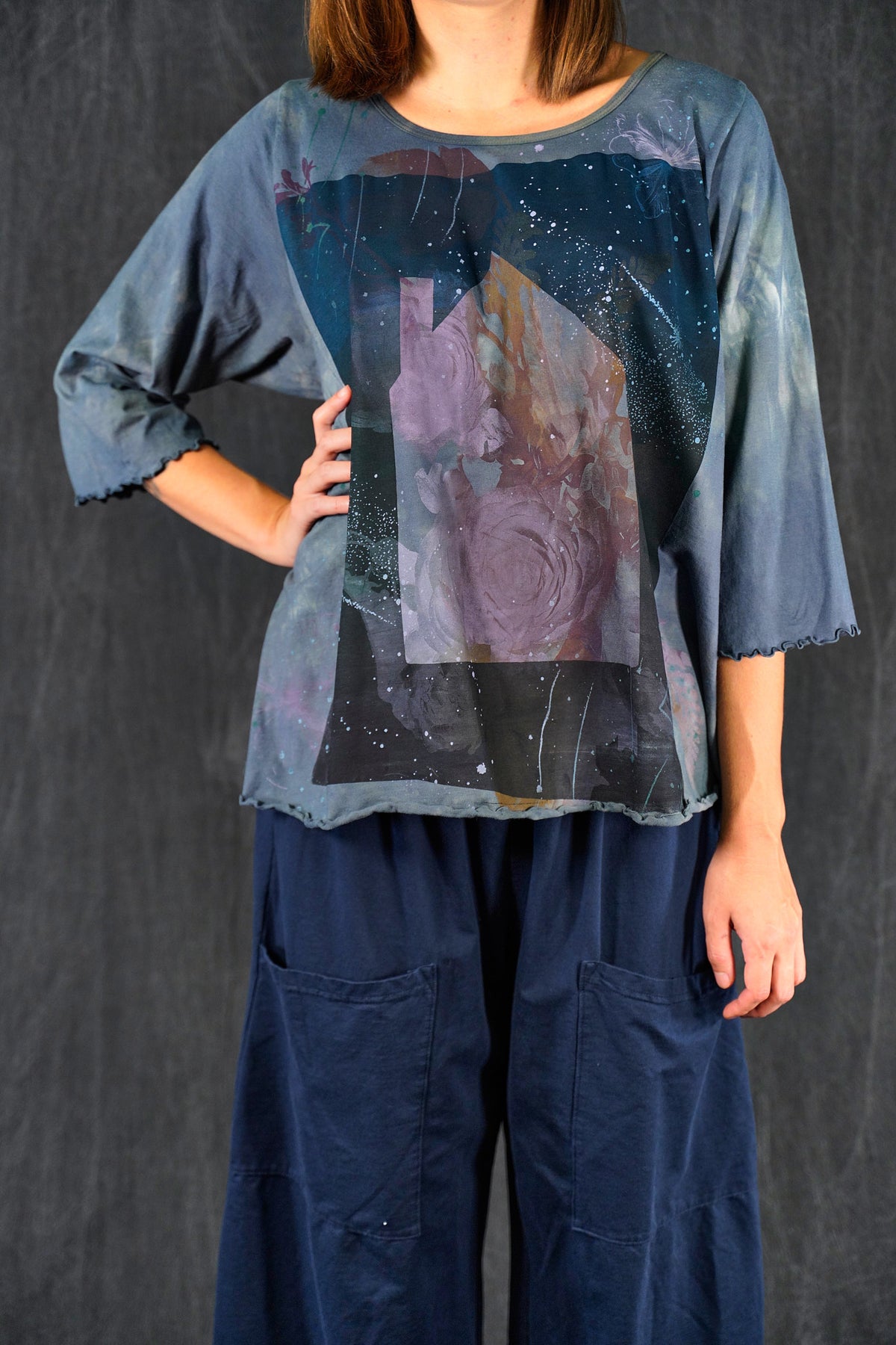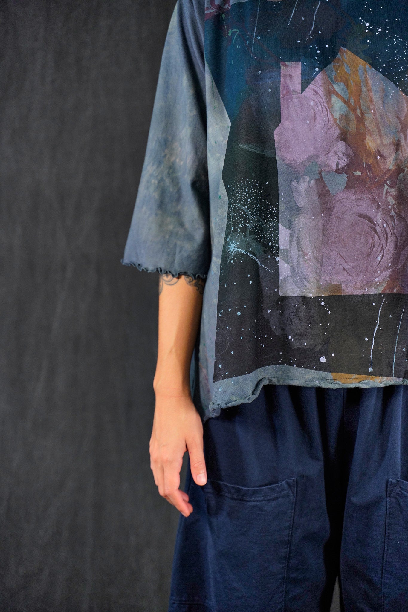 This cafe tee is HD- hand dyed and printed in our Blue Fish studio Our designs celebrates our fondness for art with textured and colorful accents in the imagery.