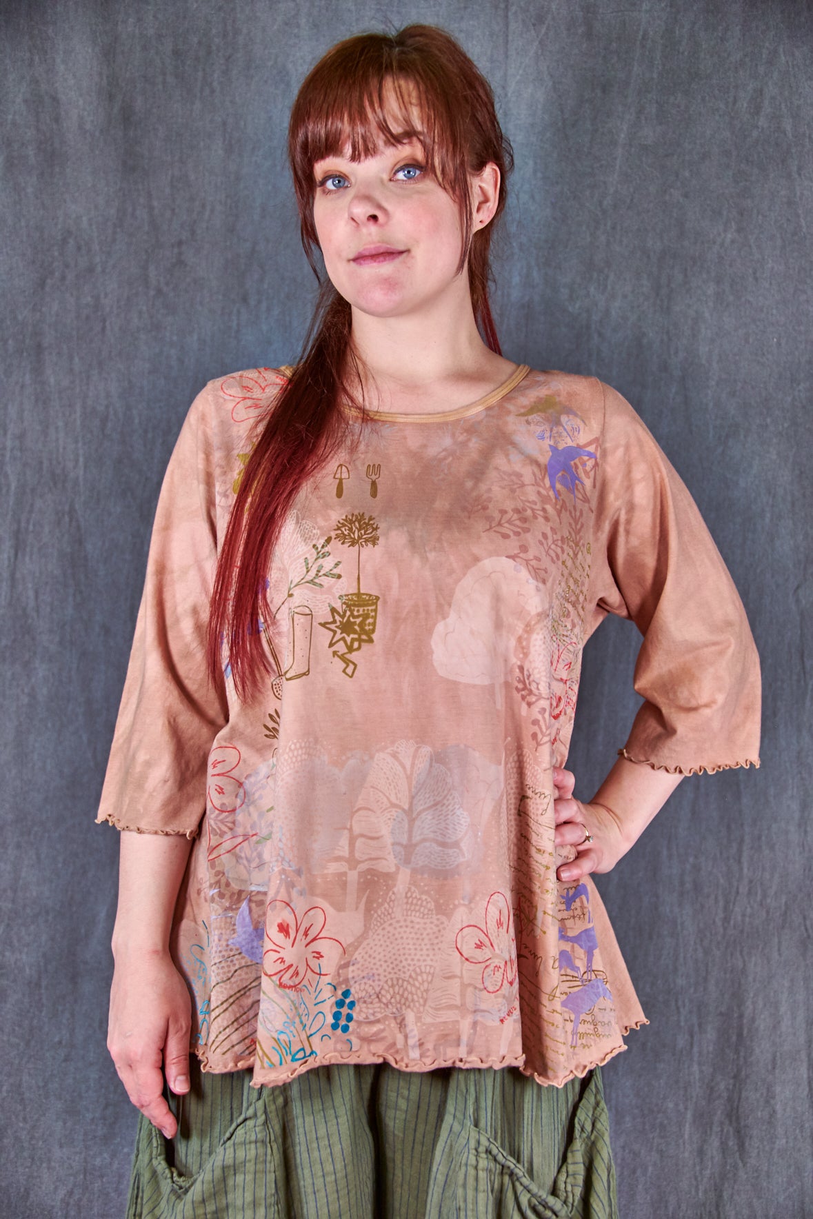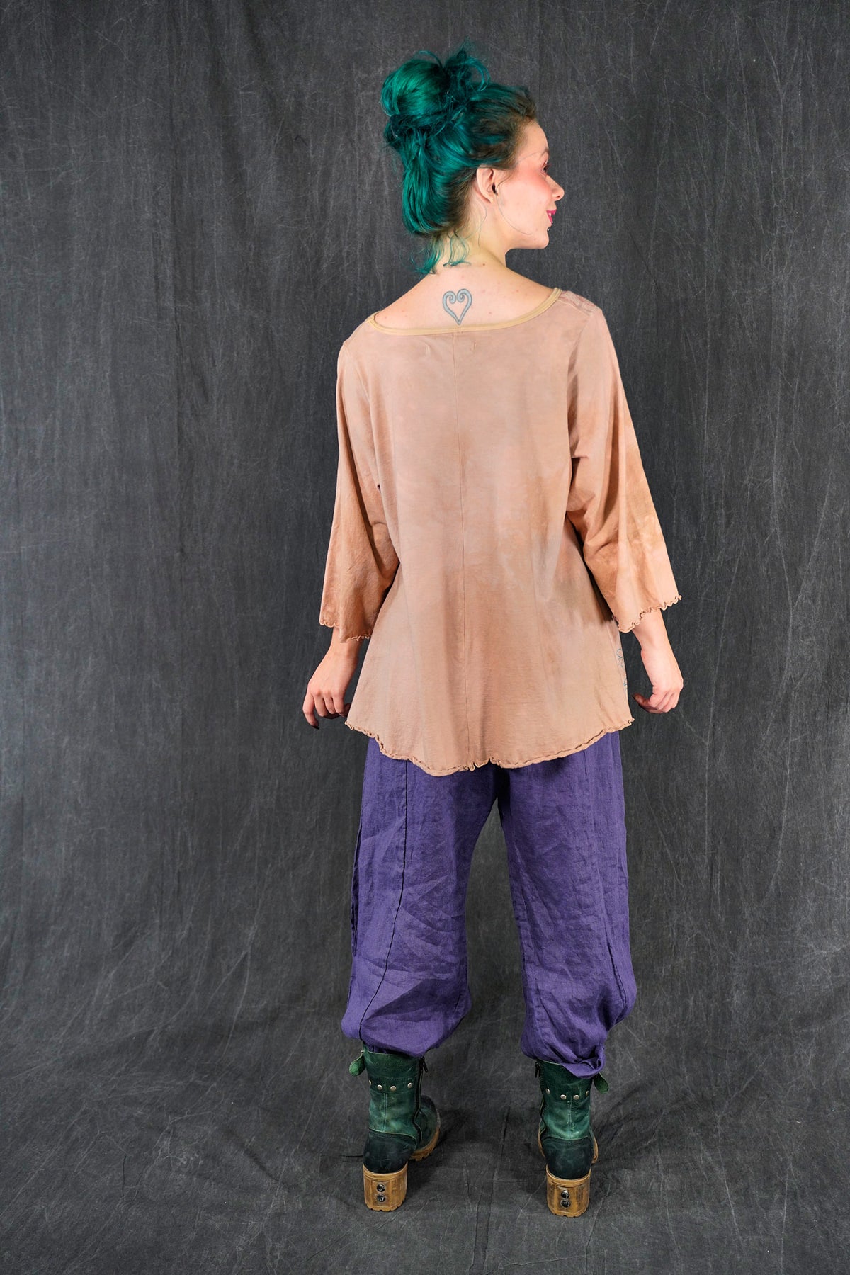 Your favorite café tee style with lettuce-edged finish at hem and elbows. Perfect weight organic cotton, somewhere in between tissue and our heavier weight studio tee fabric. This longer top has the characteristic A-line swing, wide at the bottom. A great piece because it can be layered or worn alone.