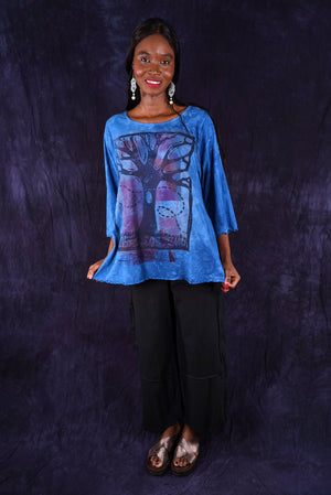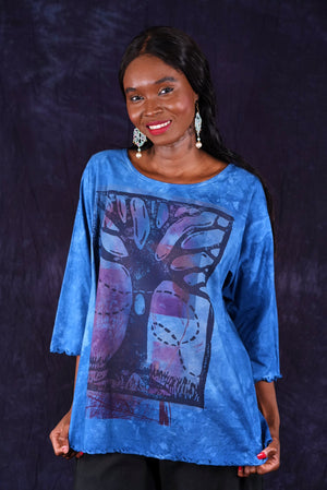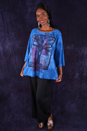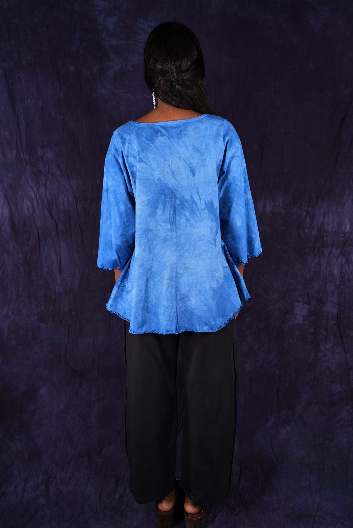hand dyed and printed. Your favorite café tee style with lettuce-edged finish at hem and elbows. Perfect weight organic cotton, somewhere in between tissue and our heavier weight studio tee fabric. This longer top has the characteristic A-line swing, wide at the bottom. A great piece because it can be layered or worn alone.