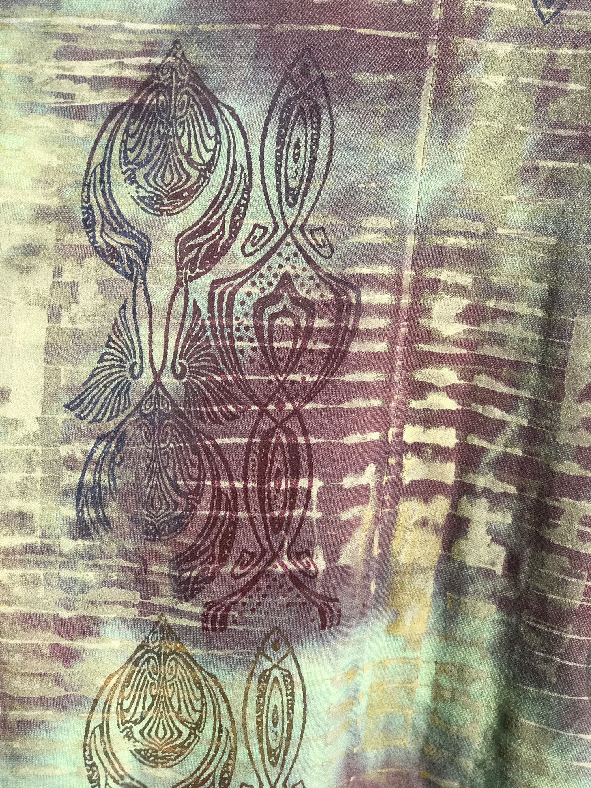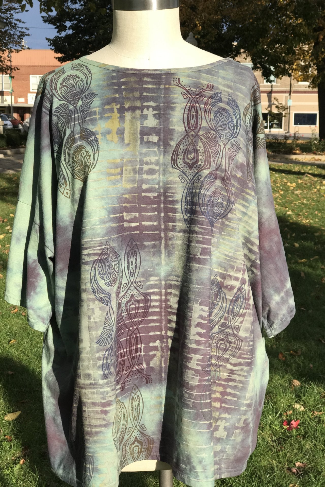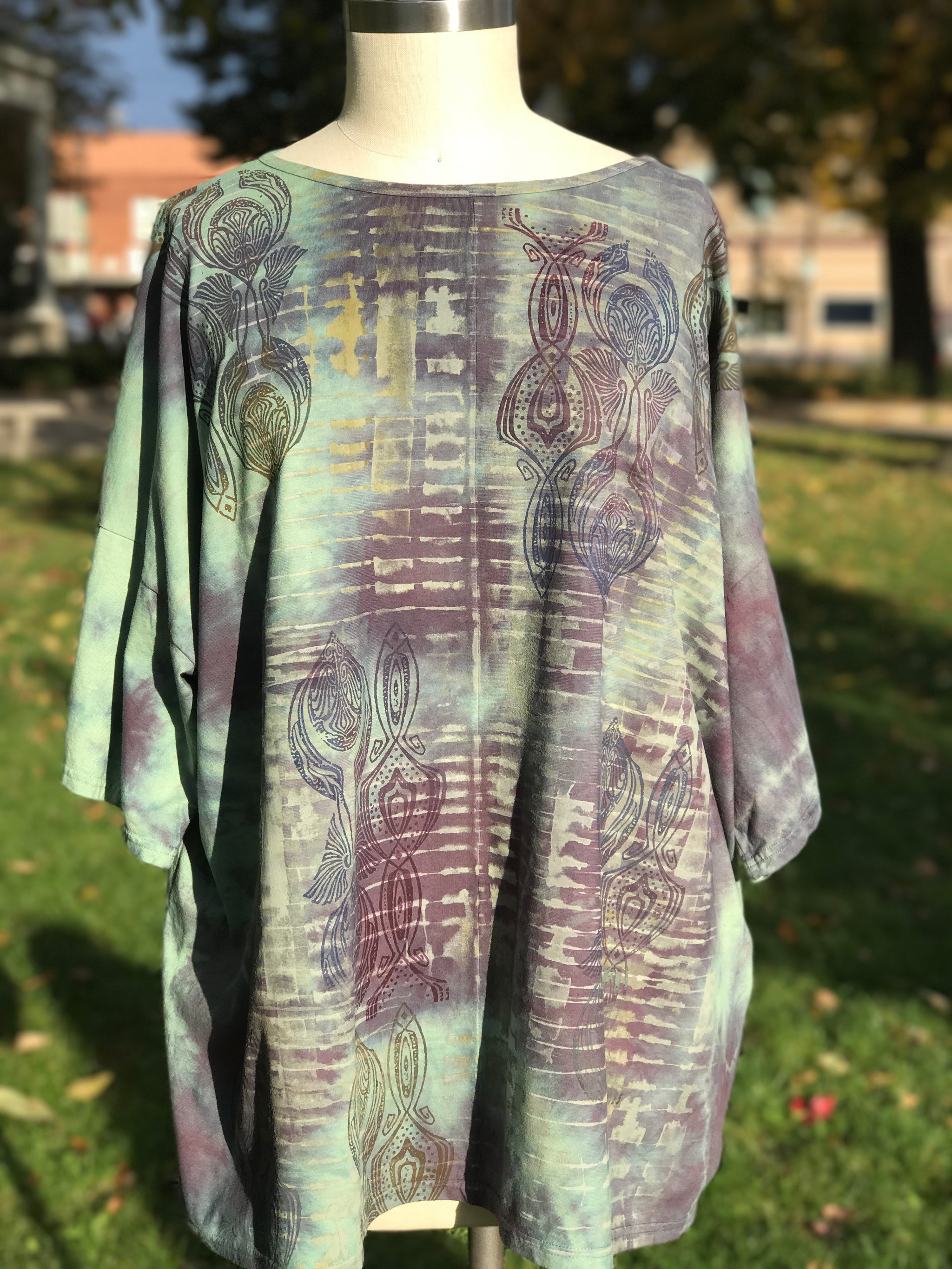 Perfect one-size soft, organic cotton tunic to wear now and into autumn...New colorful & magical designs in color drenched shades that we have hand printed for maximum effect. Limited quantities. Double hand dyed and layered multi-tonal printing. Very oversized. Perfect for lounging.