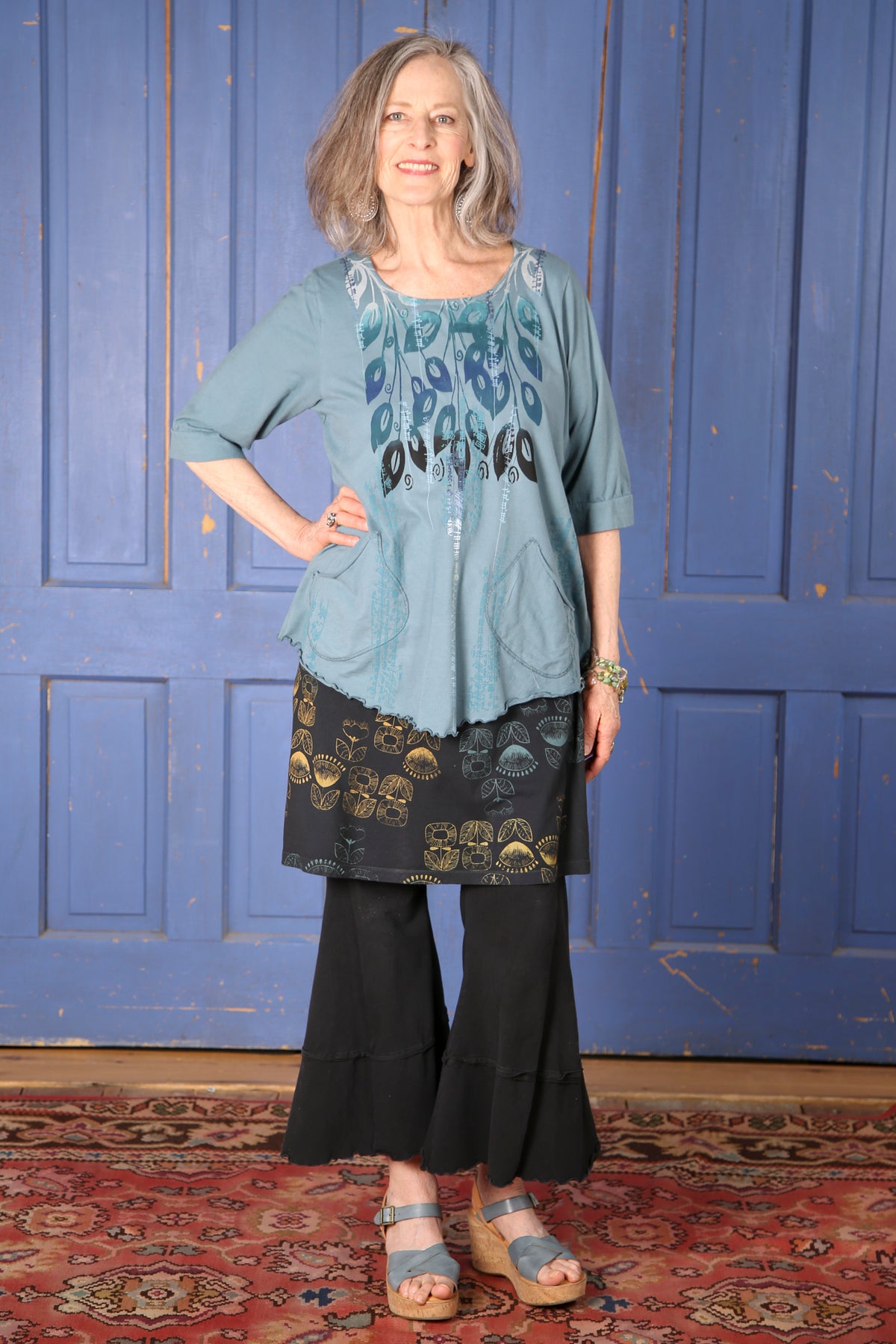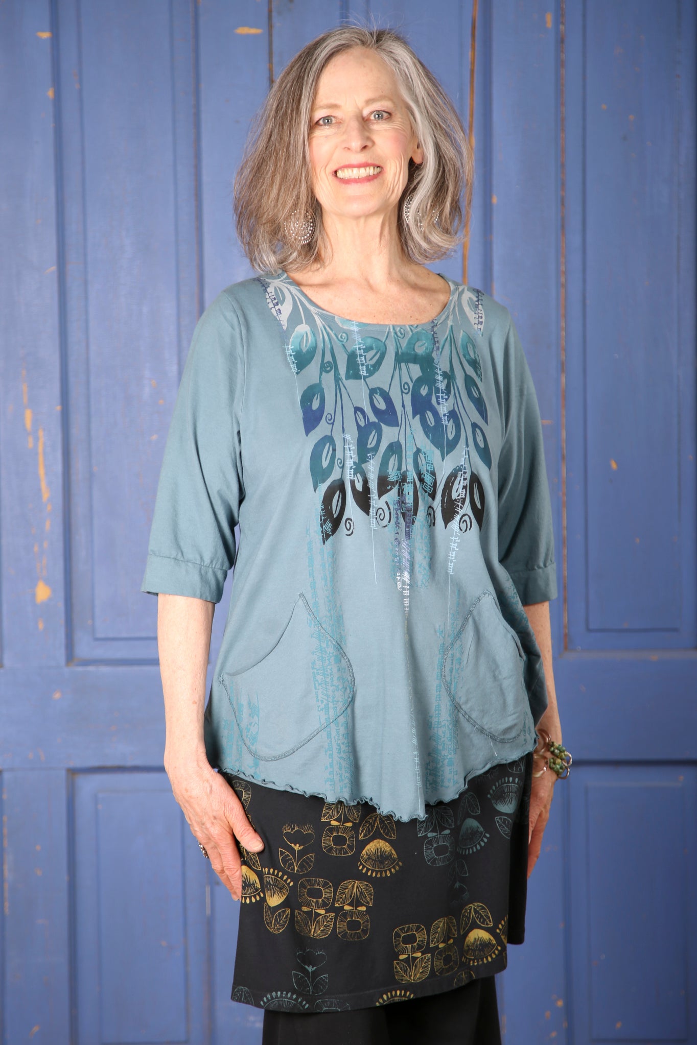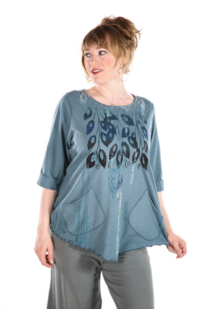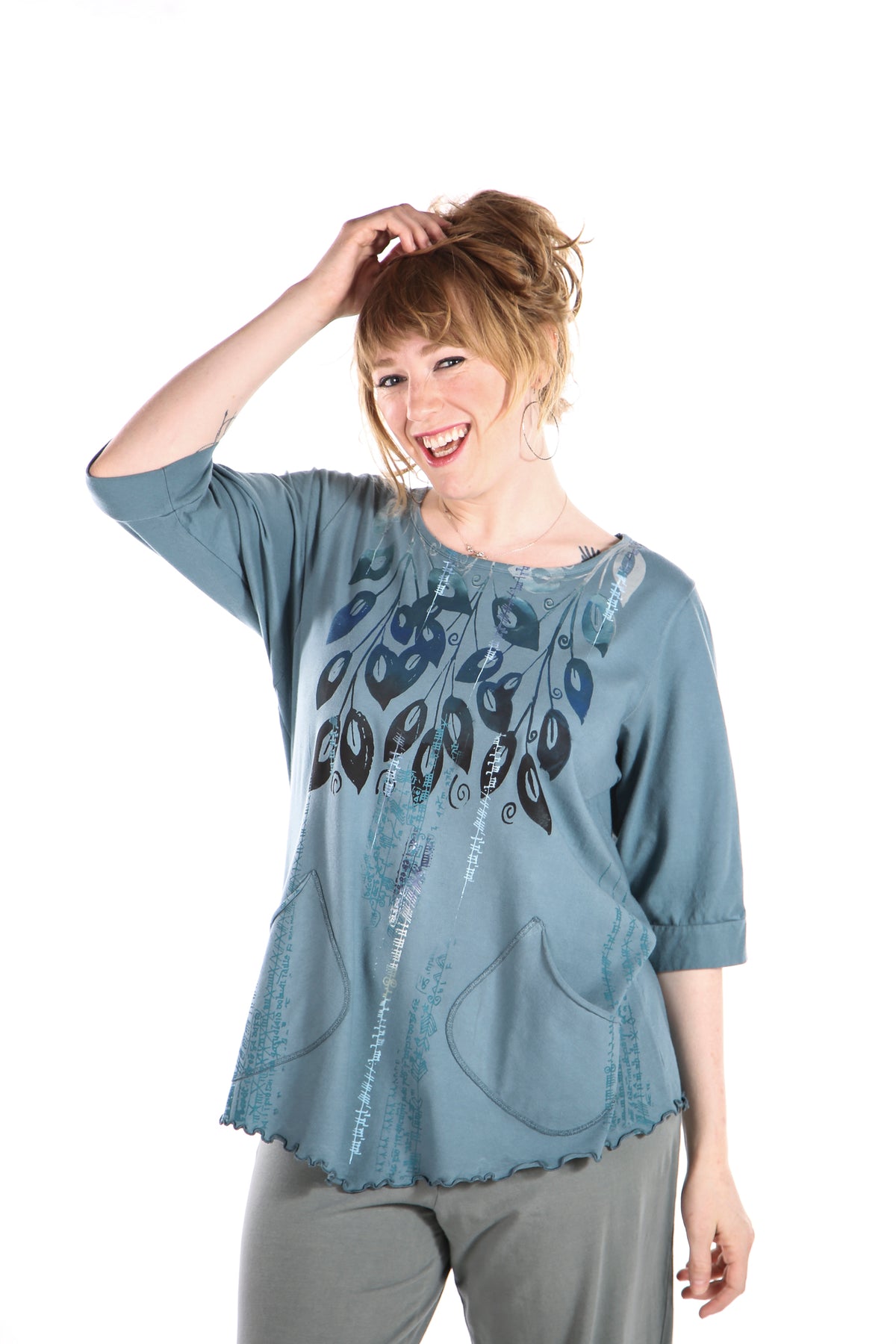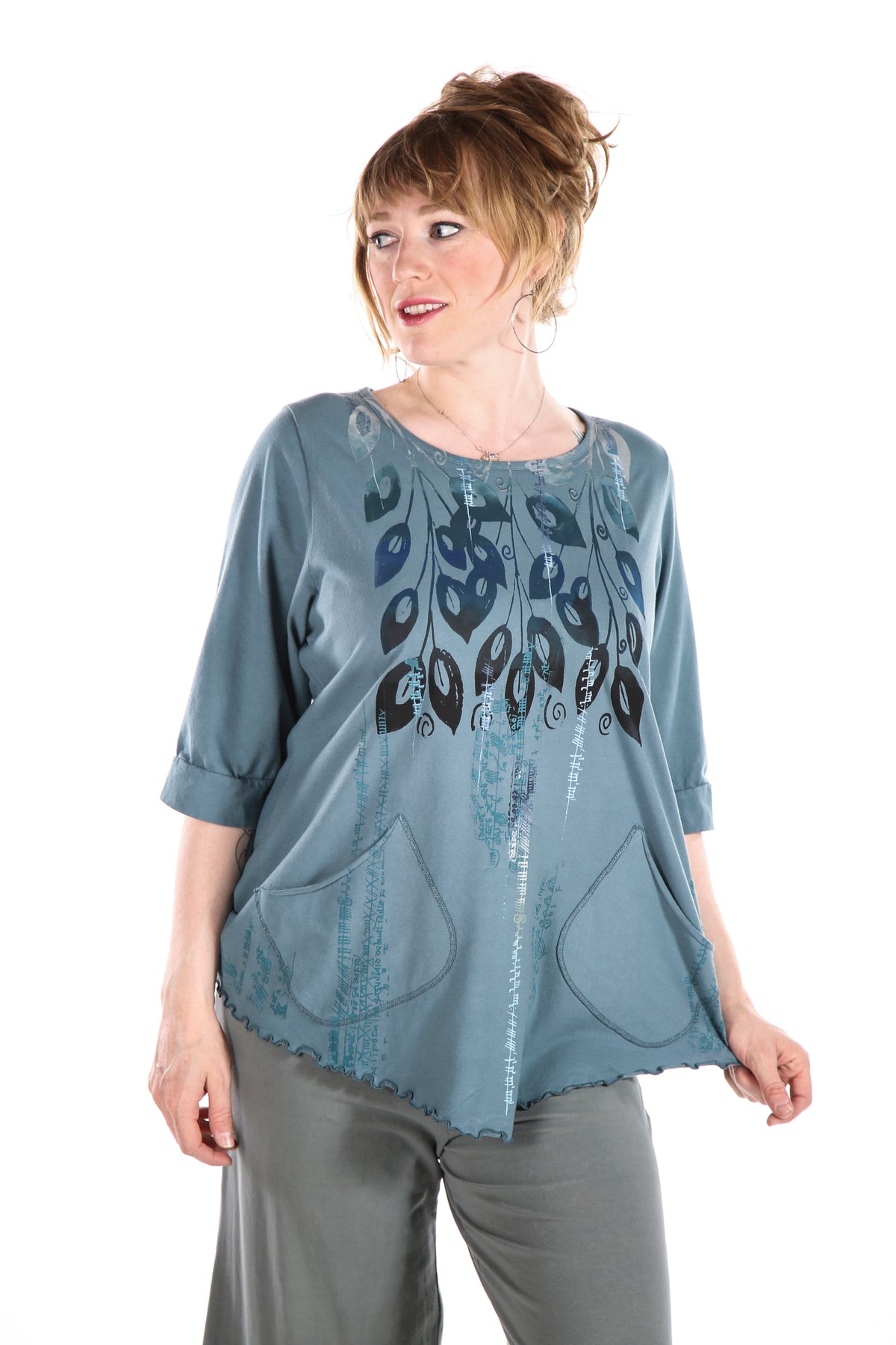 This sweet top features a scooped hem, 2 pockets, and gentle shaping.