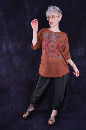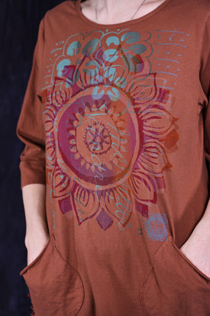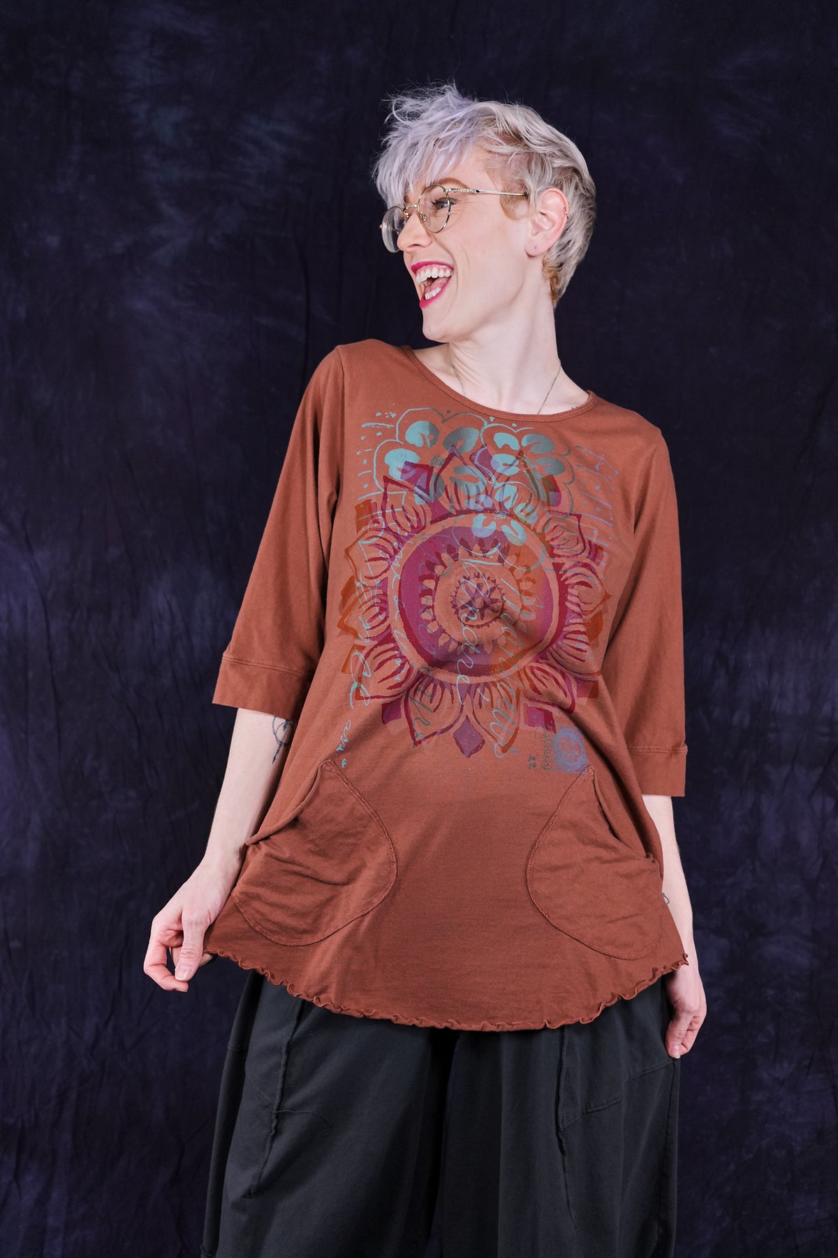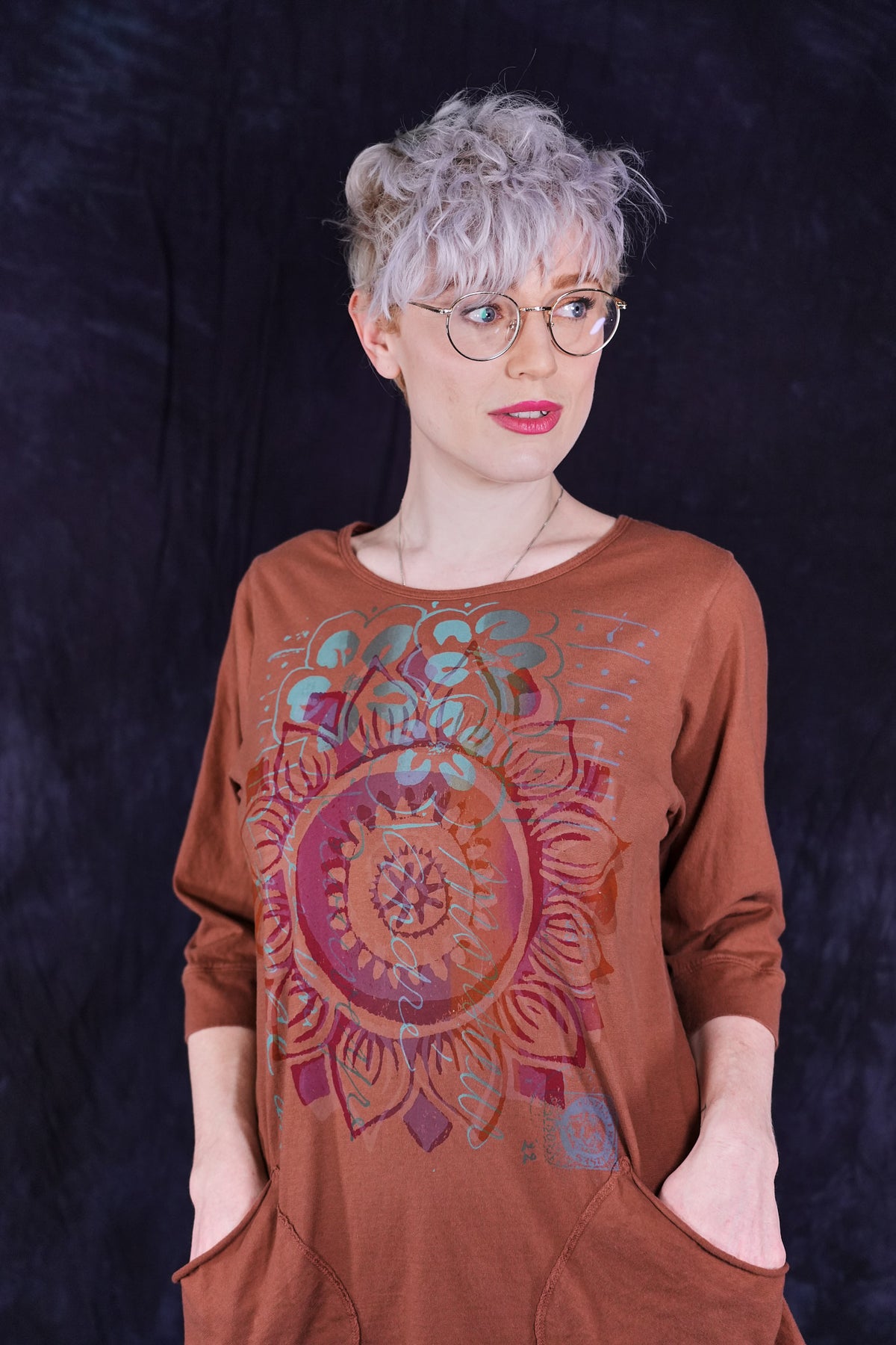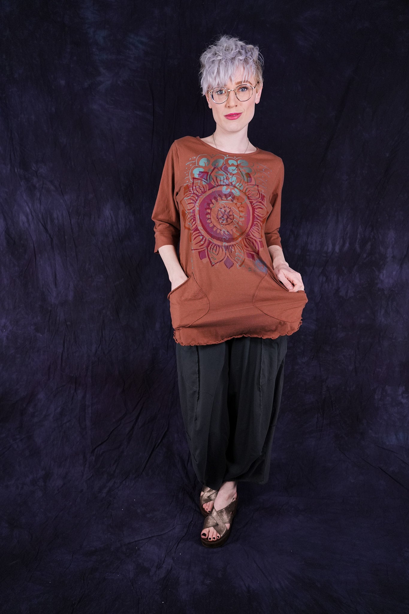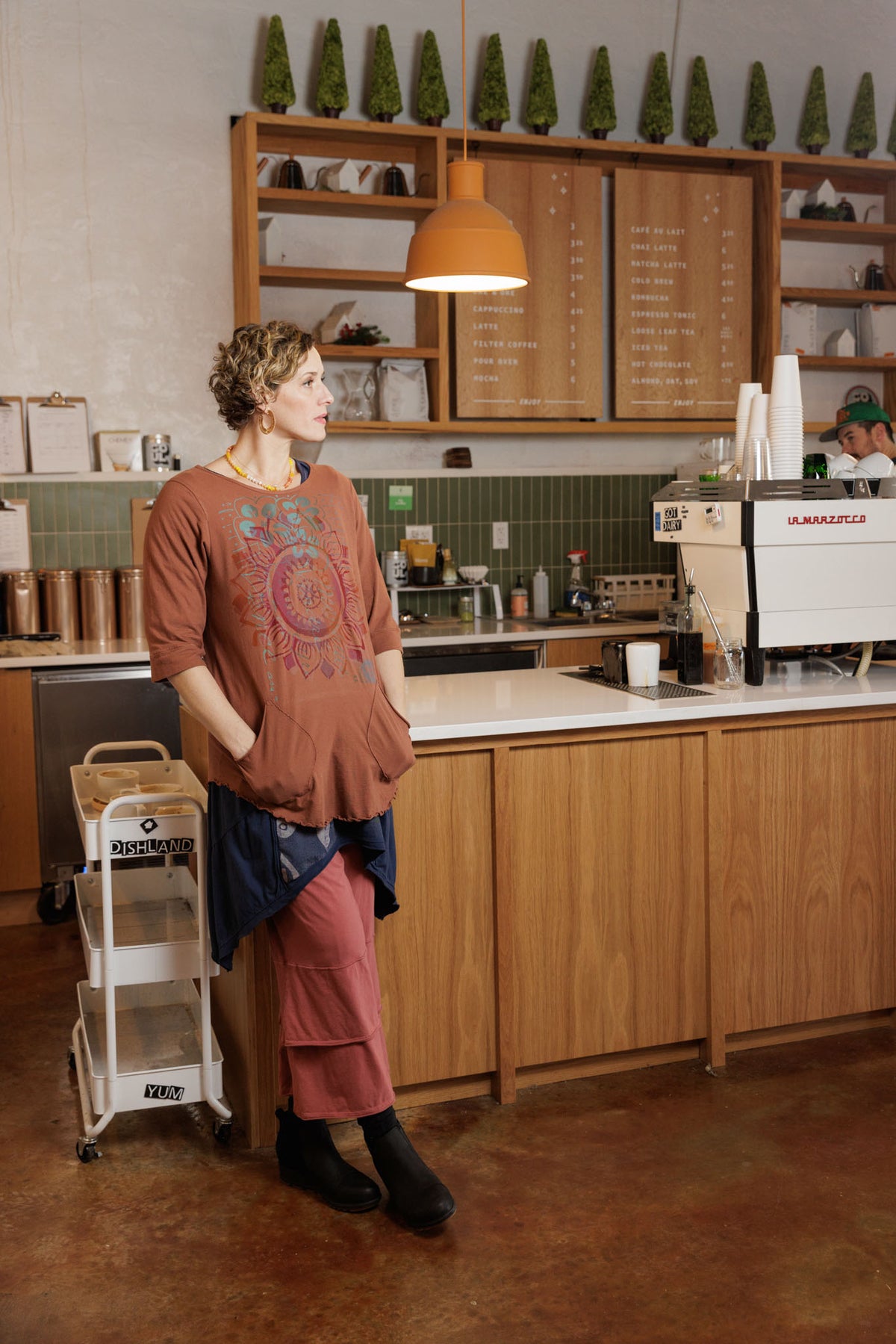 We adore this sweet top: It is the perfect blend of elegance, art, & practicality. Imagine wearing this to lunch at a cafe, on a stroll through town on a picturesque spring day, or even gardening or painting (hello, pockets!). Printing on the front from our Iowa studio is so dreamy that you’ll want to wear this every day.