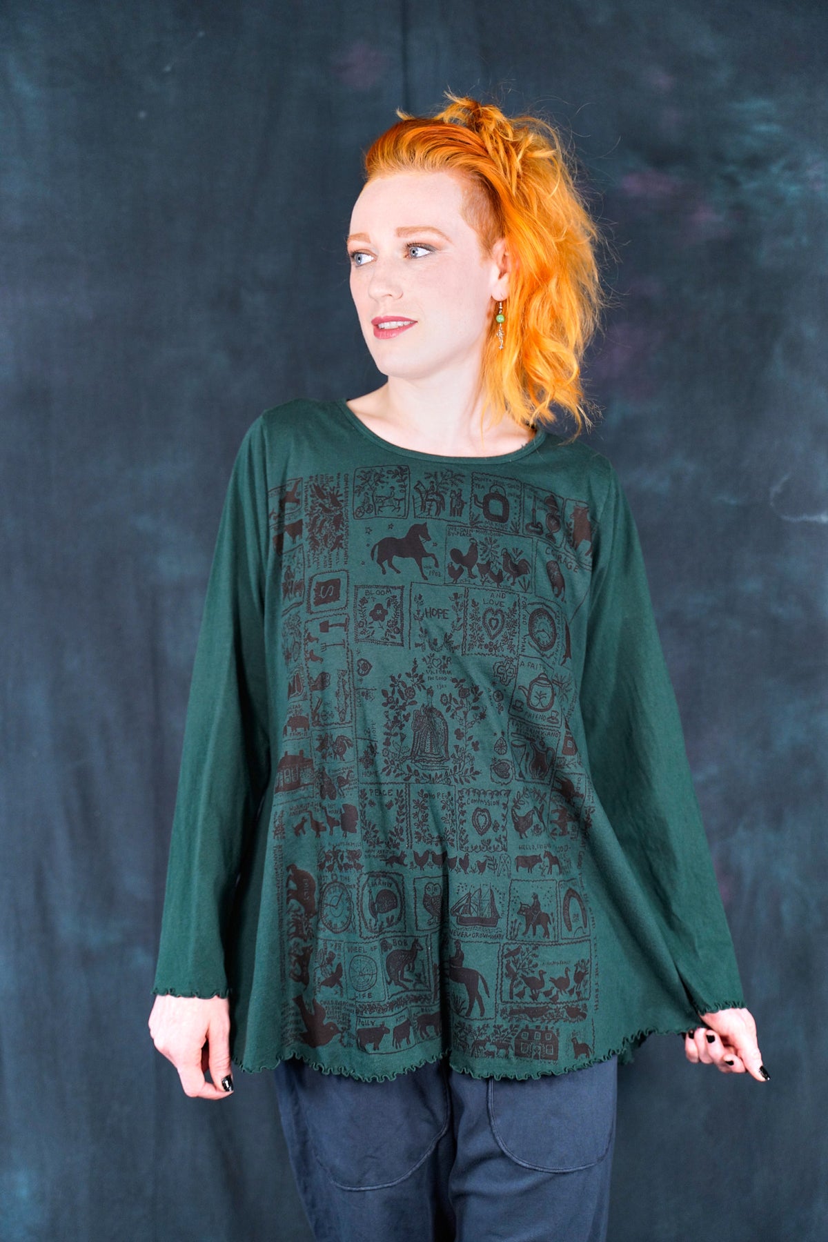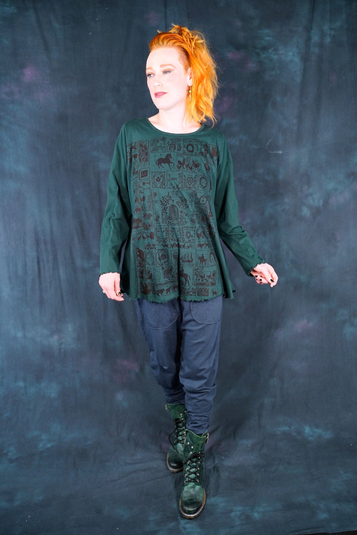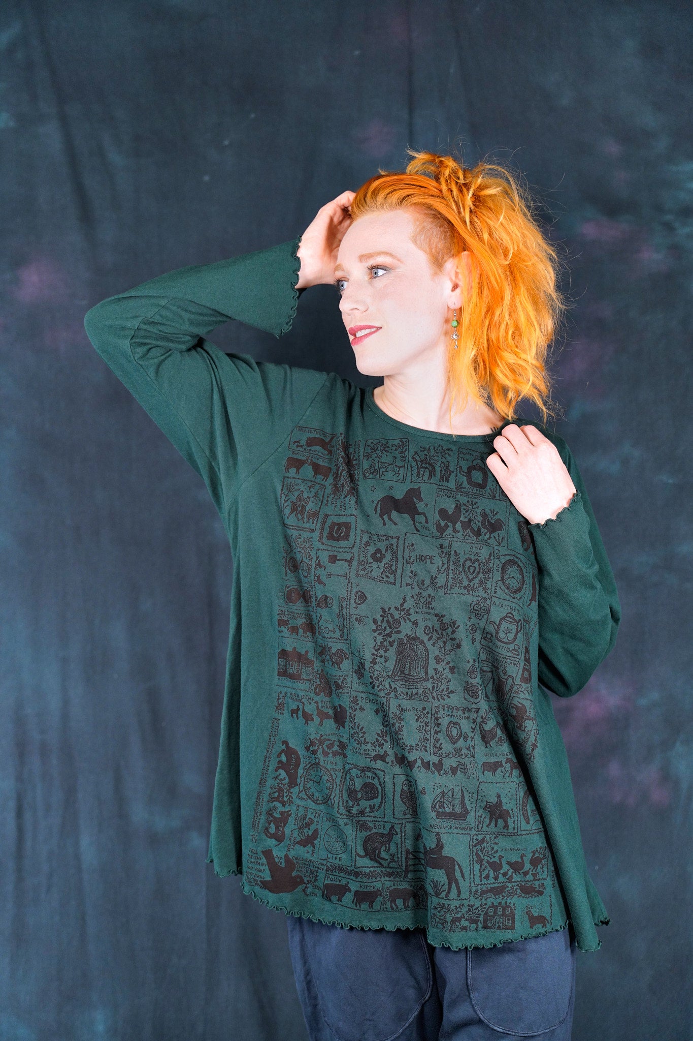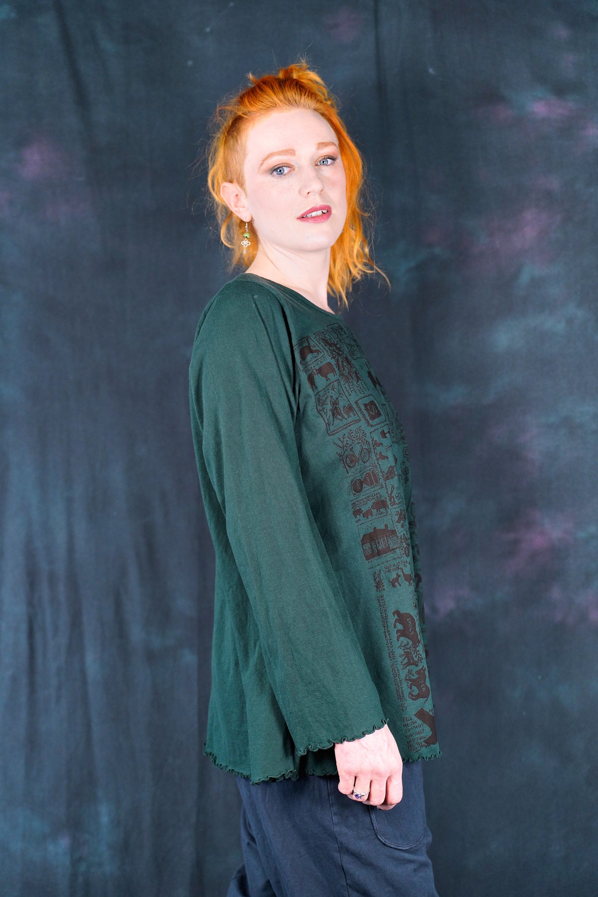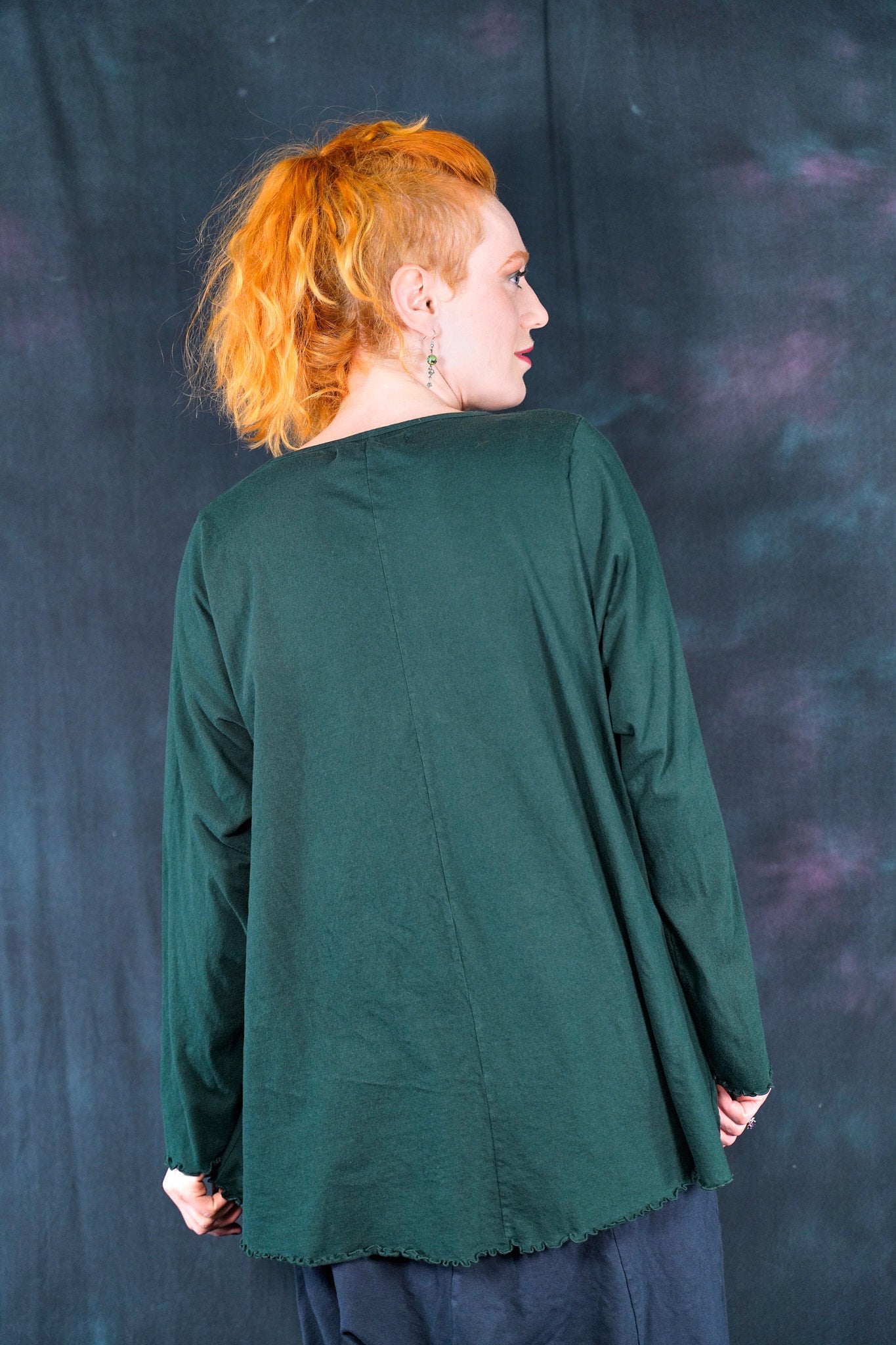 The style features an A-line cut which is slightly fitted at the top and flowy at the bottom. This shape flatters nearly every body & creates an unmistakable silhouette. Our studio artists hand-printed these on the front with inspired artwork in subtle, glowing hues that are perfect for the fall.