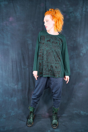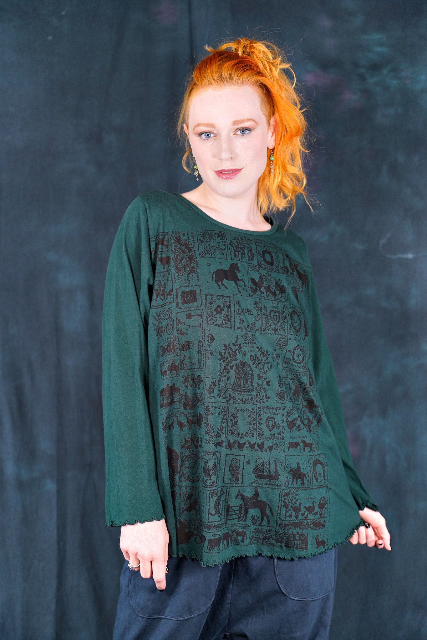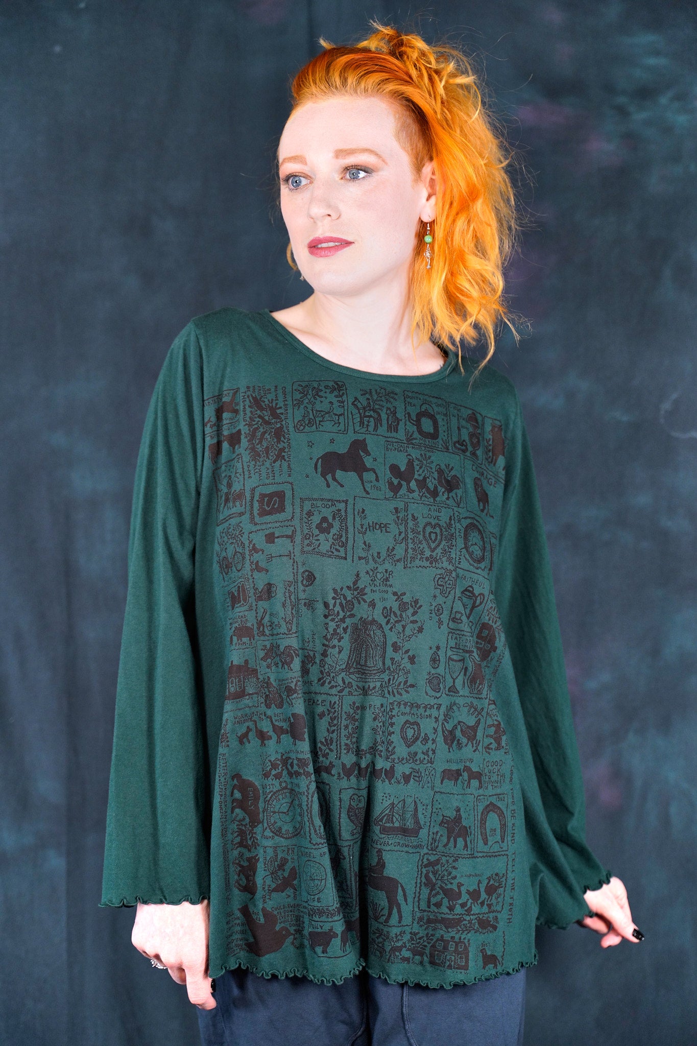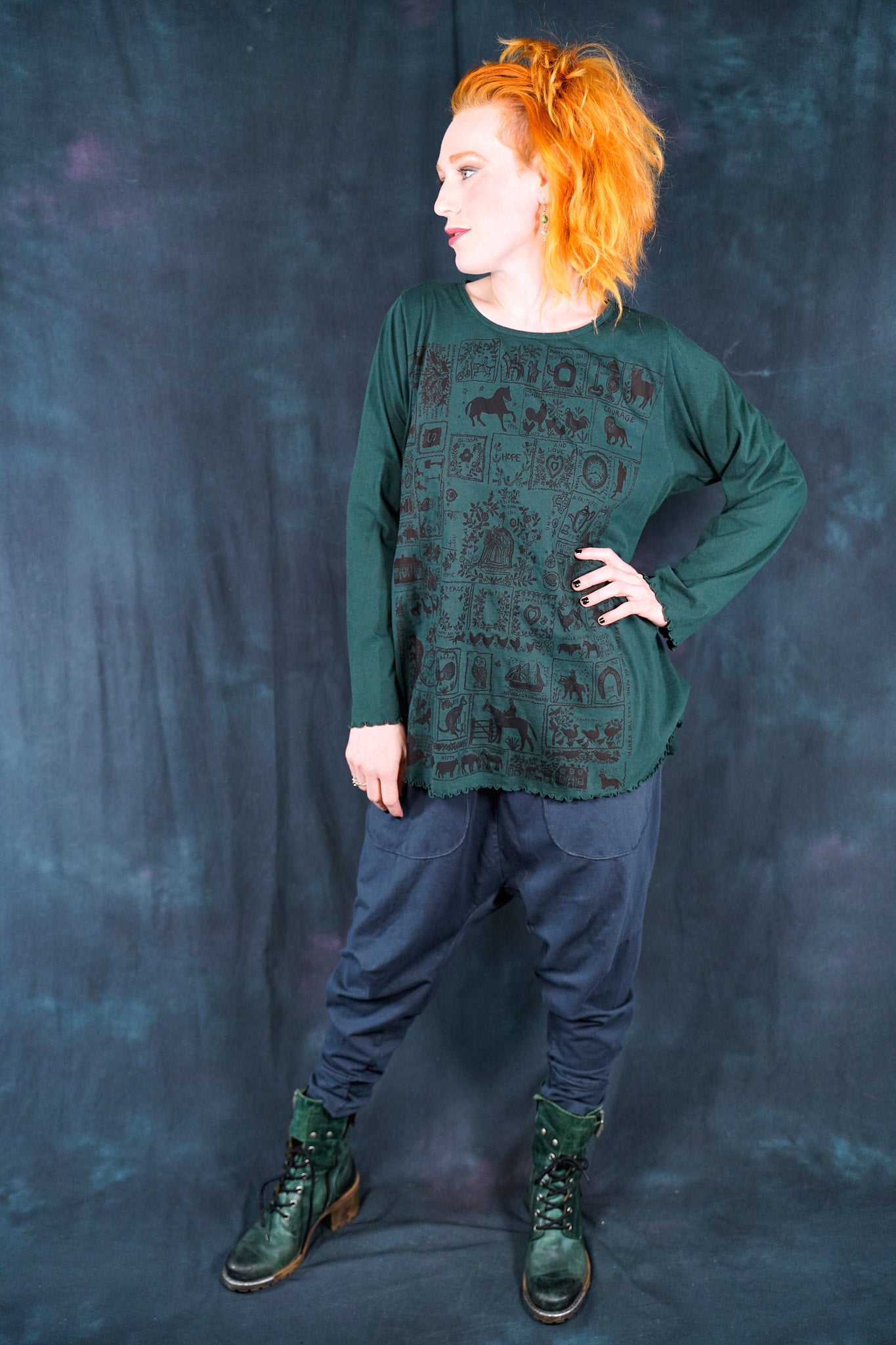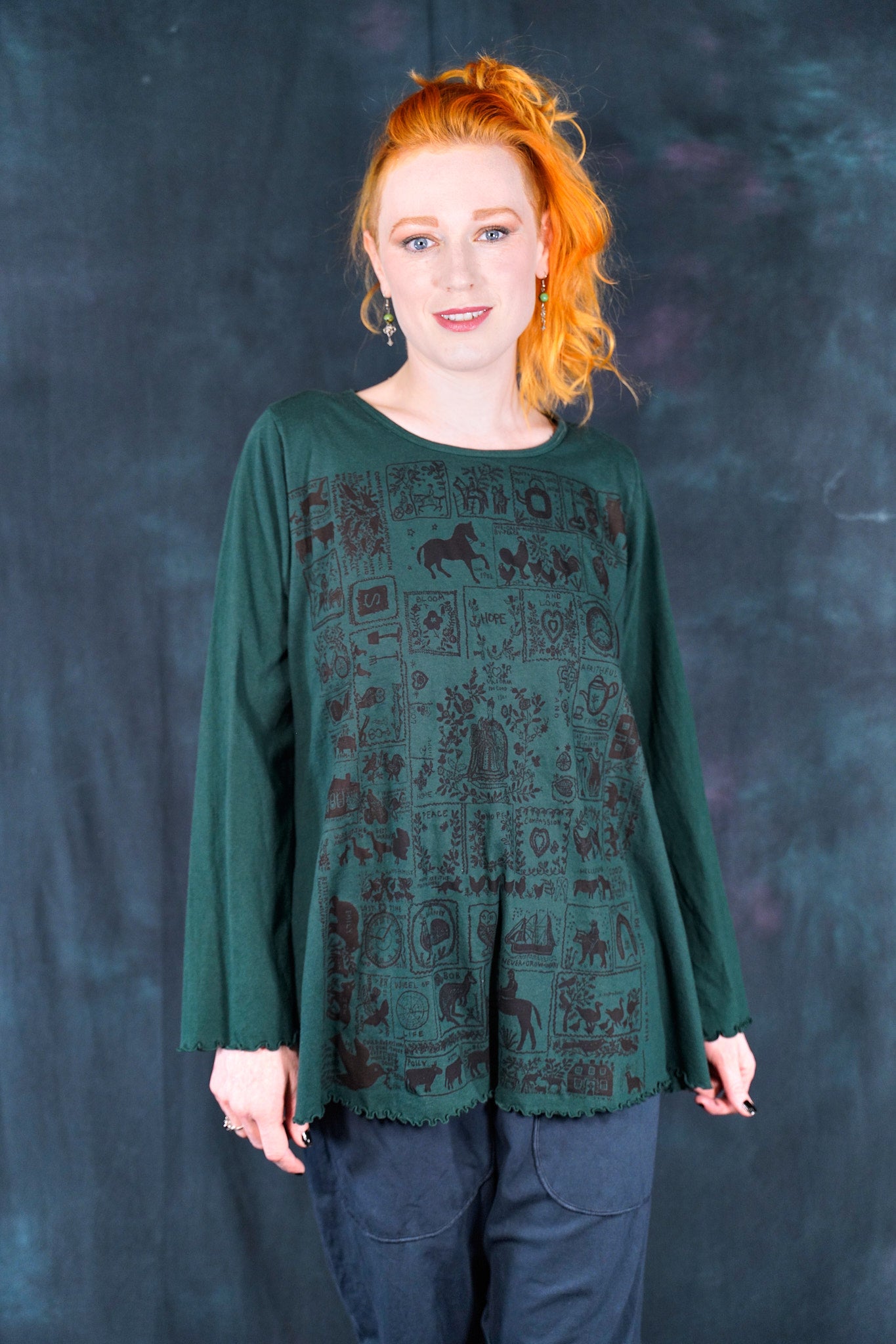The style features an A-line cut which is slightly fitted at the top and flowy at the bottom. This shape flatters nearly every body & creates an unmistakable silhouette. Our studio artists hand-printed these on the front with inspired artwork in subtle, glowing hues that are perfect for the fall.