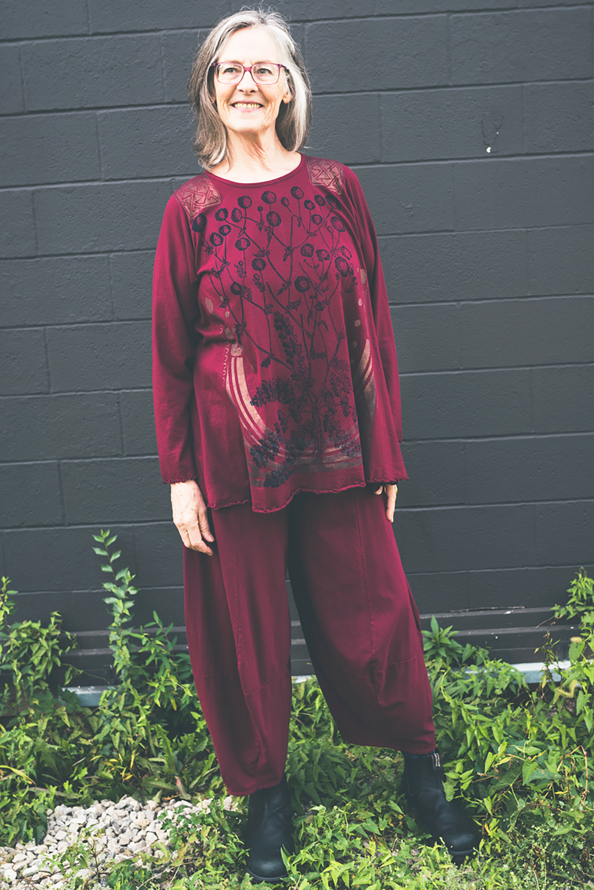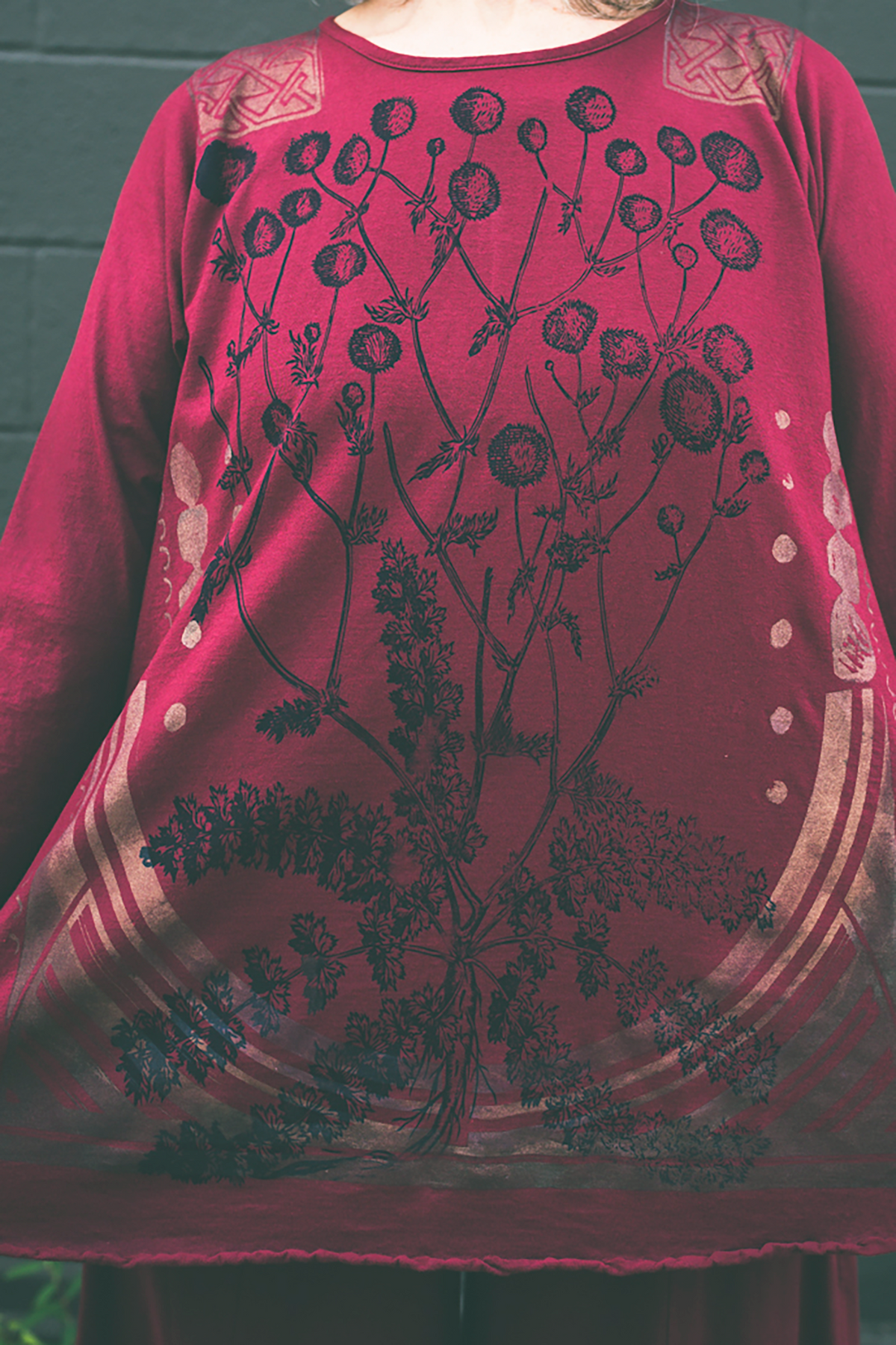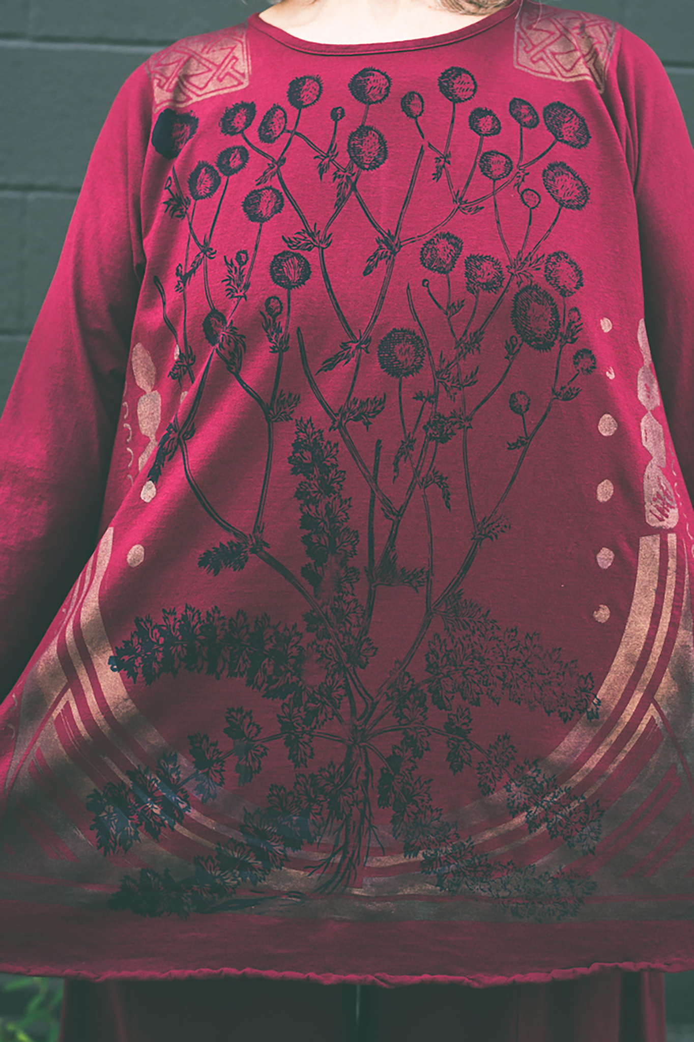 The style features an A-line cut which is slightly fitted at the top and flowy at the bottom. This shape flatters nearly every body & creates an unmistakable silhouette. Our studio artists hand-printed these on the front with inspired artwork in subtle, glowing hues that are perfect for the fall.