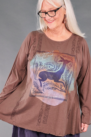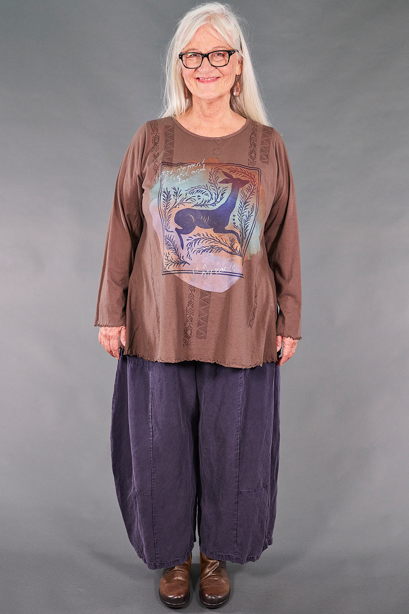 The style features an A-line cut which is slightly fitted at the top and flowy at the bottom. This shape flatters nearly every body & creates an unmistakable silhouette. Our studio artists hand-printed these on the front with inspired artwork in subtle, glowing hues that are perfect for the fall.