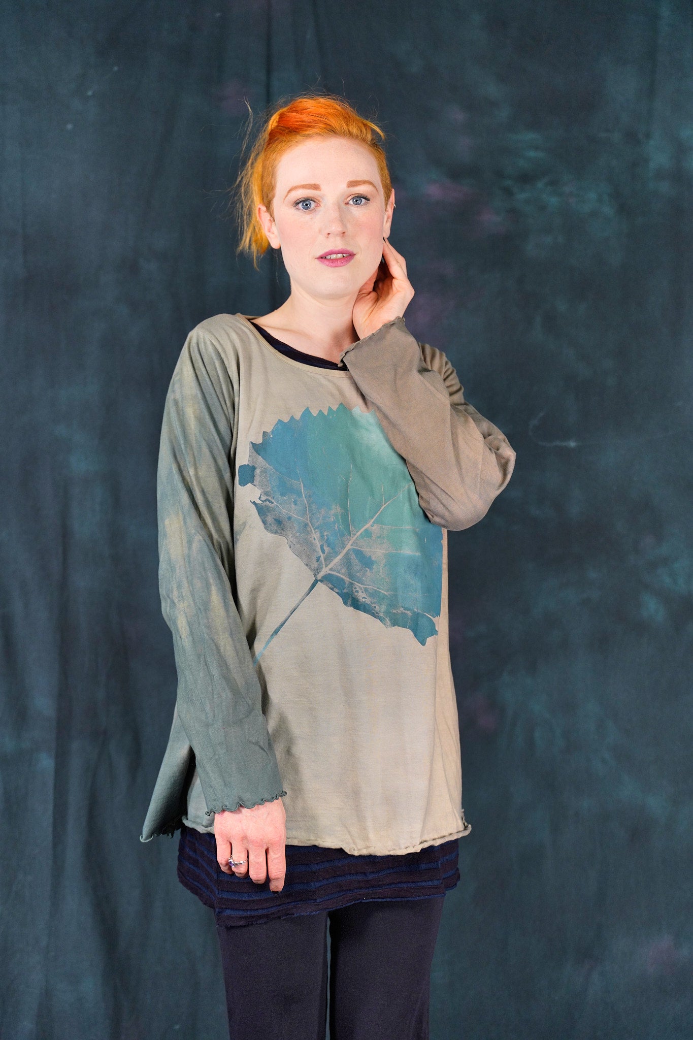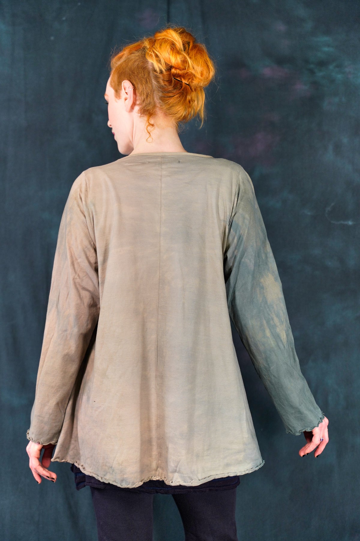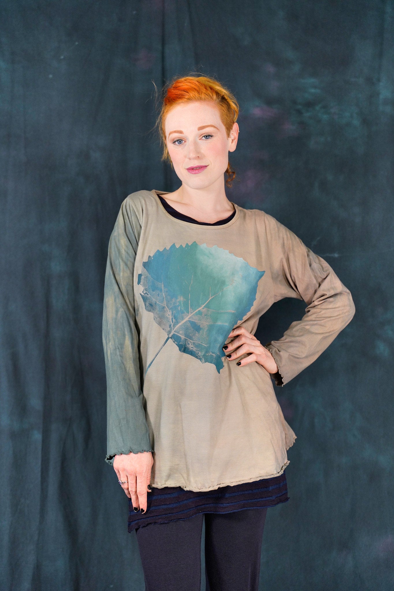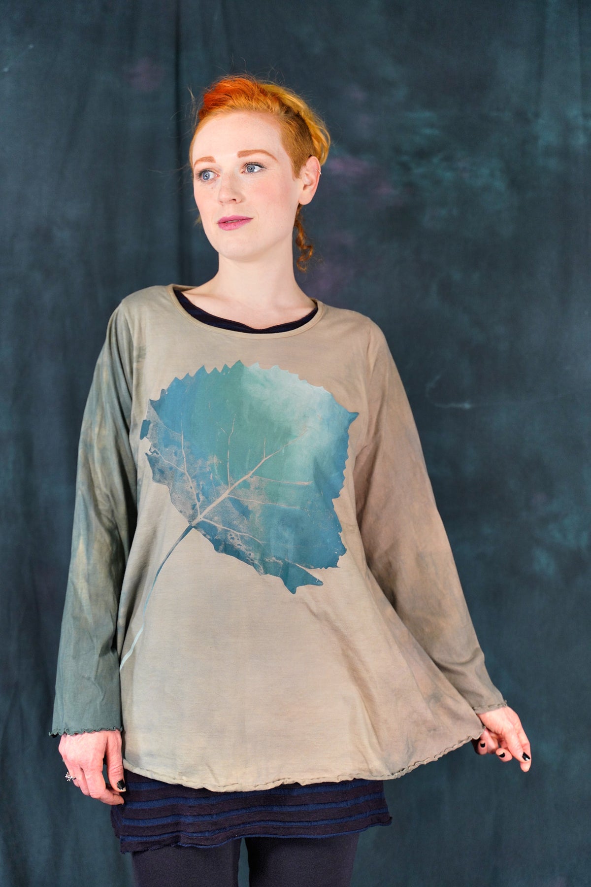 The style features an A-line cut which is slightly fitted at the top and flowy at the bottom. This shape flatters nearly every body & creates an unmistakable silhouette. Our studio artists hand-printed these on the front with inspired artwork in subtle, glowing hues that are perfect for the fall.
