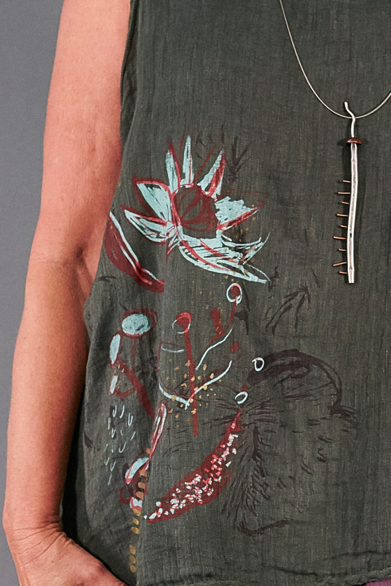 This breezy top was inspired by Bloomsbury floral motifs, and an air of freedom of expression that the circle of artists were known for. The unusual color palette of deep vibrant reds and icy blues atop our organic Piper green linen stirs the imagination.