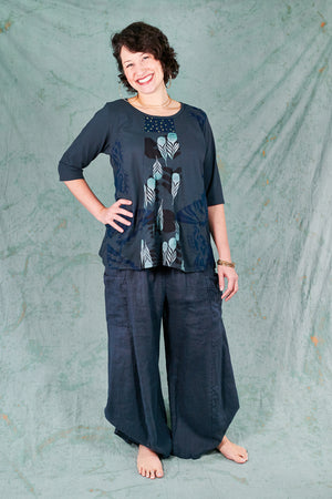 We recommend cold wash with gentle liquid laundry soap on the gentle cycle. Dry in a low heat tumble dryer for a few minutes, then hand dry the rest of the way for best garment longevity. Remember : if you turn your hand printed pieces inside-out, they will look great for a long time.