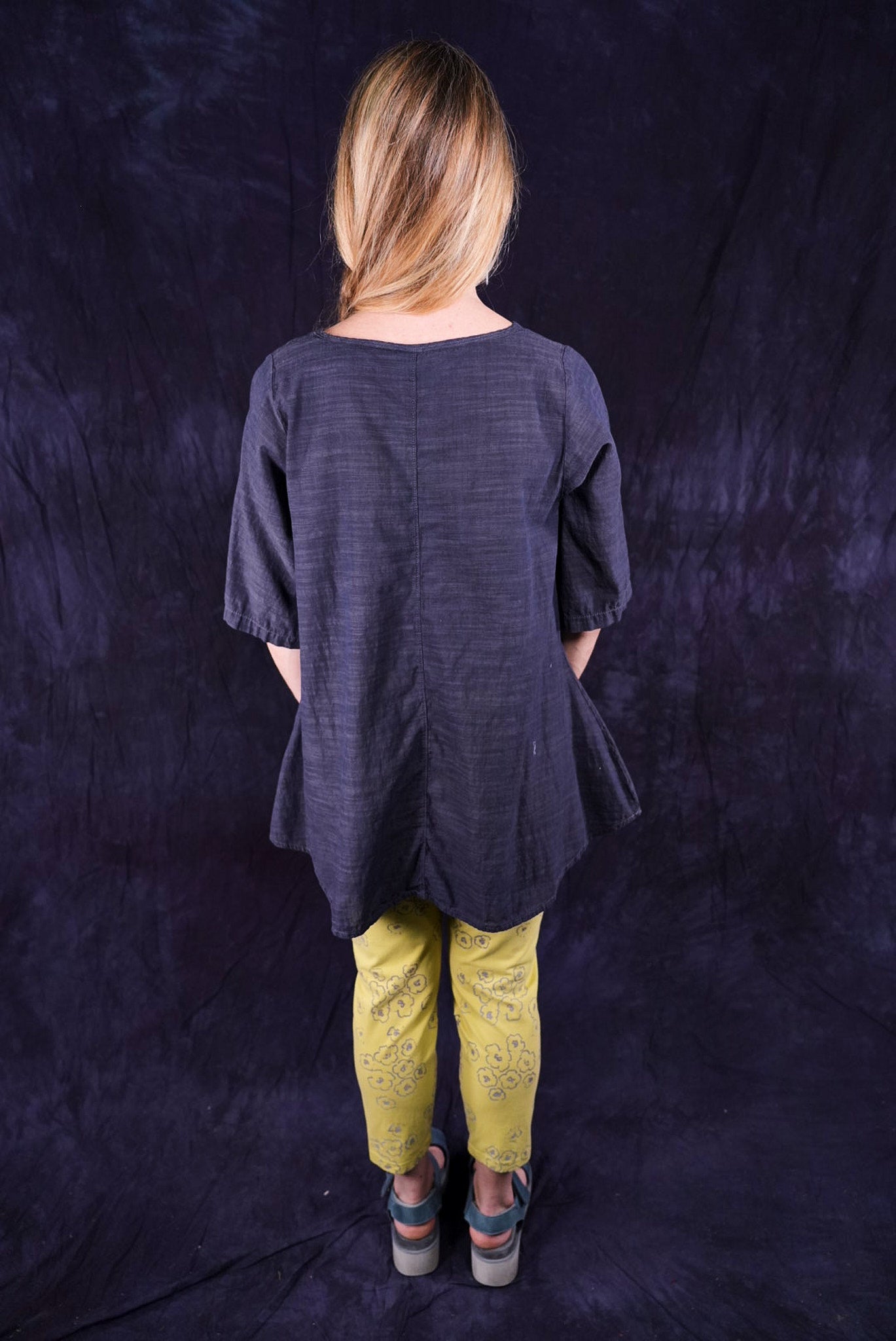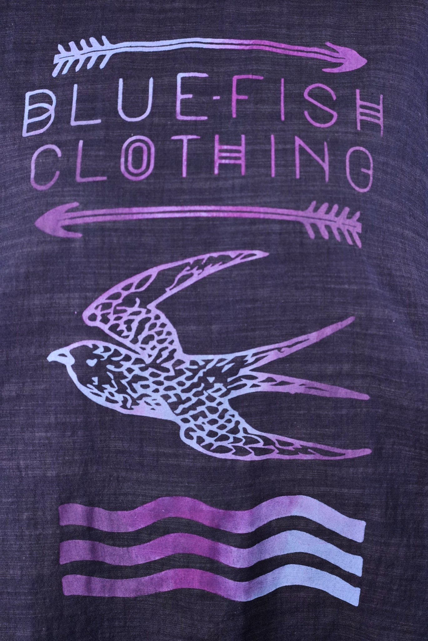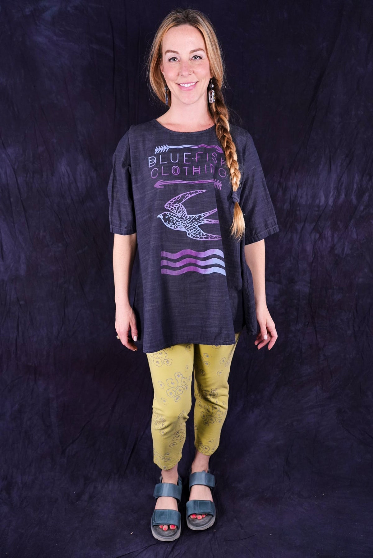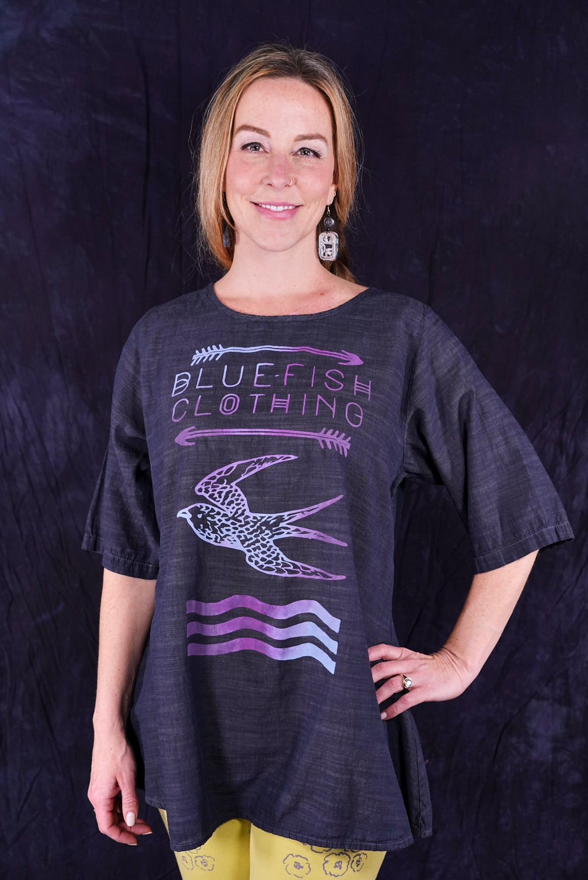 It's super light chambray cotton - great for warmer days- in a very wearable and cool dark denim tone, with Blue Fish handprinted logo designs- with pink tones...choose your favorite. Relaxed style t-shirt in very soft & light chambray cotton. Small tonal stripes add depth to each tee. Goes well with both pants and skirts, easy to wear and beautiful prints!