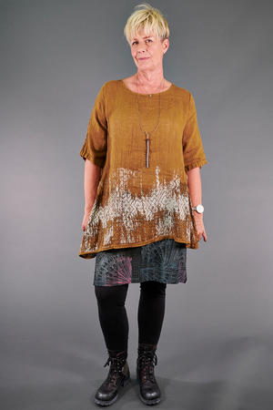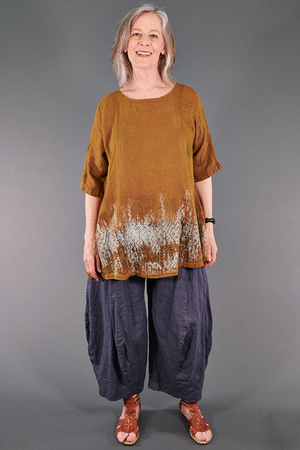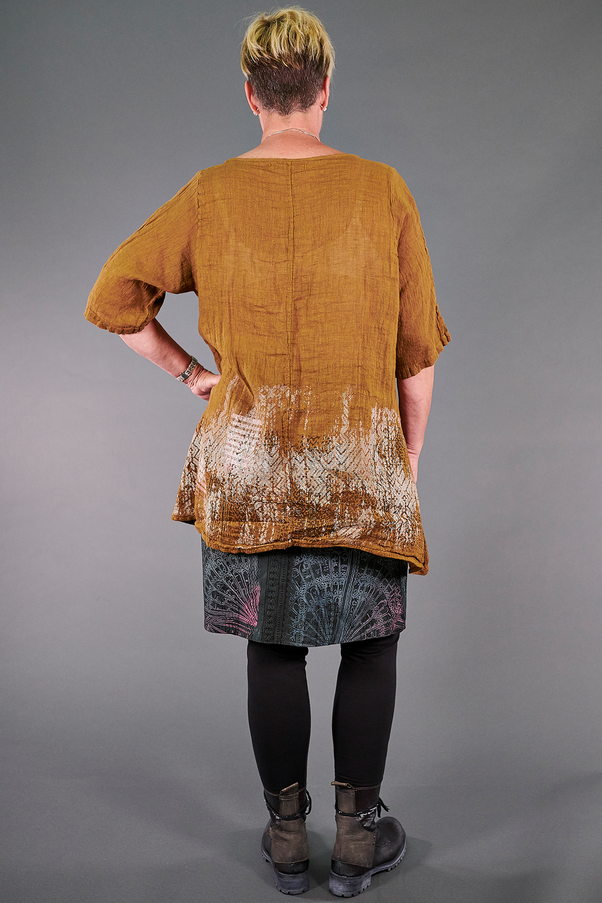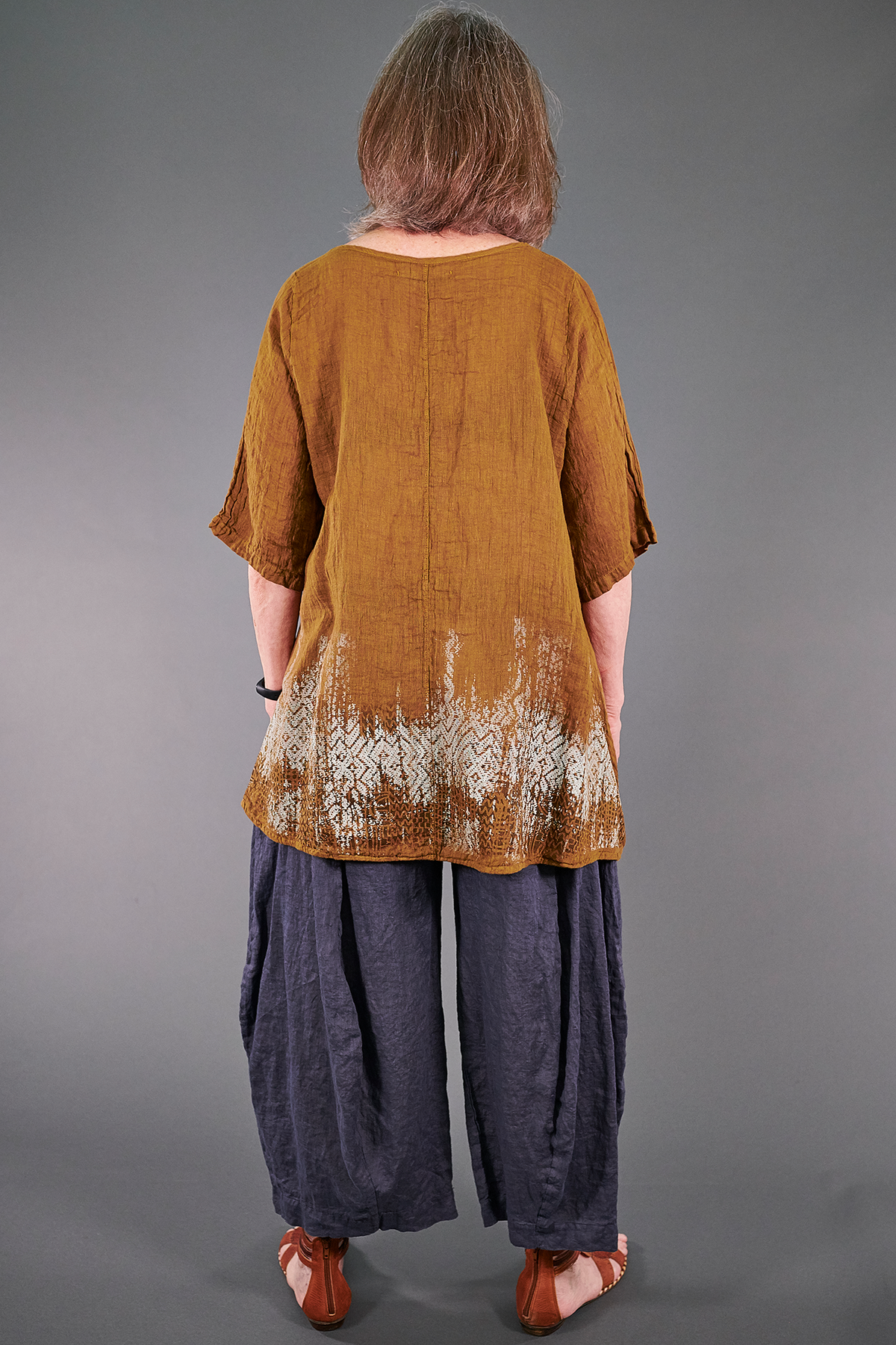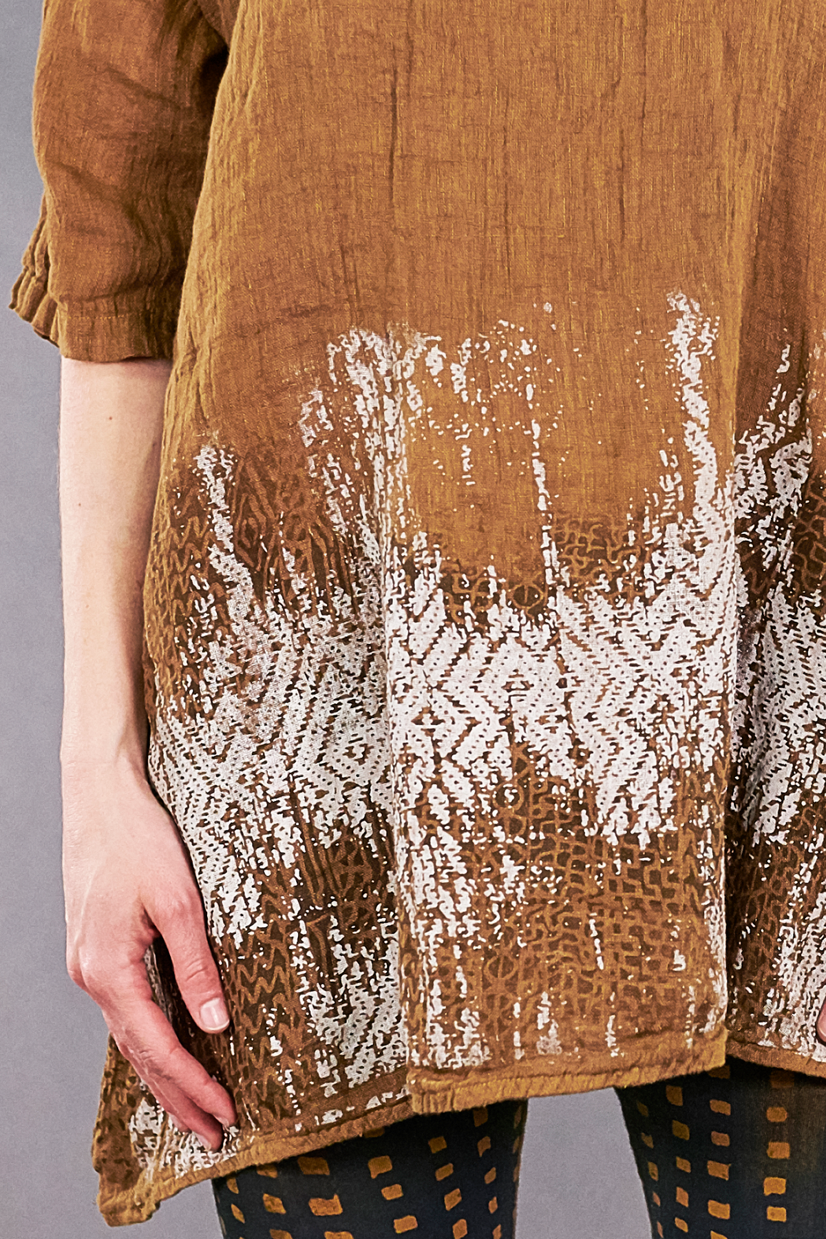 Our Simple Tunic is a new wardrobe staple. We LOVE this breeze linen material--it is so lightweight and feels like heaven on your skin! This is just what you'll want to wear on every warm day and makes a wonderful addition to your Blue Fish collection. Hand-printing on the front adds wonderful dimension to this top.