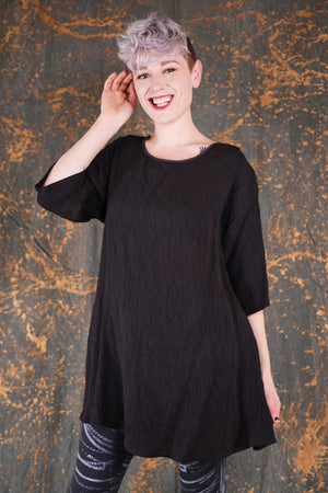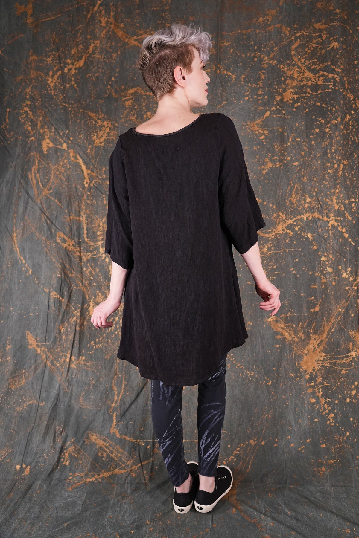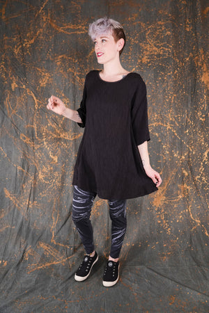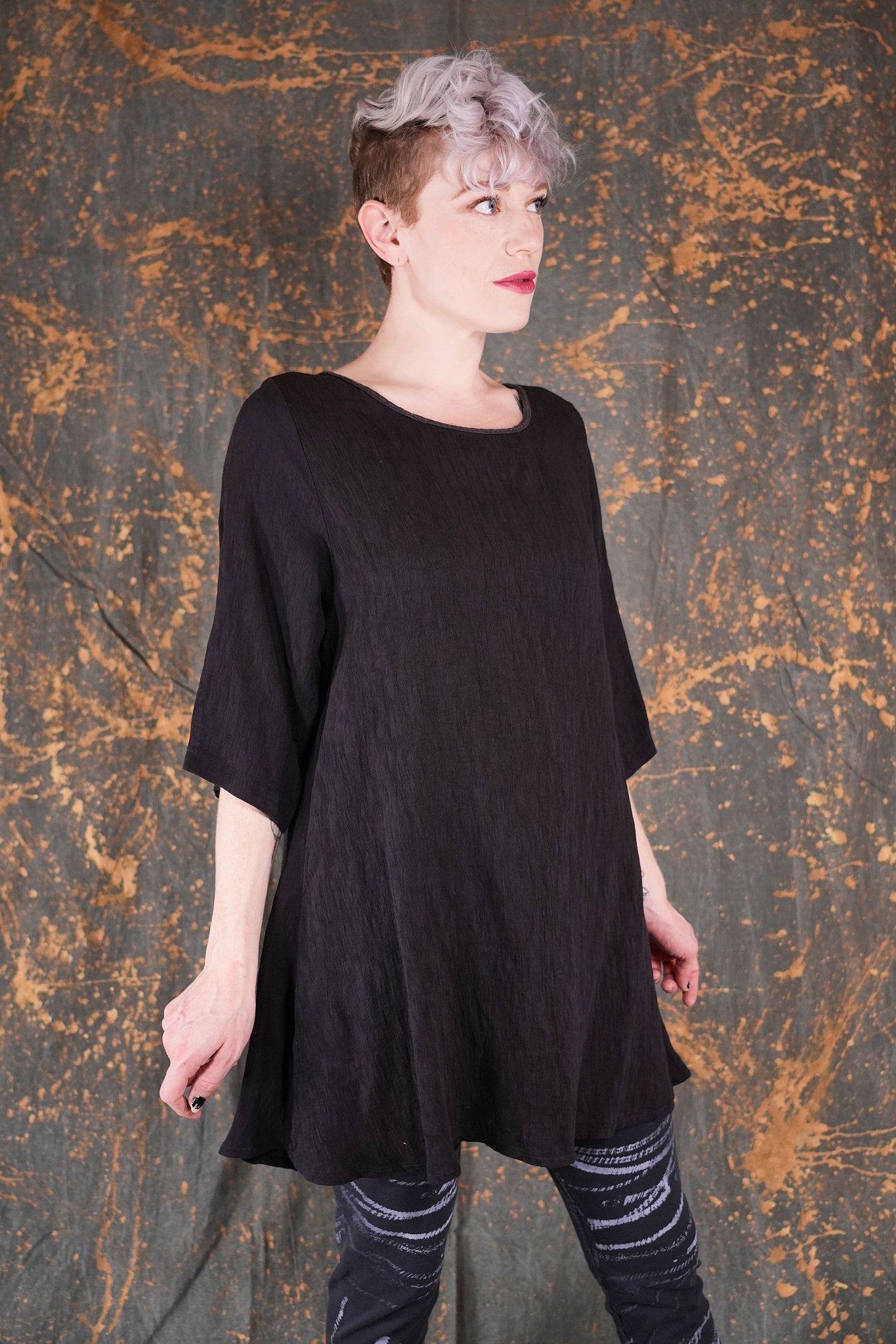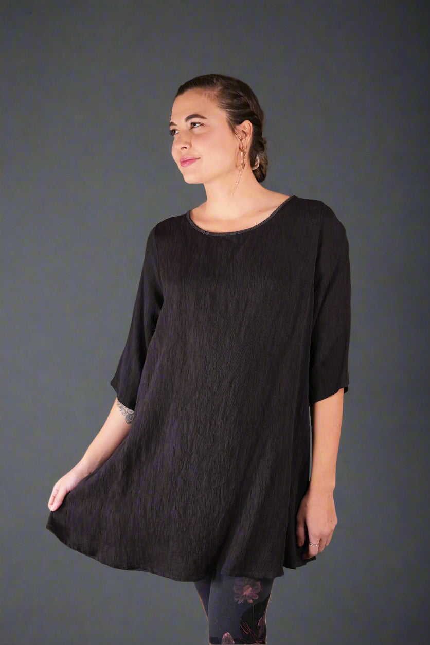 ONLY 2 LEFT Those who have ordered this LOVE this FABRIC very heavy silky drape, luxe feel and in a beautiful style, will last for ever, dress up- great for travel. A luxurious drape and feel characterizes this simple, A-lined tunic. Made from a washable heavier silky feeling fabric that comprises 66% rayon, 17% cotton, and 17% nylon. This fabric has a delicate textural effect- Dyed beautifully. Simply unprinted.