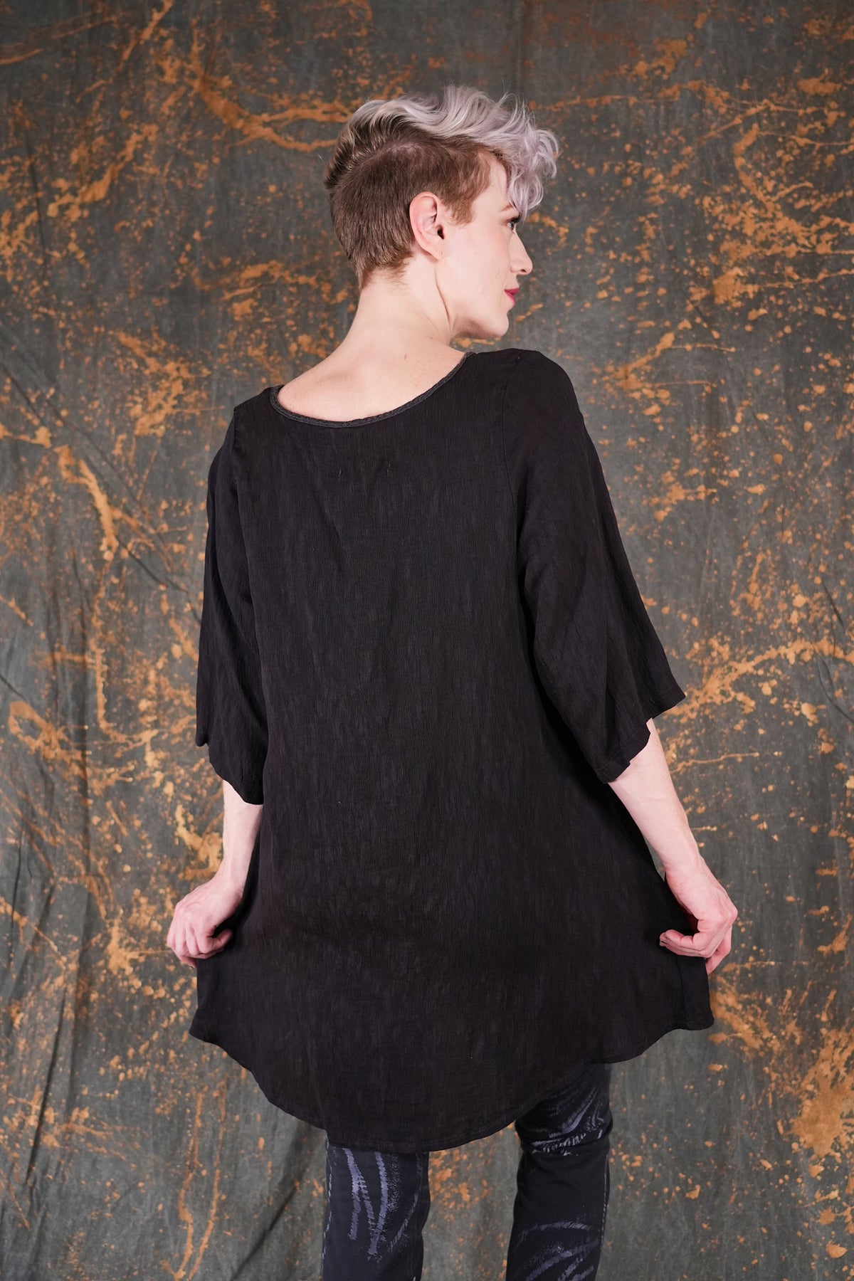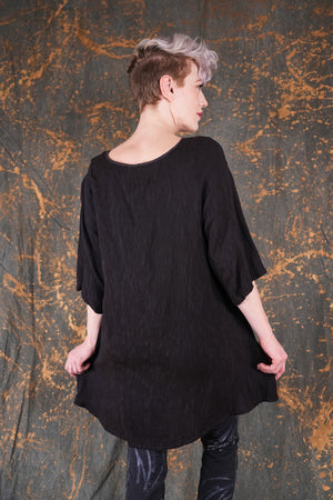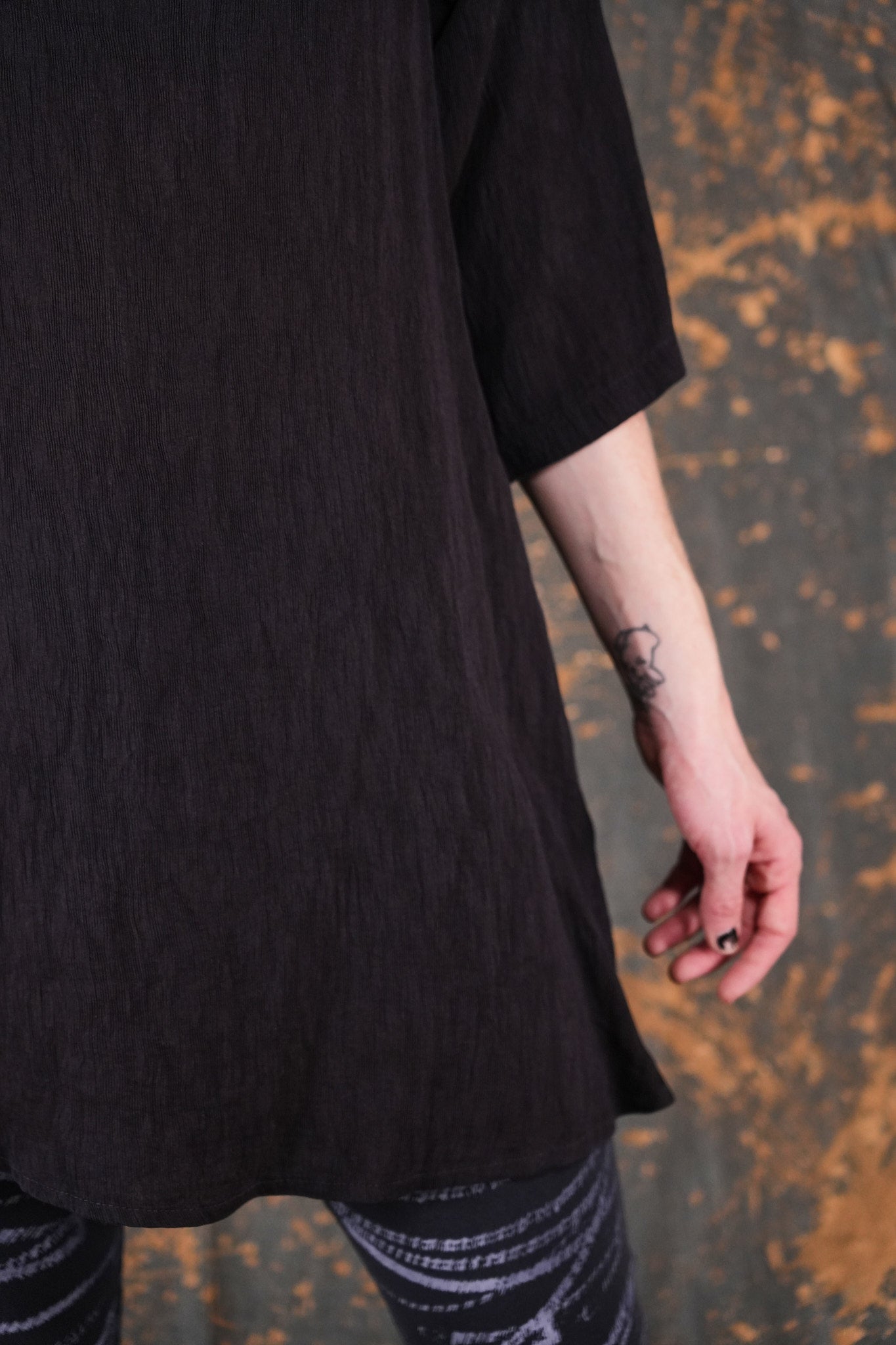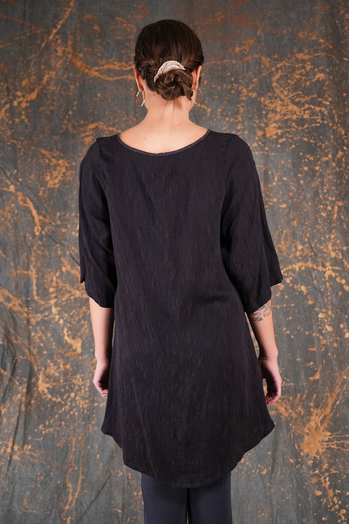 ONLY 2 LEFT Those who have ordered this LOVE this FABRIC very heavy silky drape, luxe feel and in a beautiful style, will last for ever, dress up- great for travel. A luxurious drape and feel characterizes this simple, A-lined tunic. Made from a washable heavier silky feeling fabric that comprises 66% rayon, 17% cotton, and 17% nylon. This fabric has a delicate textural effect- Dyed beautifully. Simply unprinted.
