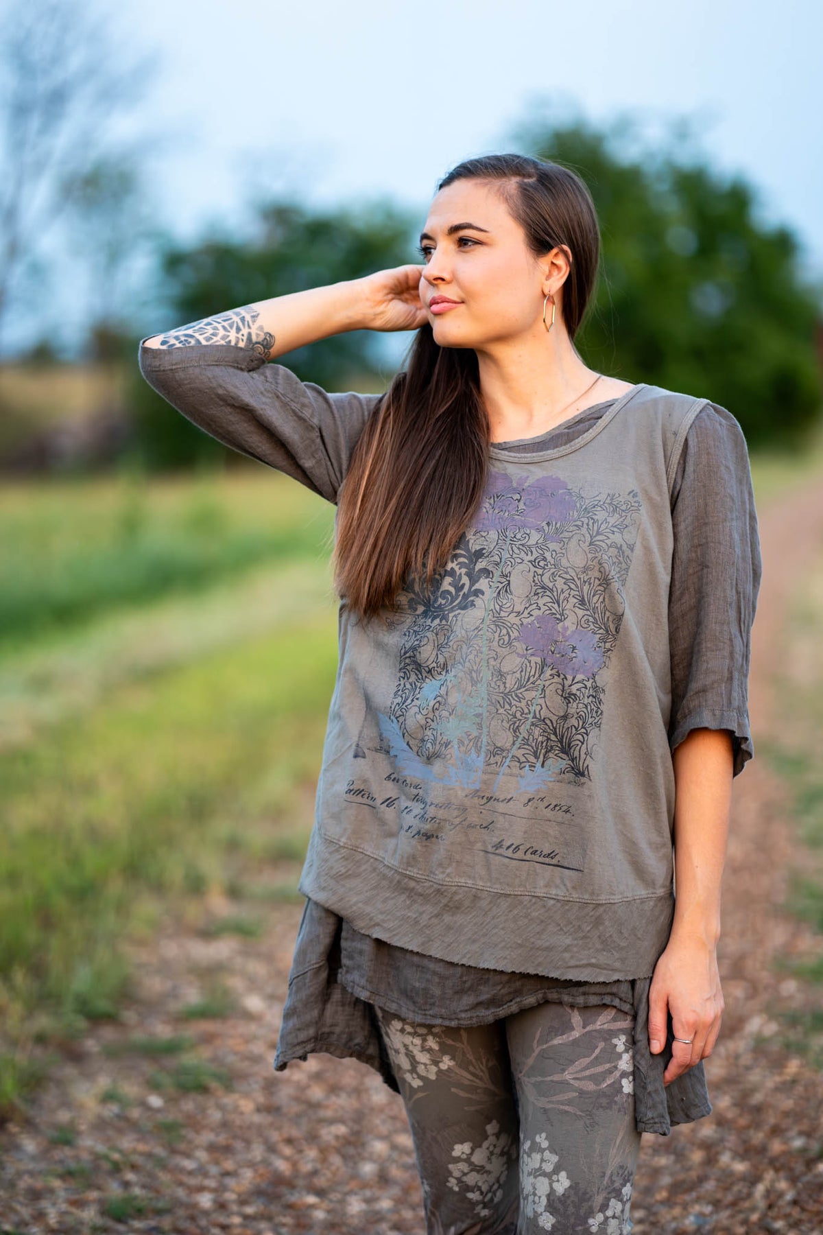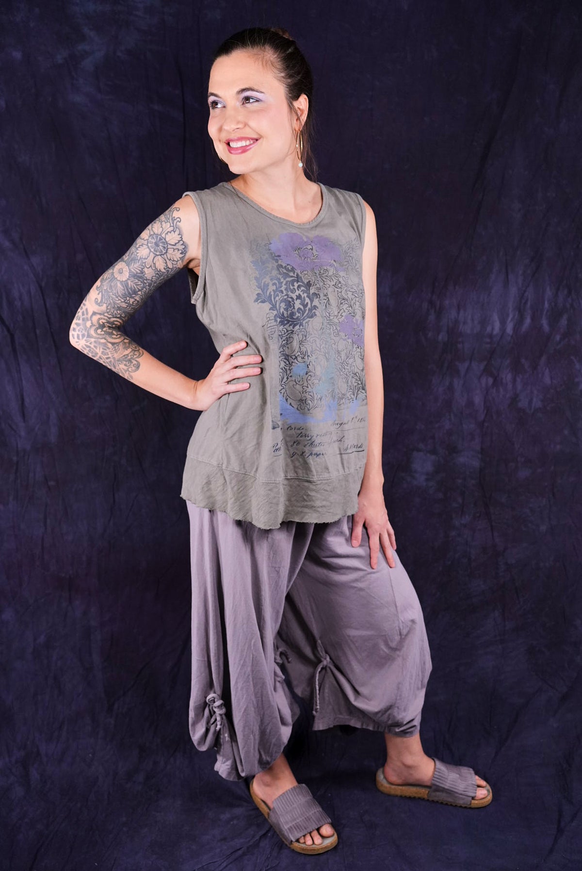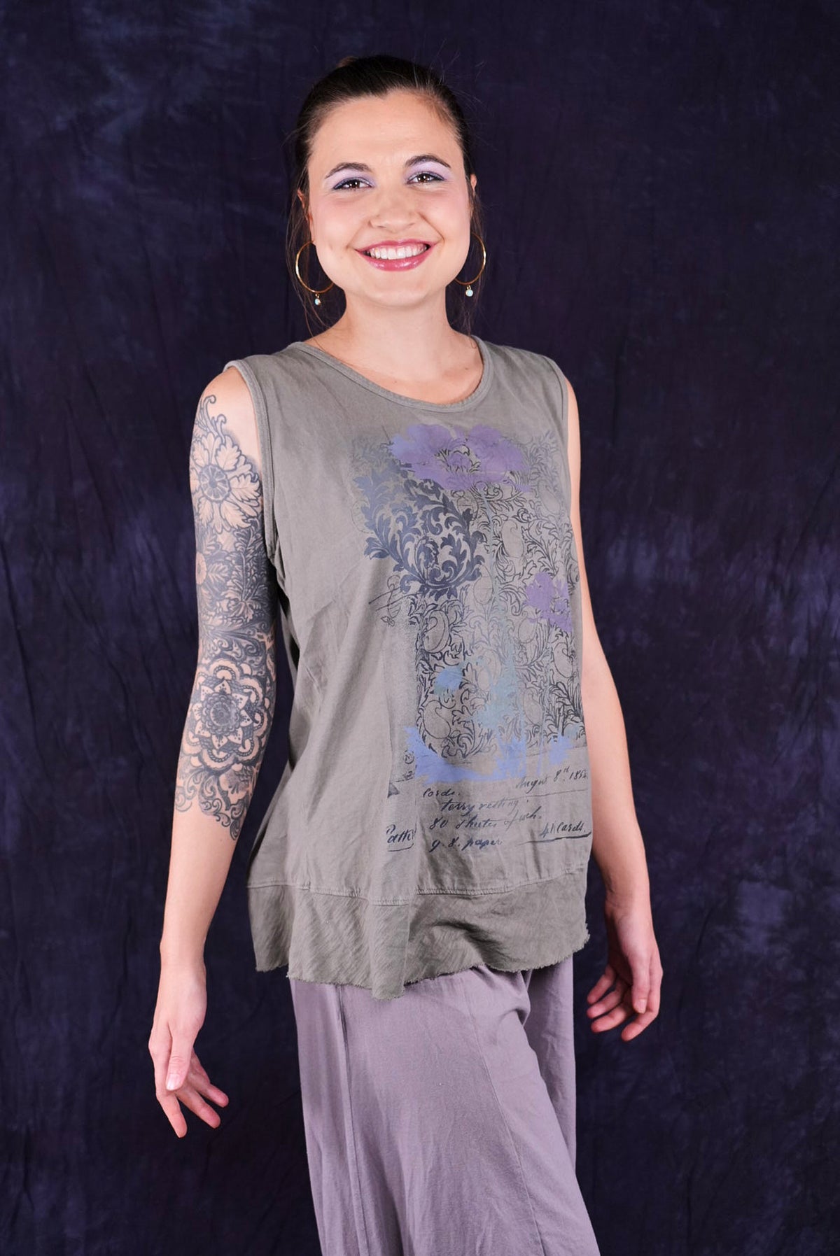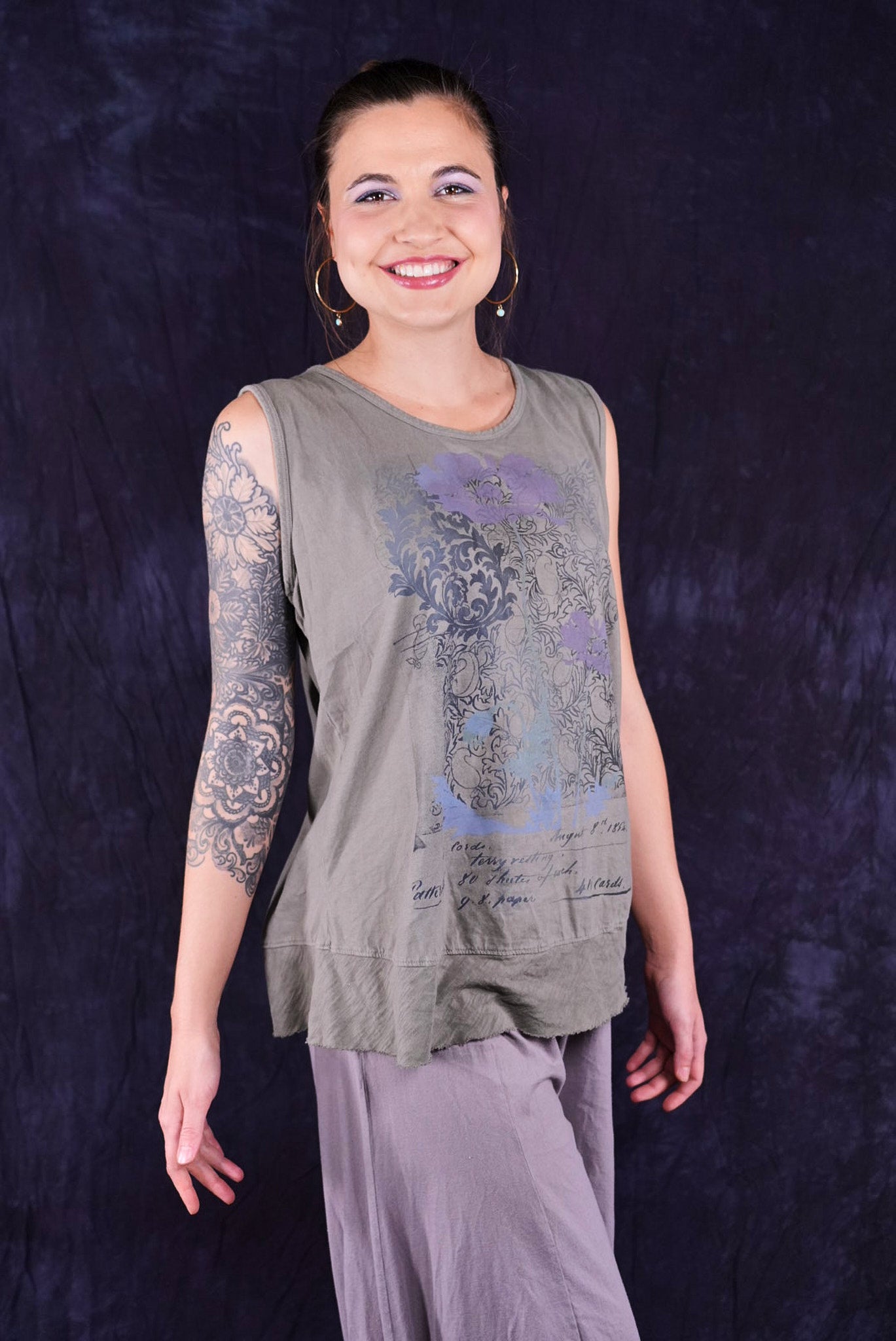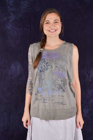 This organic cotton tank top is easy to wear alone or layered under linen jackets...the printing is lovely. Wear with the Double Layer Skirt or the Billow Pant. It's a timeless classic to wear every summer!