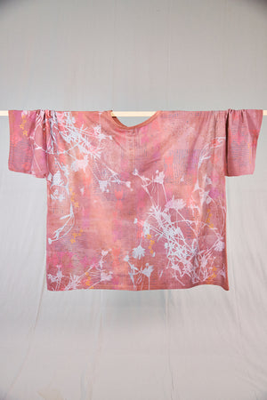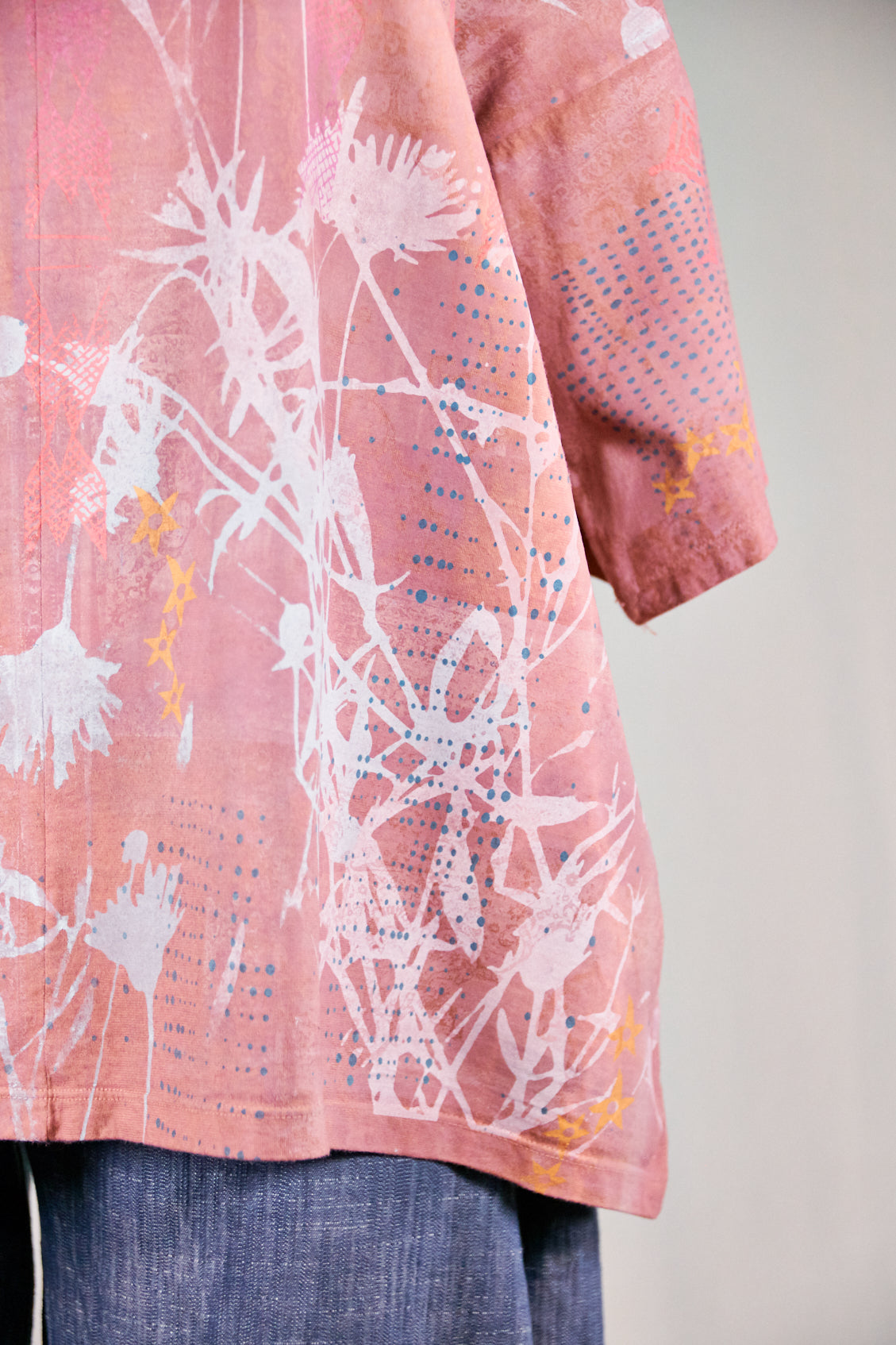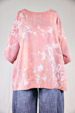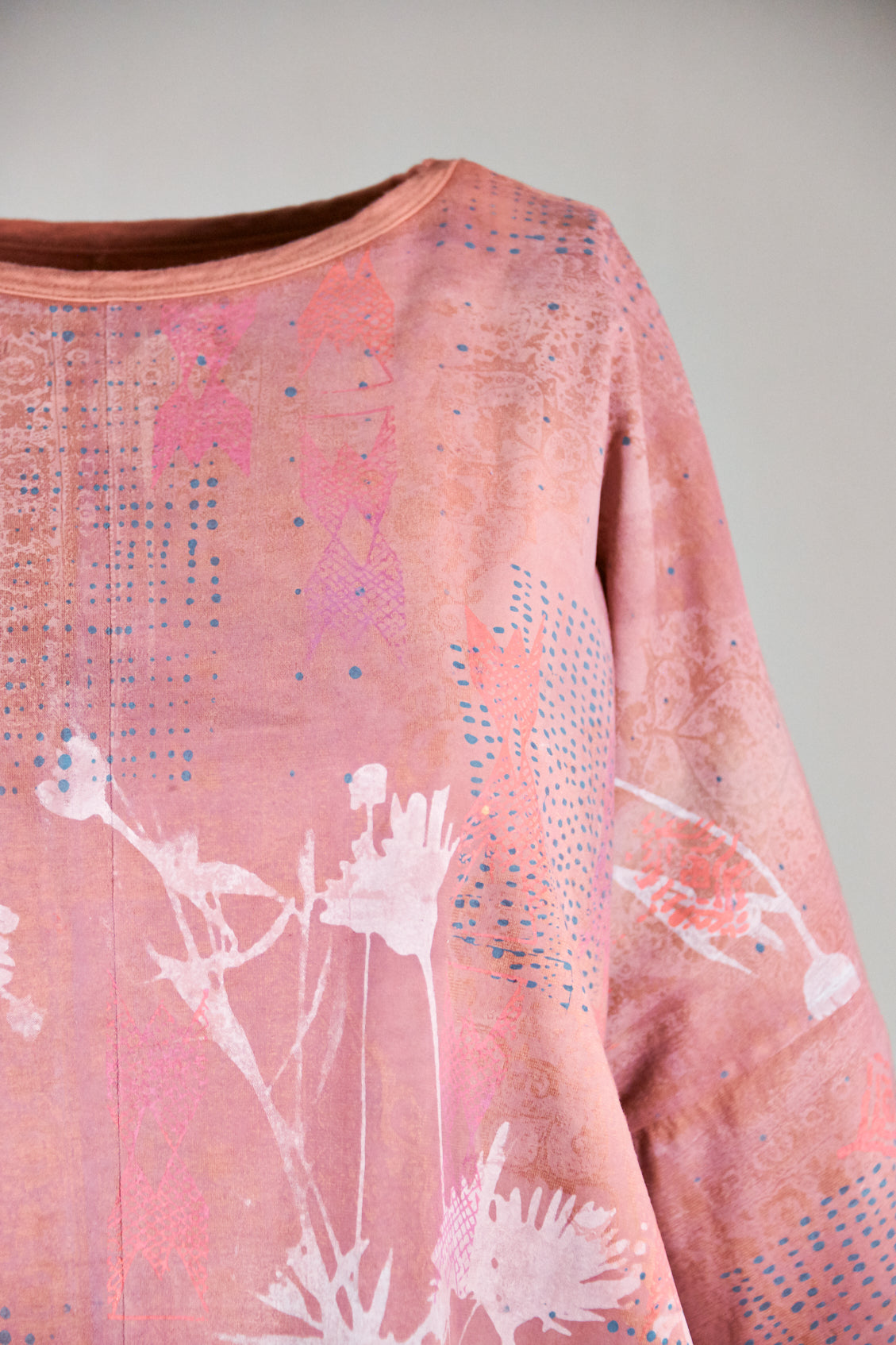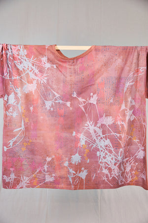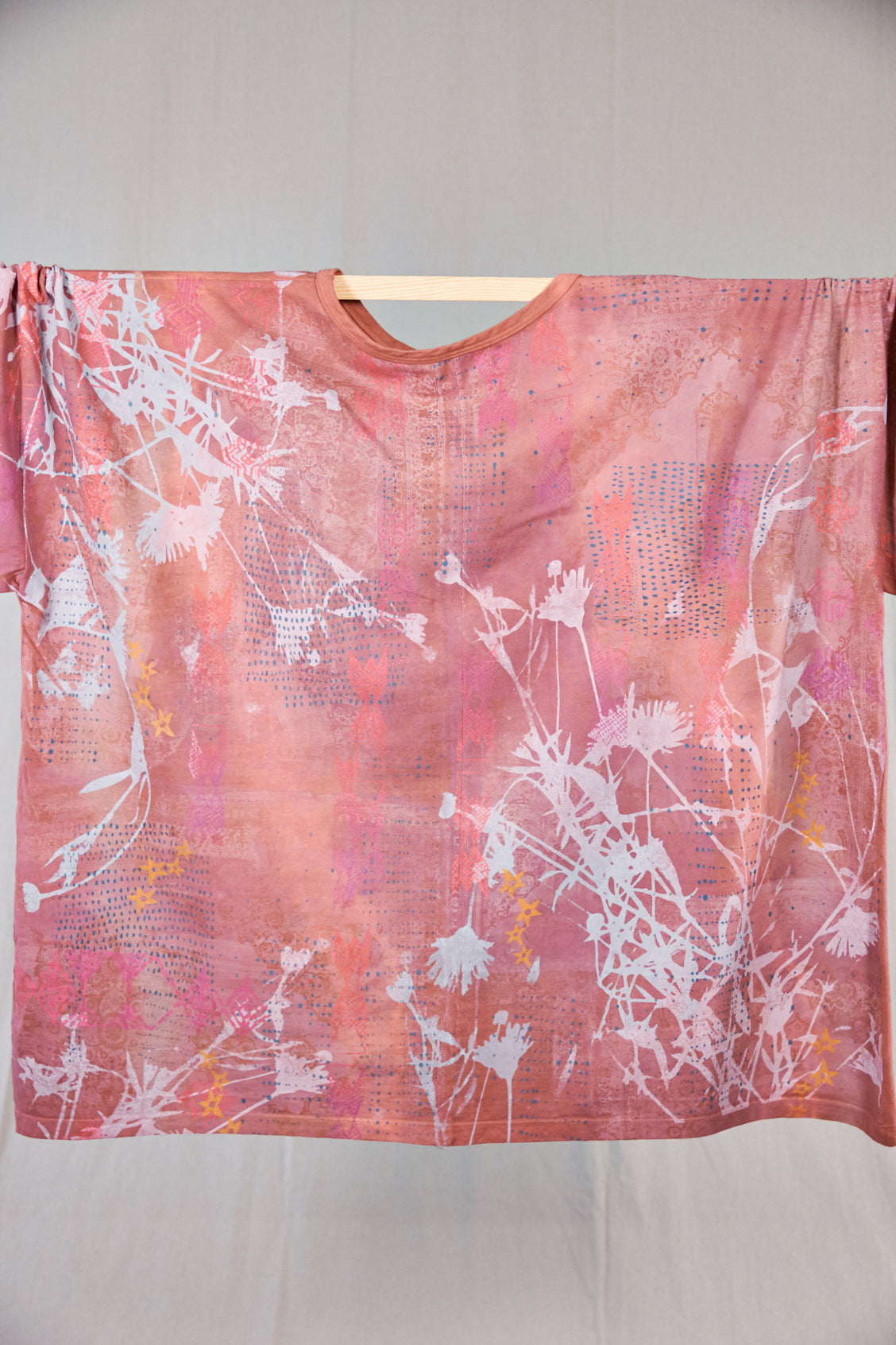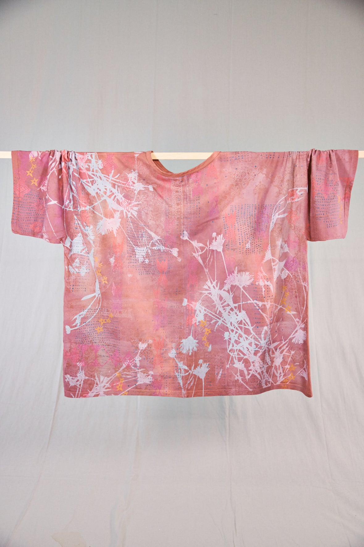 This hand dyed tee in multi tones and printed floral layers is one sized, boxy, wide organic cotton tunic is a wardrobe staple you'll want to wear all year long. All of us at Blue Fish HQ have at least a couple... this magical shape drapes beautifully to flatter every body type. Look closely at the print layers- so much print, in a gardenful of color and artful expression.