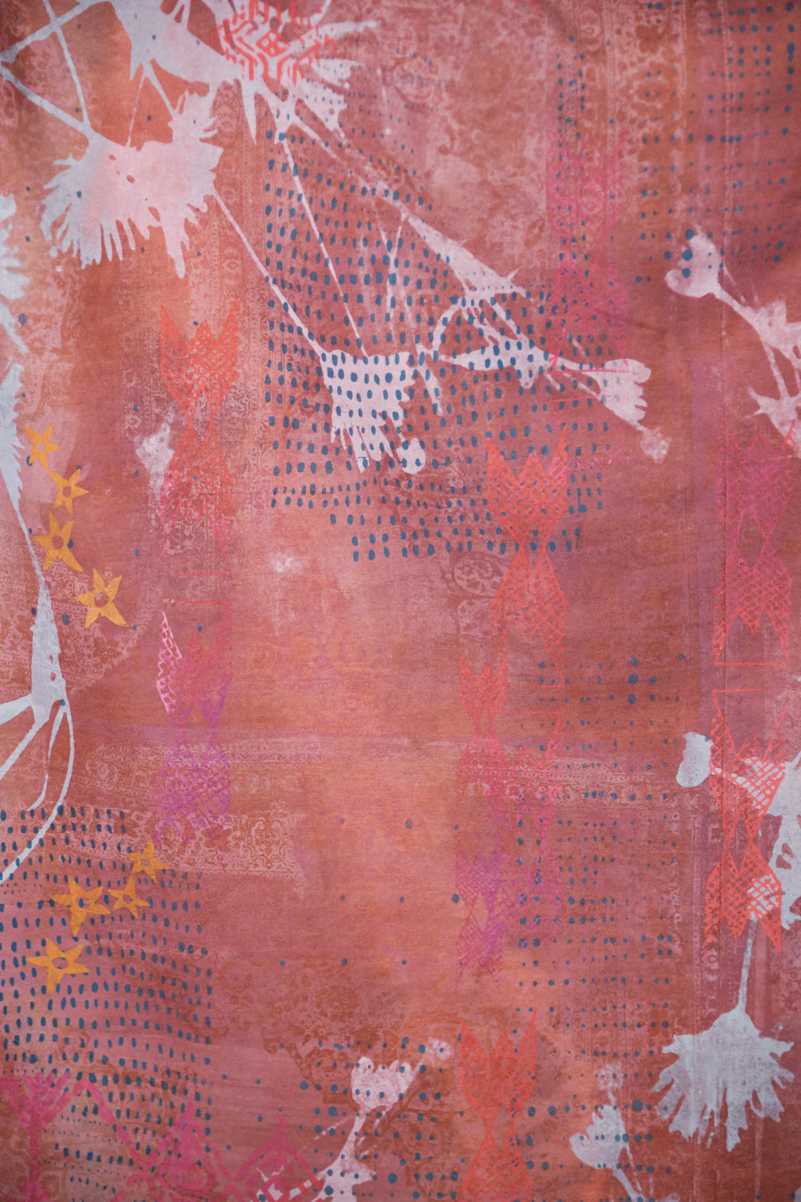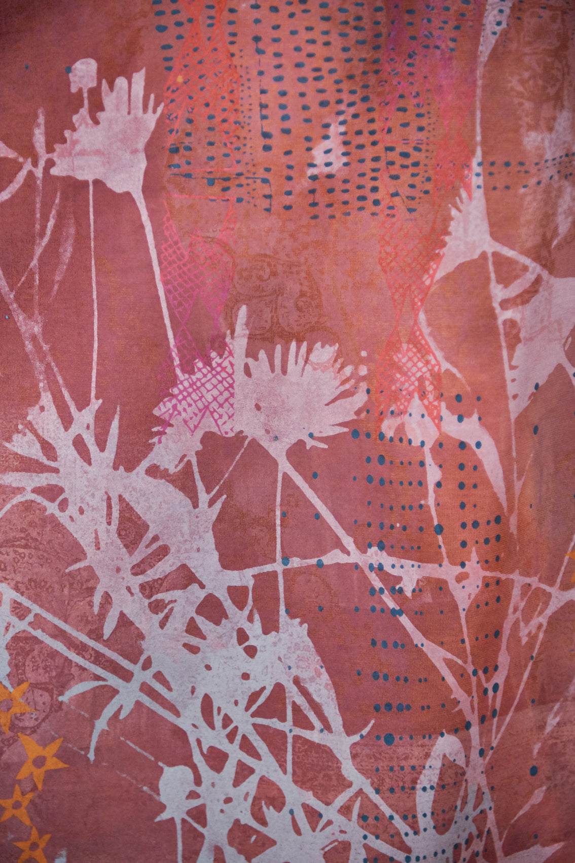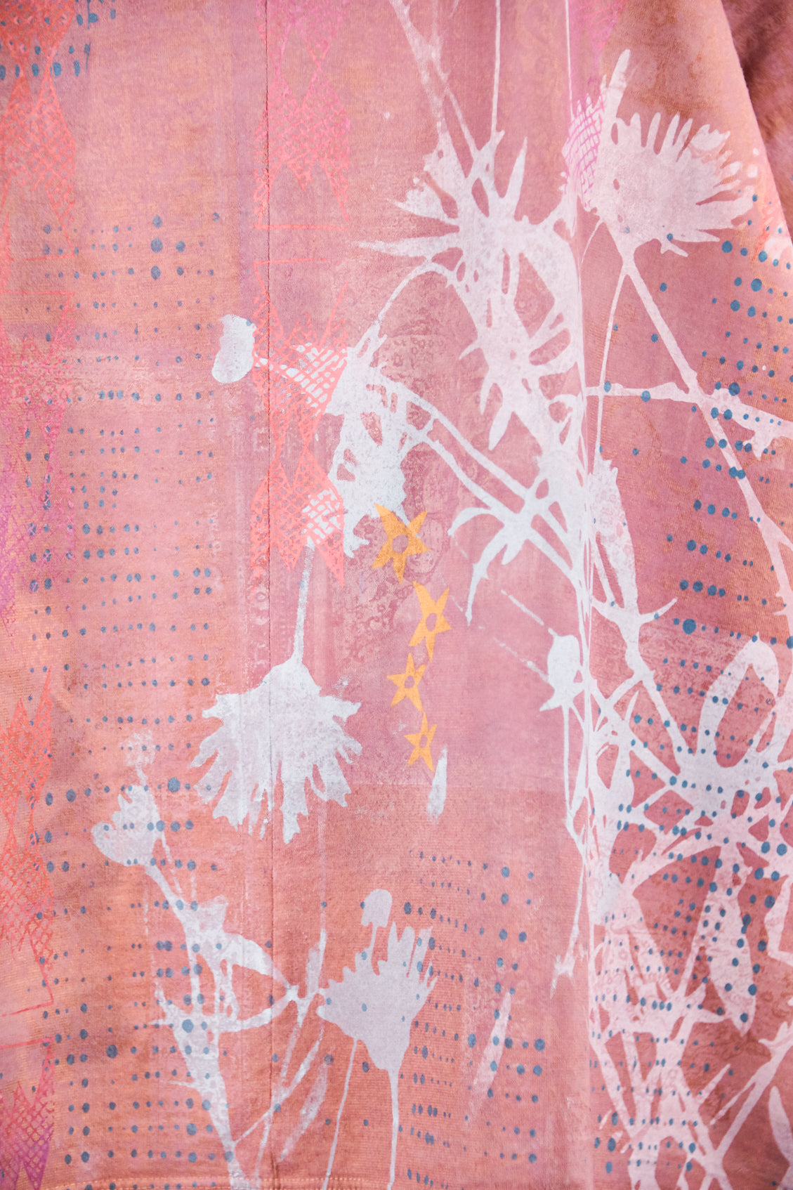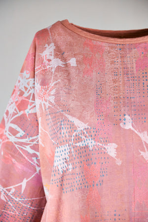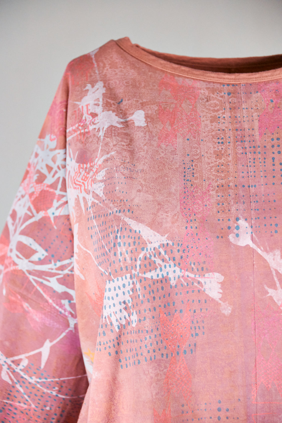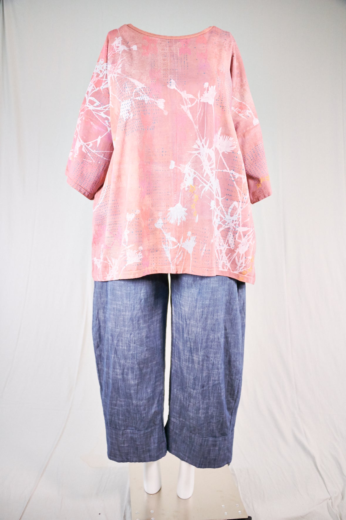 This hand dyed tee in multi tones and printed floral layers is one sized, boxy, wide organic cotton tunic is a wardrobe staple you'll want to wear all year long. All of us at Blue Fish HQ have at least a couple... this magical shape drapes beautifully to flatter every body type. Look closely at the print layers- so much print, in a gardenful of color and artful expression.