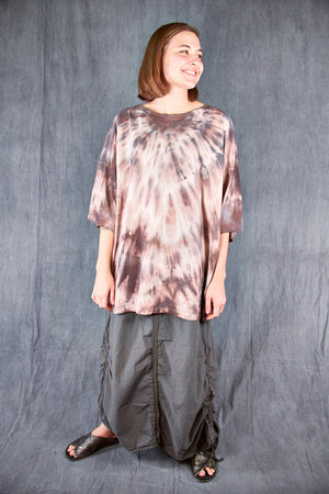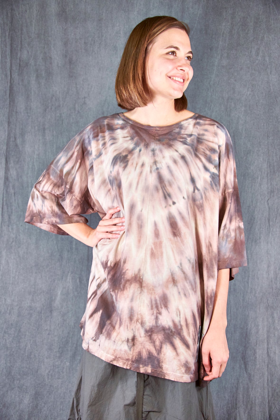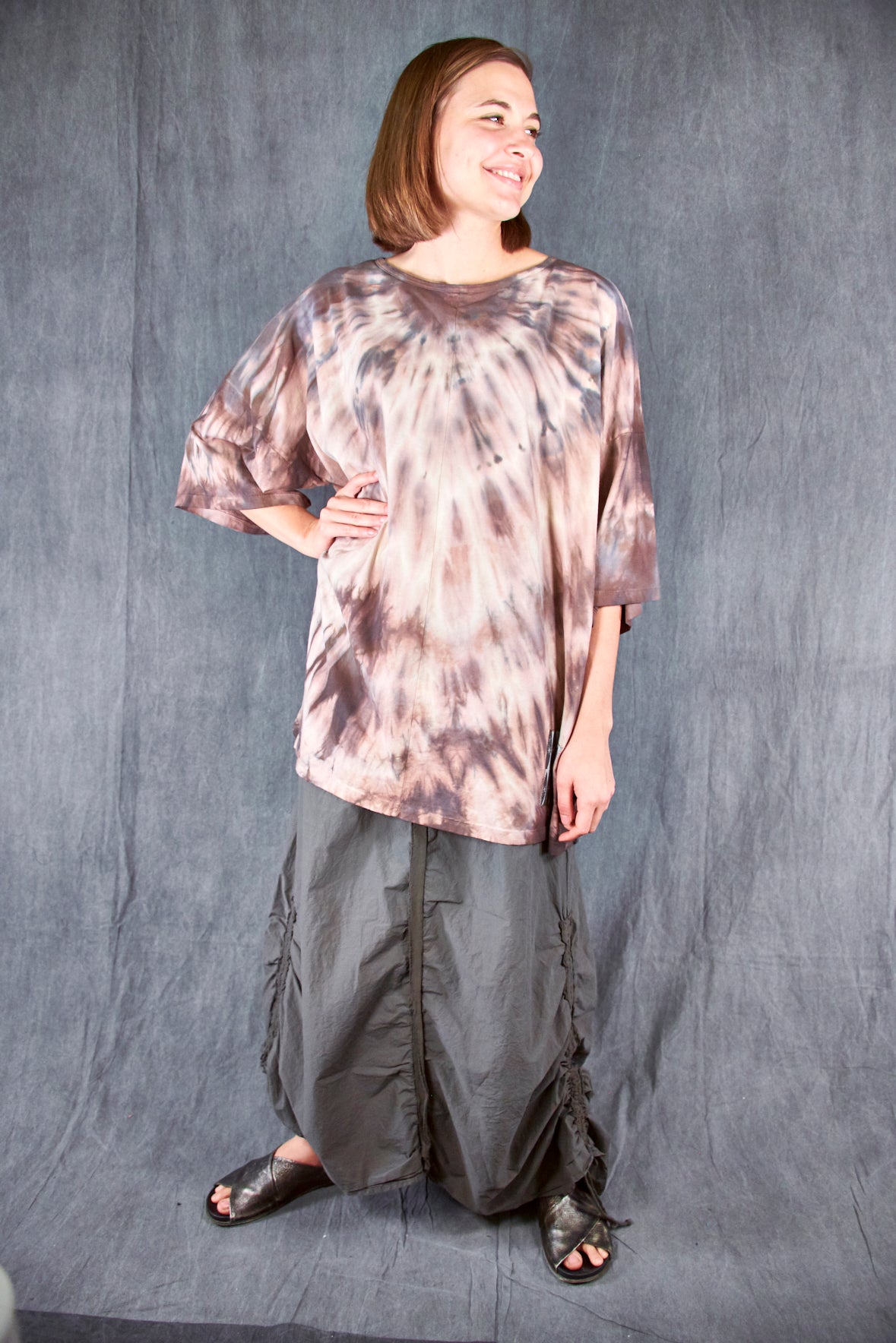 This hand dyed one sized, boxy, wide organic cotton tunic is a wardrobe staple you'll want to wear all year long. All of us at Blue Fish HQ have at least a couple... this magical shape drapes beautifully to flatter every body type. This one is shibori hand dyed. Look closely at the detail in the dyework, it is beautiful!