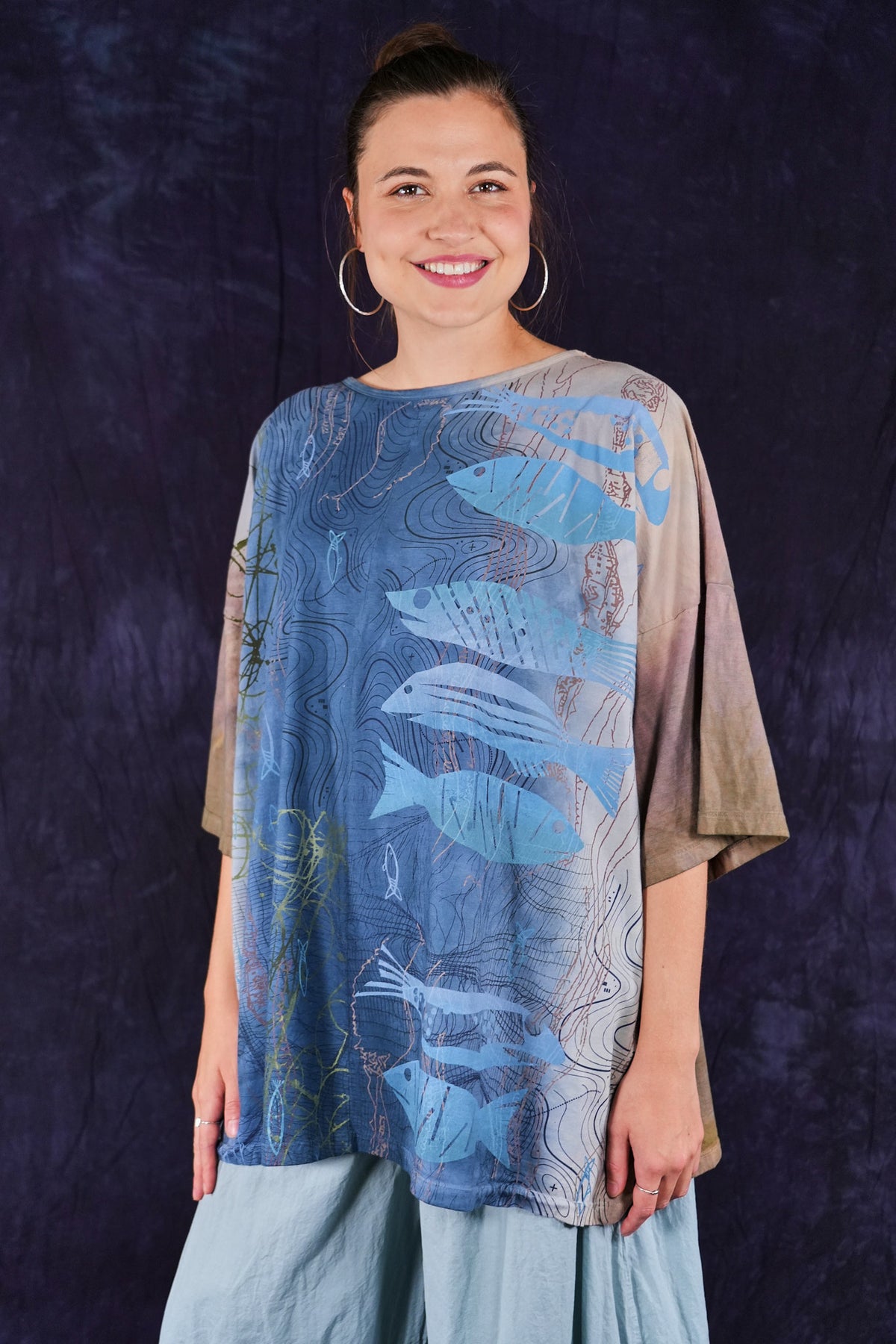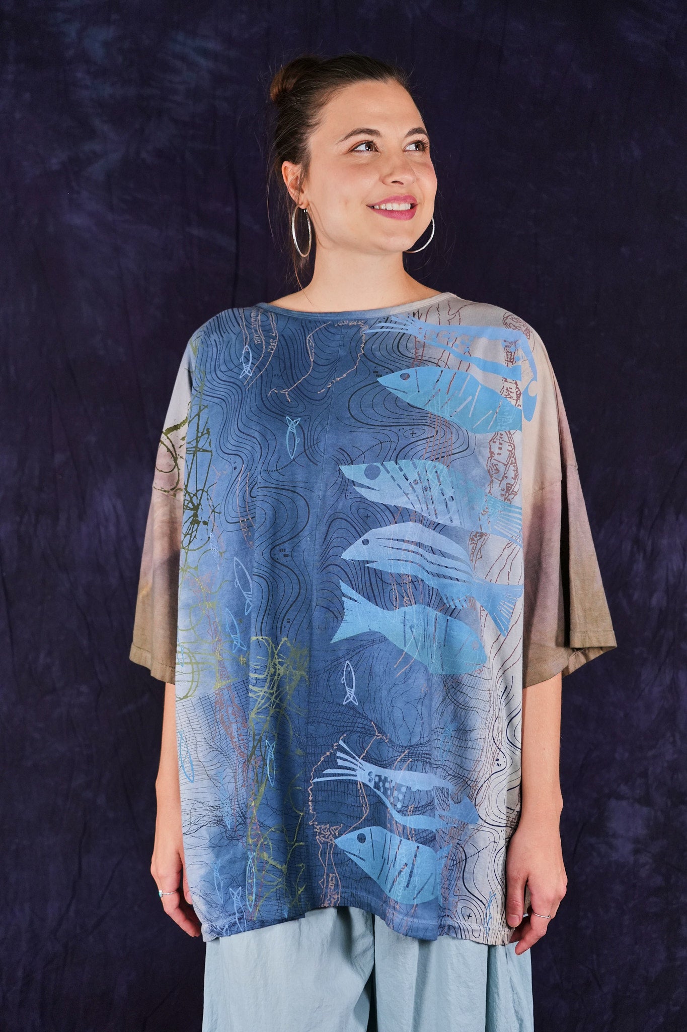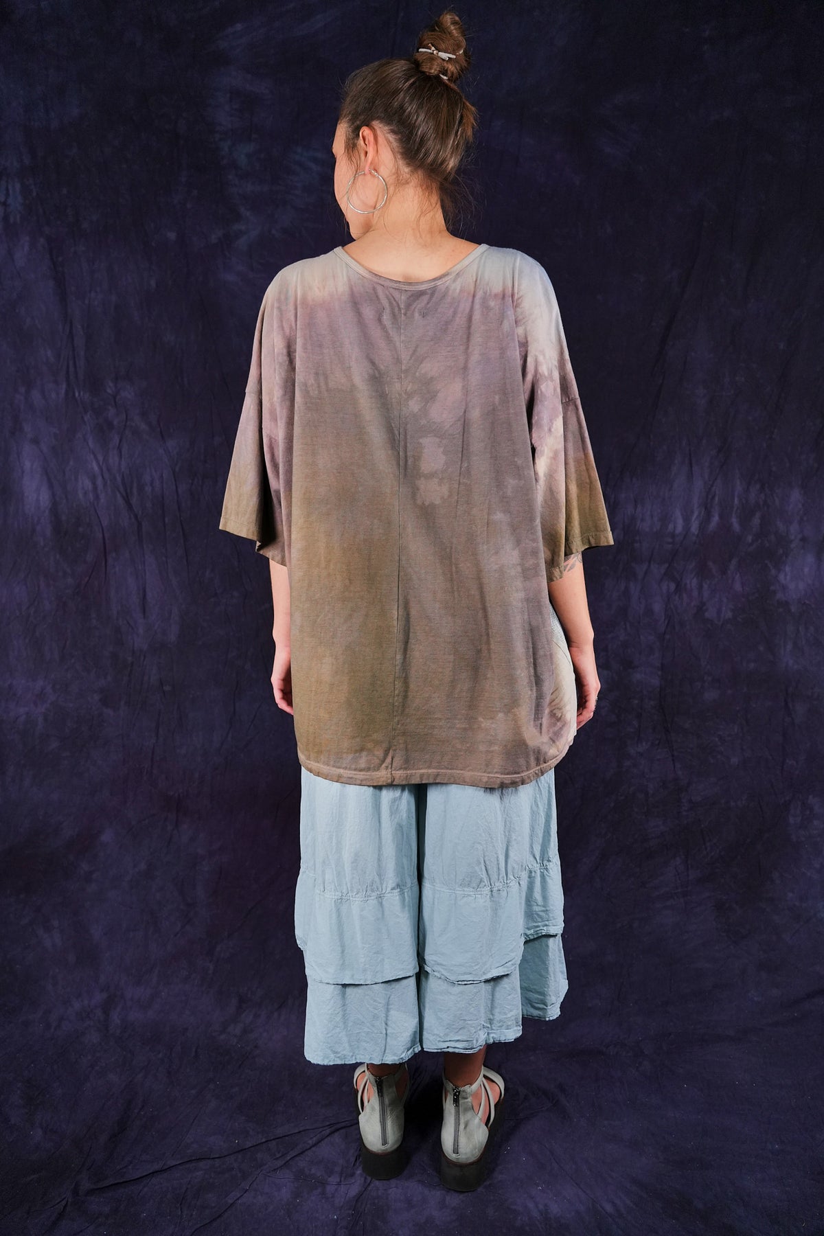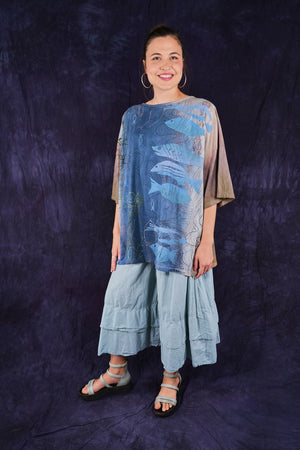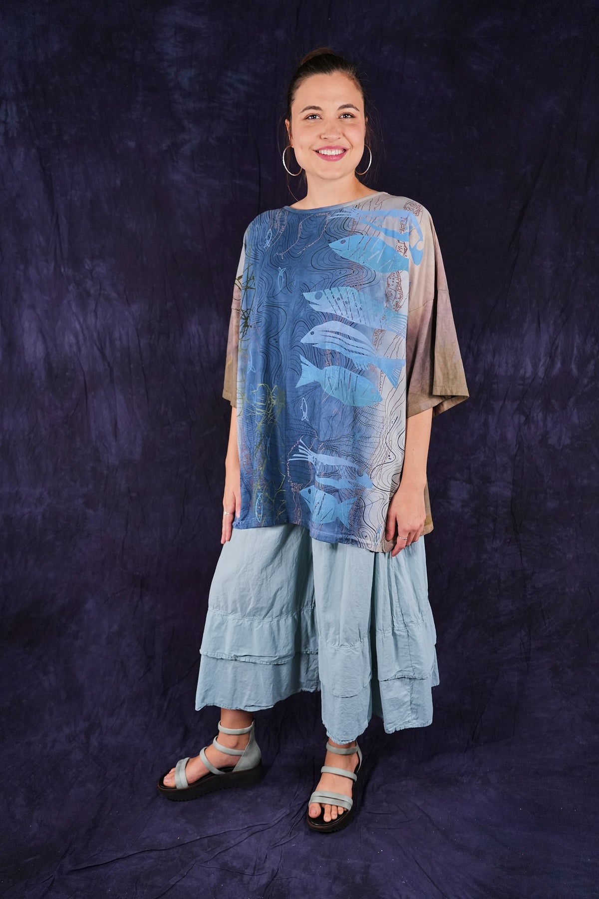 ONLY 1 LEFT!!!This hand dyed tee in multi tones and printed multi colored layers is one sized, boxy, wide organic cotton tunic is a wardrobe staple you'll want to wear all year long. All of us at Blue Fish HQ have at least a couple... this magical shape drapes beautifully to flatter every body type. Look closely at the print layers- so much print, in a gardenful of color and artful expression.