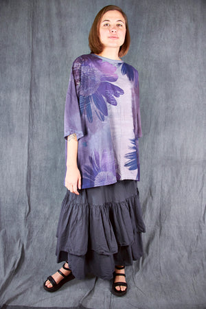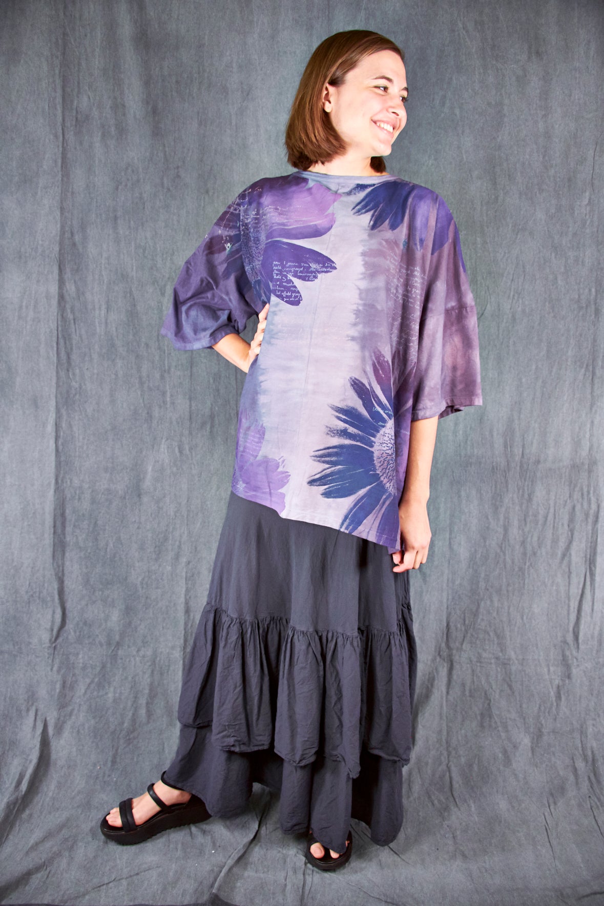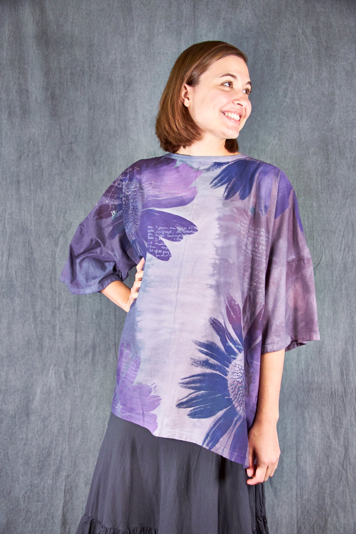 This one sized, boxy, wide organic cotton tunic is a wardrobe staple you'll want to wear all year long. All of us at Blue Fish HQ have at least a couple... this magical shape drapes beautifully to flatter every body type. Look closely at the print layers- so much print, in a gardenful of color and artful expression.