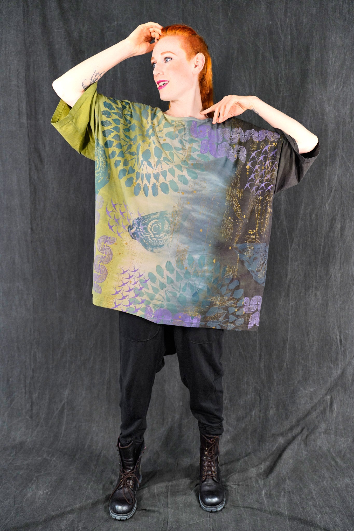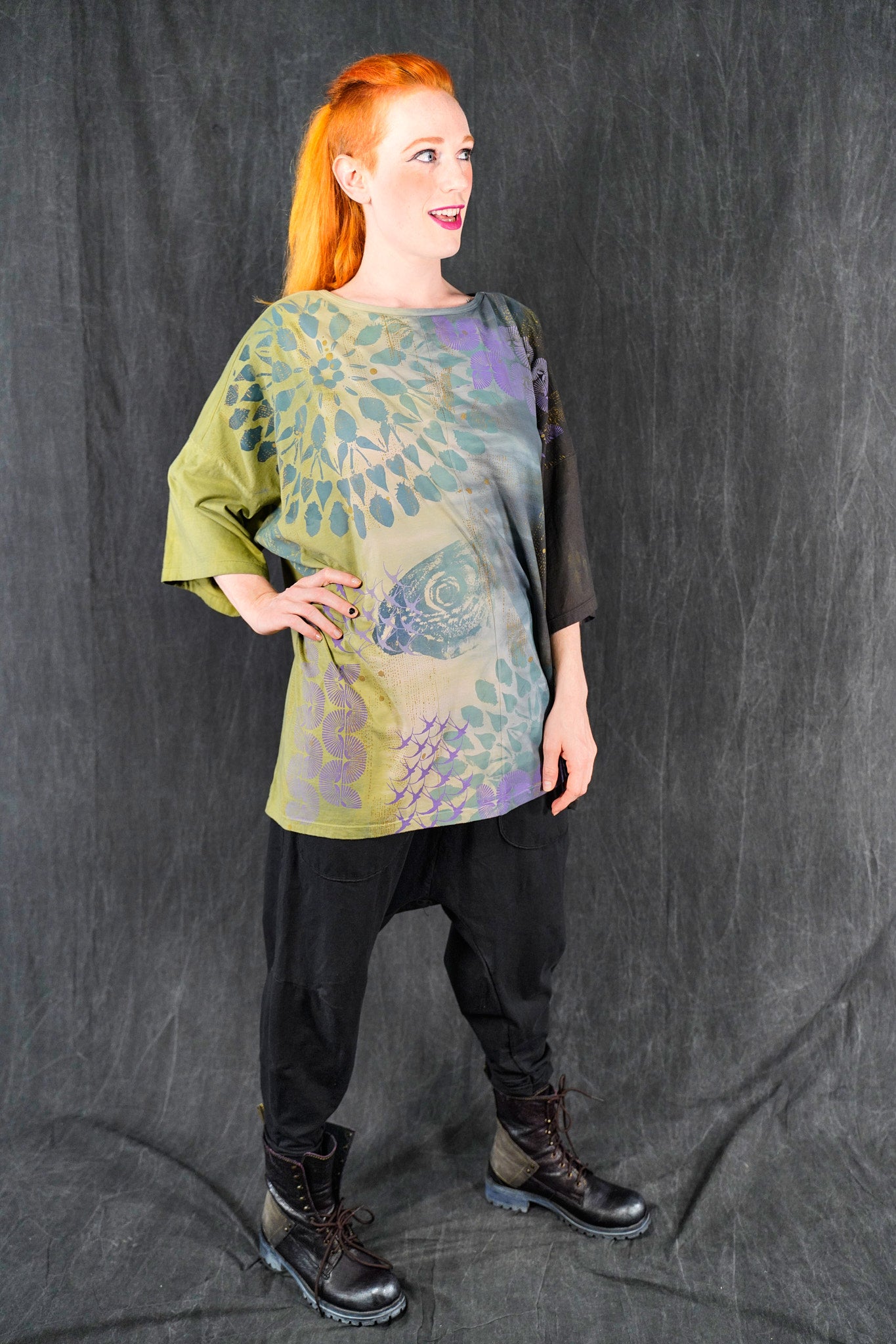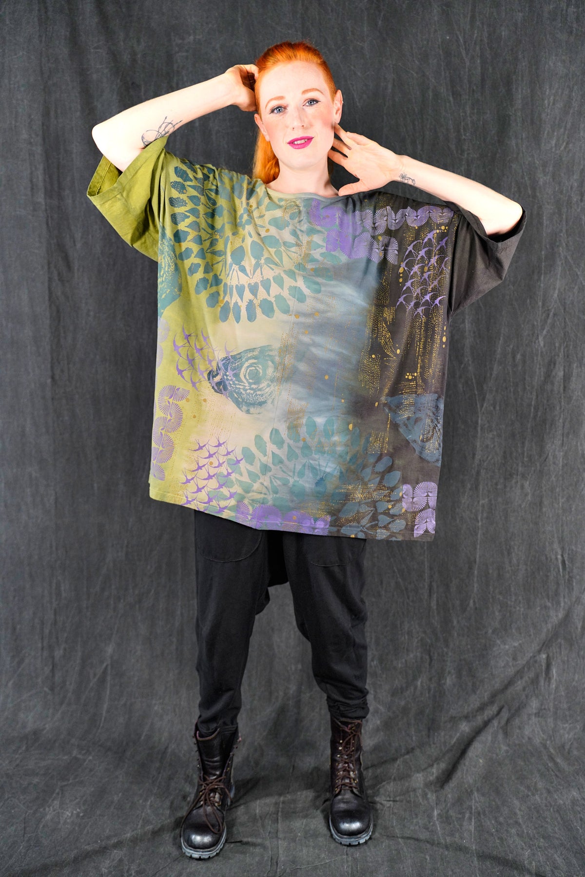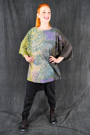This one sized, boxy, wide organic cotton tunic is a wardrobe staple you'll want to wear all year long. All of us at Blue Fish HQ have at least a couple... this magical shape drapes beautifully to flatter every body type. Look closely at the print layers- so much print, in a gardenful of color and artful expression.