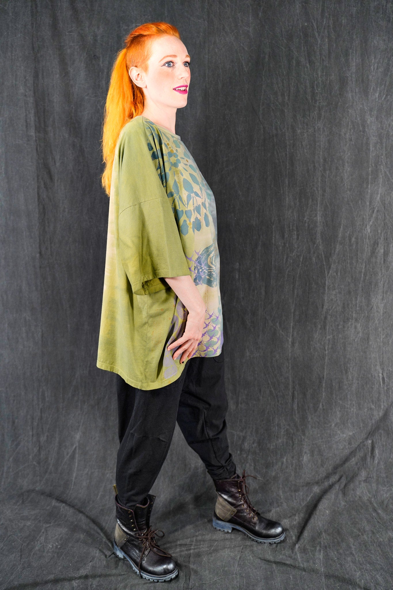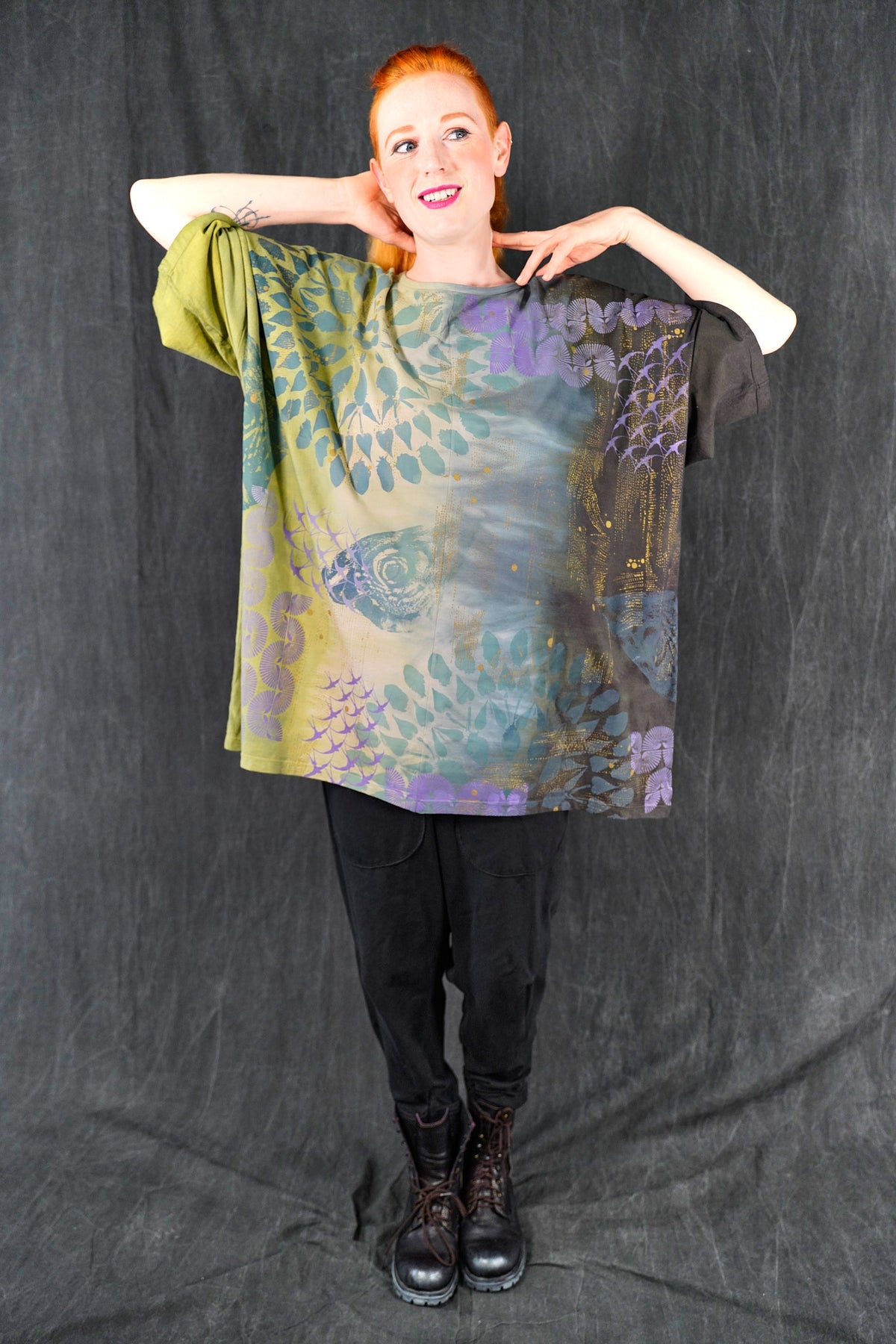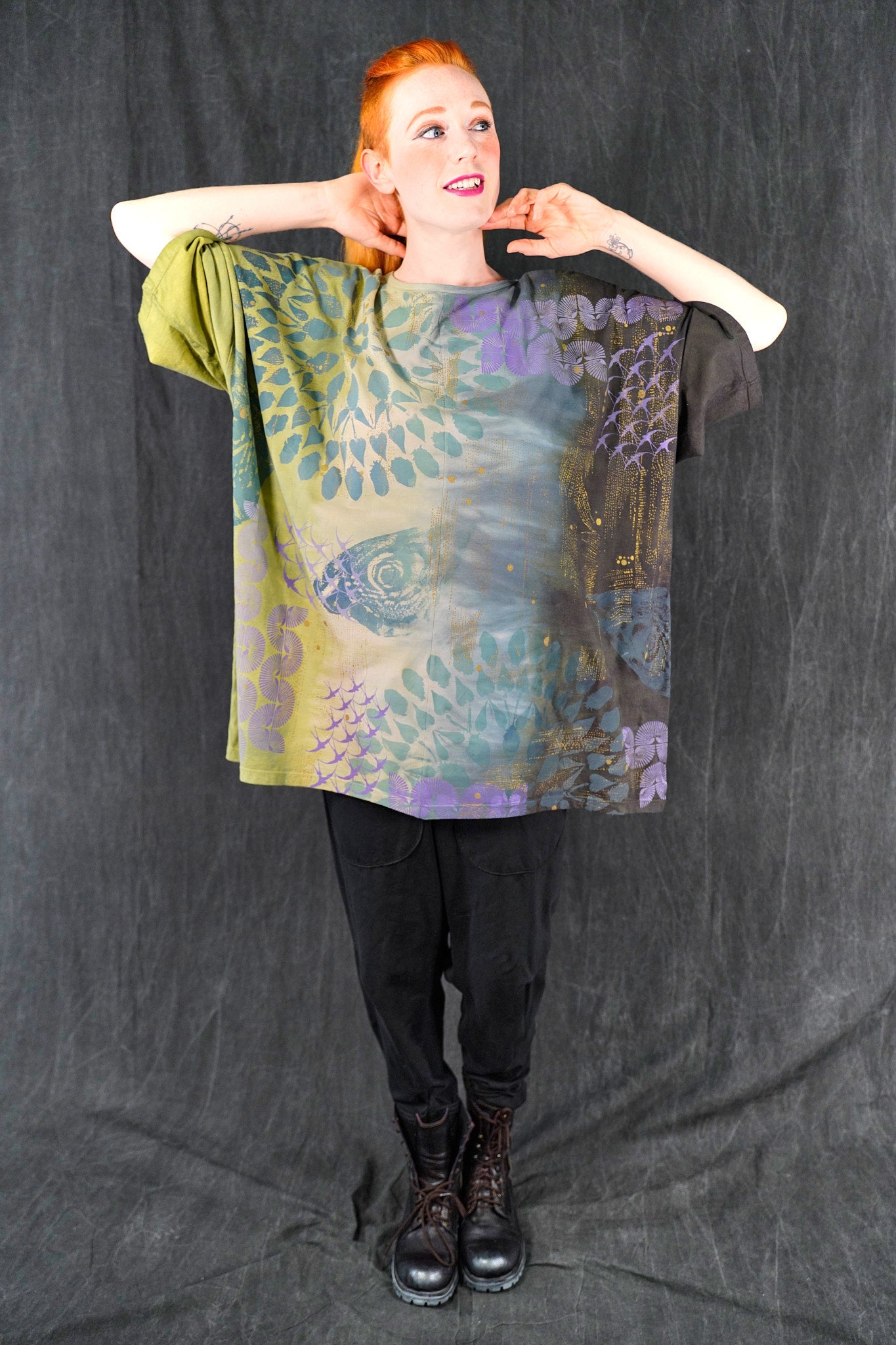 This one sized, boxy, wide organic cotton tunic is a wardrobe staple you'll want to wear all year long. All of us at Blue Fish HQ have at least a couple... this magical shape drapes beautifully to flatter every body type. Look closely at the print layers- so much print, in a gardenful of color and artful expression.