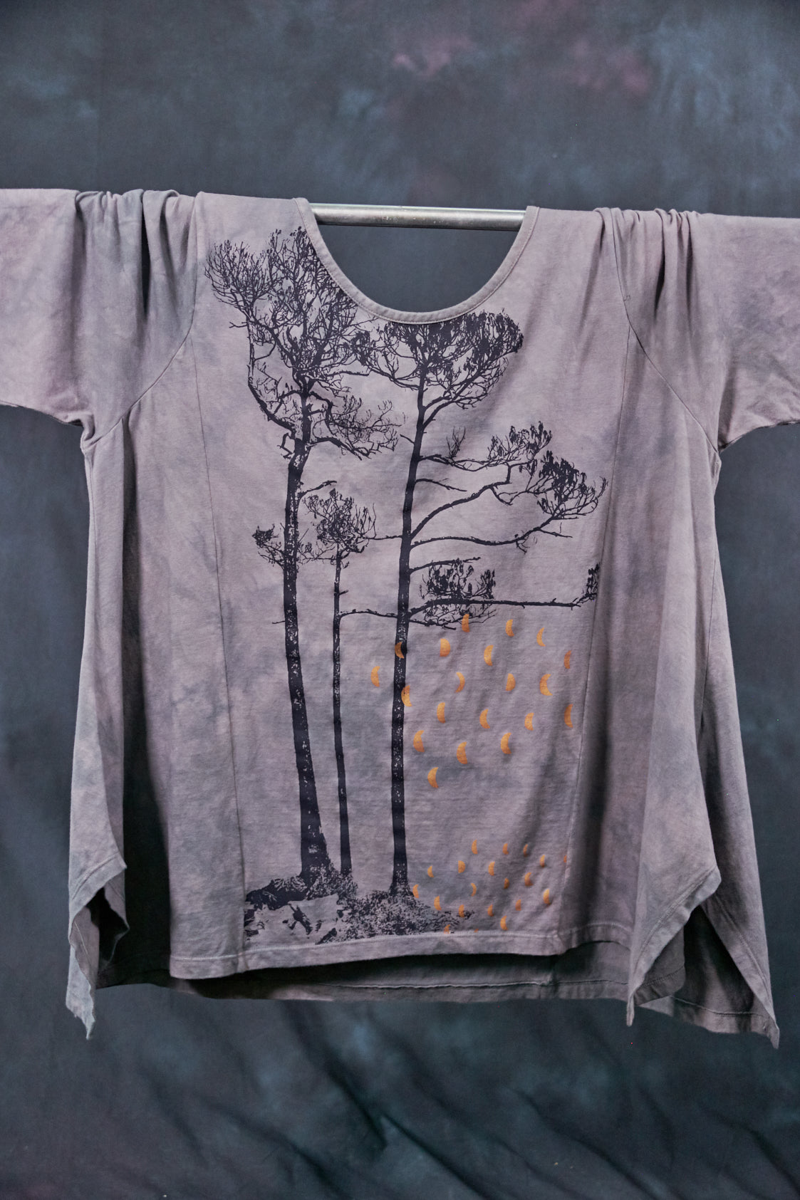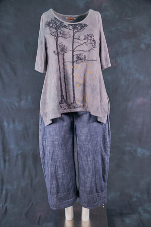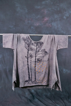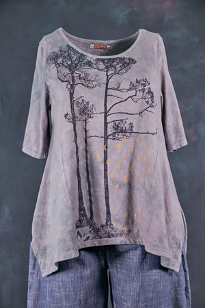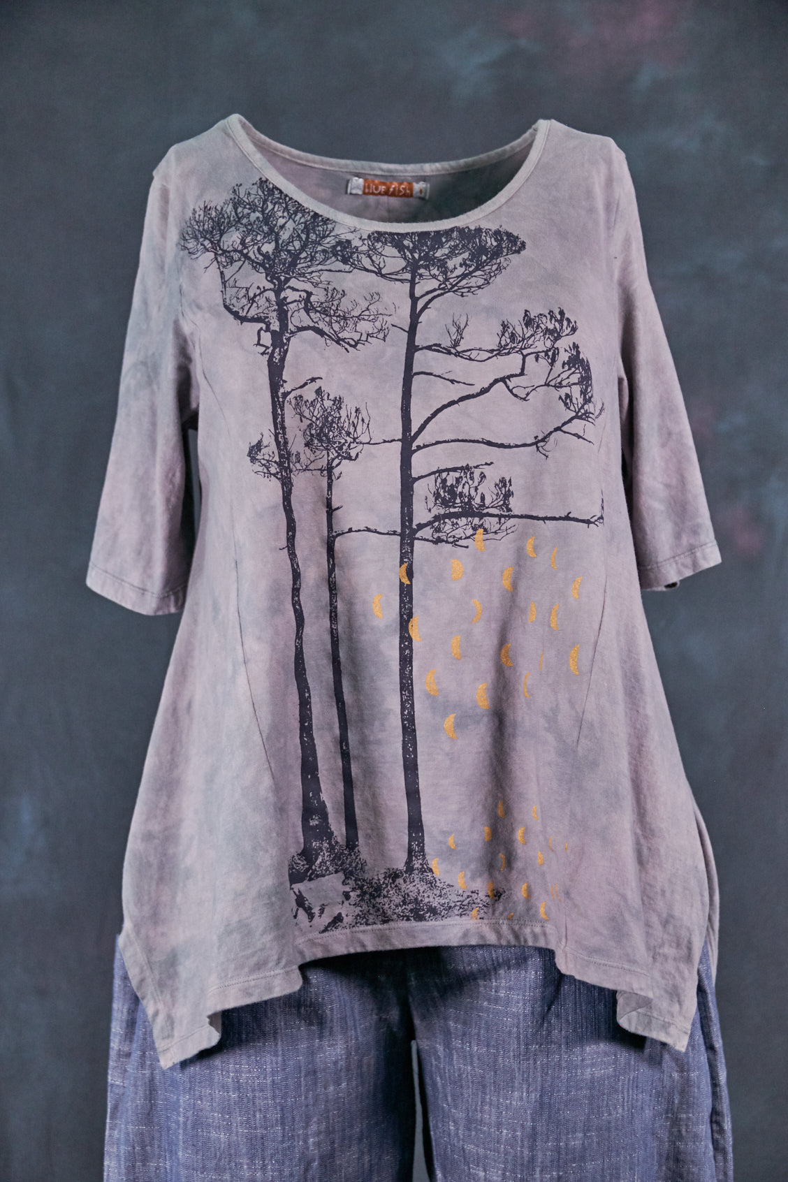 This favorite, limited-edition top was dyed by hand by Jen's son, Sam--in a gorgeous neutral tones and beautiful textural patterning. Our artists have layered several subtle patterned screens to achieve an ethereal effect, look closely at the print- it is gorgeous and hard to see the depth of detail in a photo! ( A comment we often hear is, " It's even better than i thought it would be" when received:)...) All body types look fabulous in this wonderfully swing-y tee. Panels on the side give a distinctly Blue Fish shape (zoom in to see details on the pictures).
