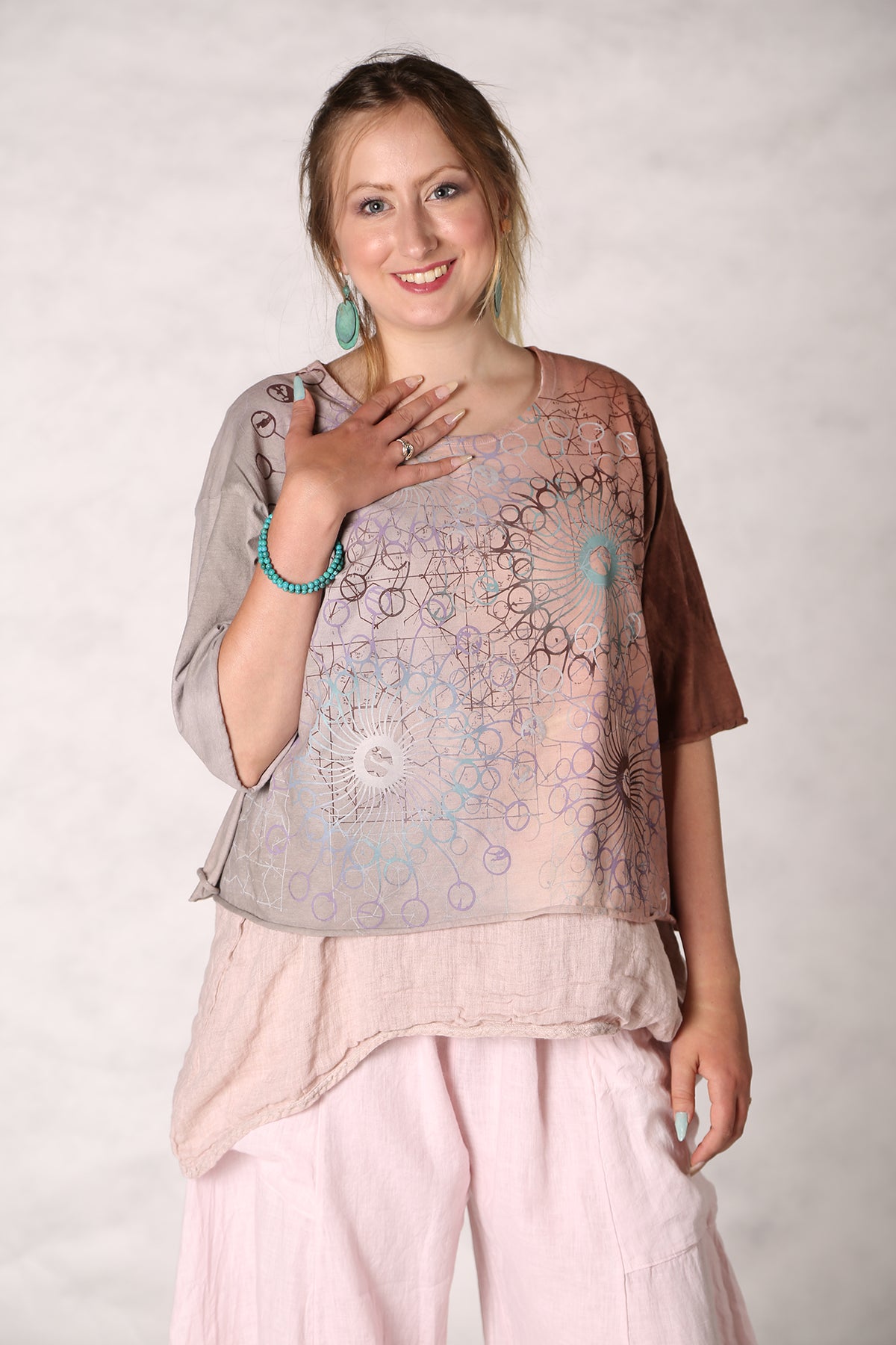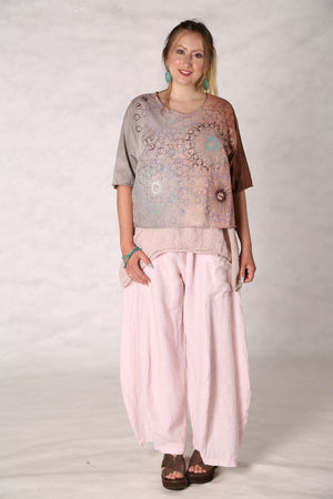 This super-fun tee is a great way to add interest to an outfit with an artfully printed top layer. Or wear under a midlayer or sleeveless frock. Sleeves hit just below the elbow. The hem has a gentle up-curve, and rolled raw edge for textural interest.