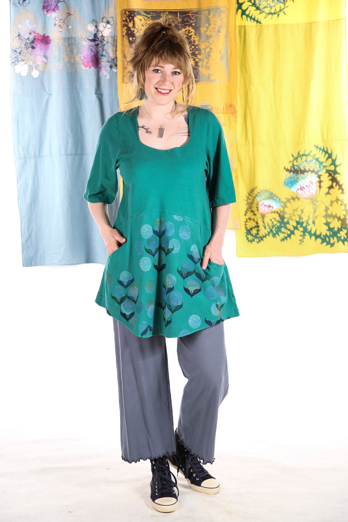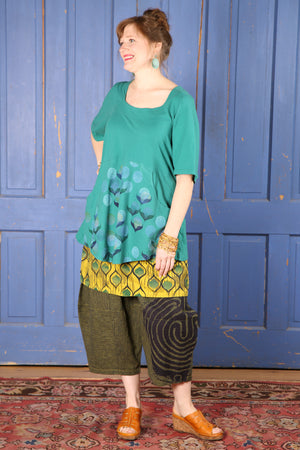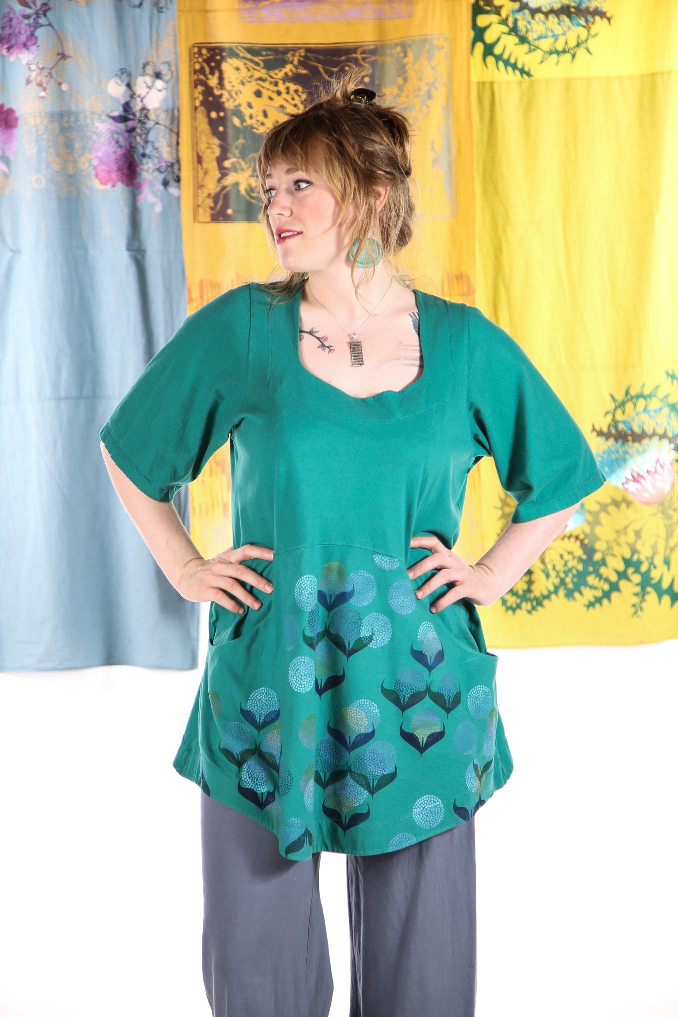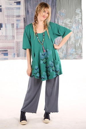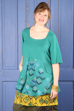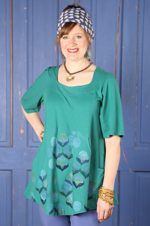 A beautifully feminine top fit for an artful queen of comfort and style. This flattering tunic features a softly squared neckline and gentle shaping through the bodice, ending in a slightly flared hemline. Set-in functional pockets and the softest organic cotton jersey make this top a dream to wear. Sleeves hit just above the elbow. 100% lightweight organic cotton knit, pre-shrunk.