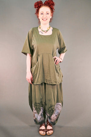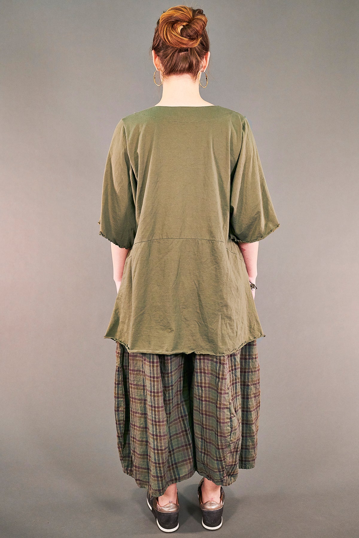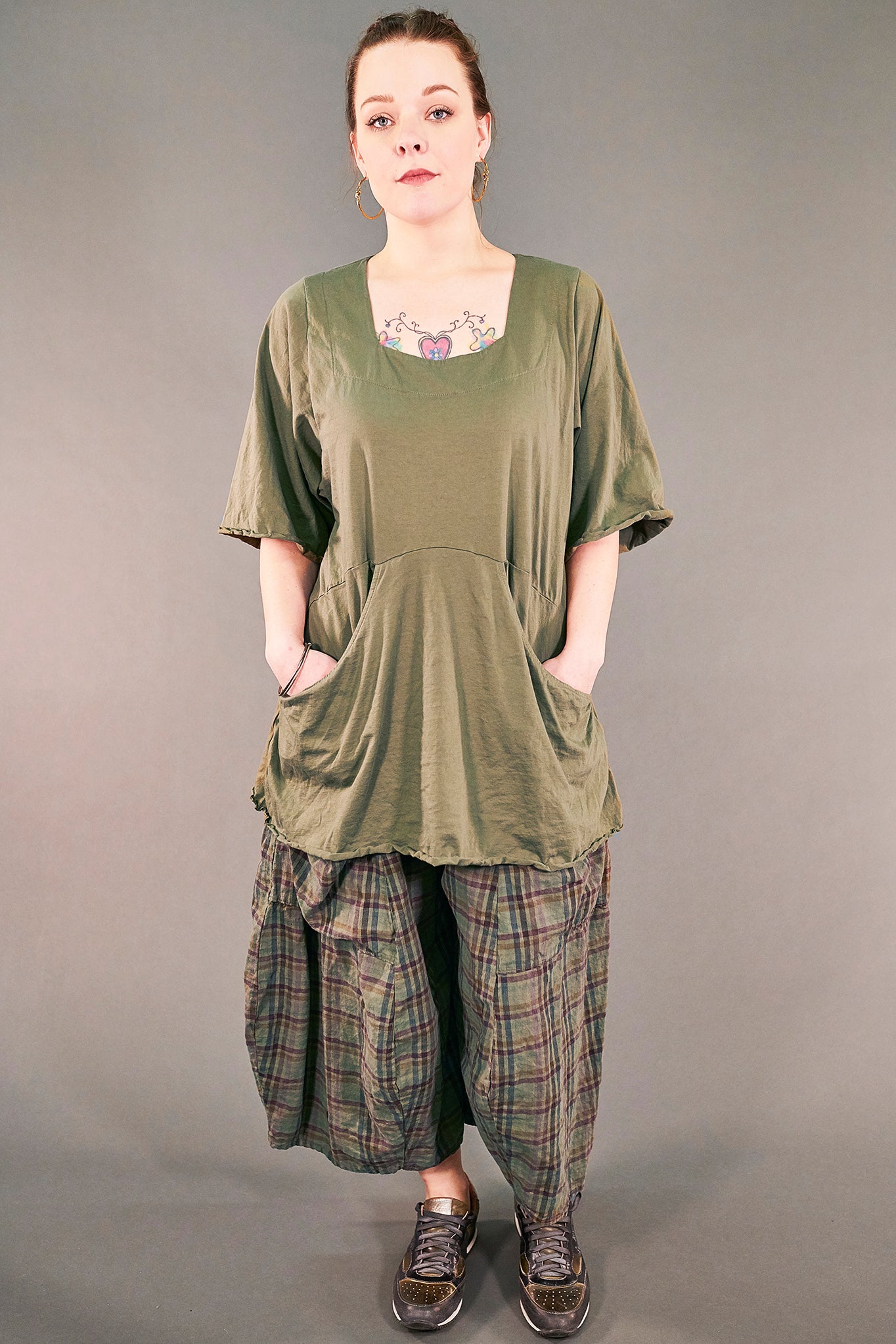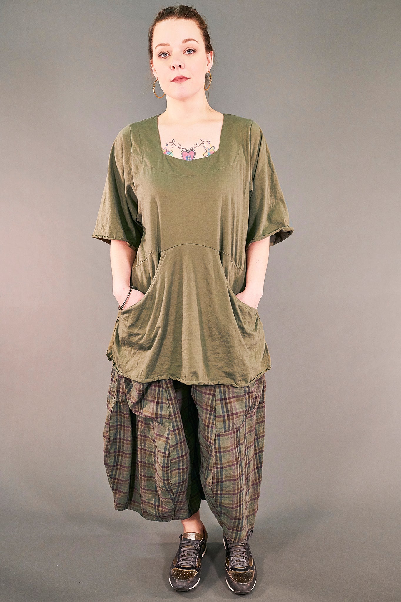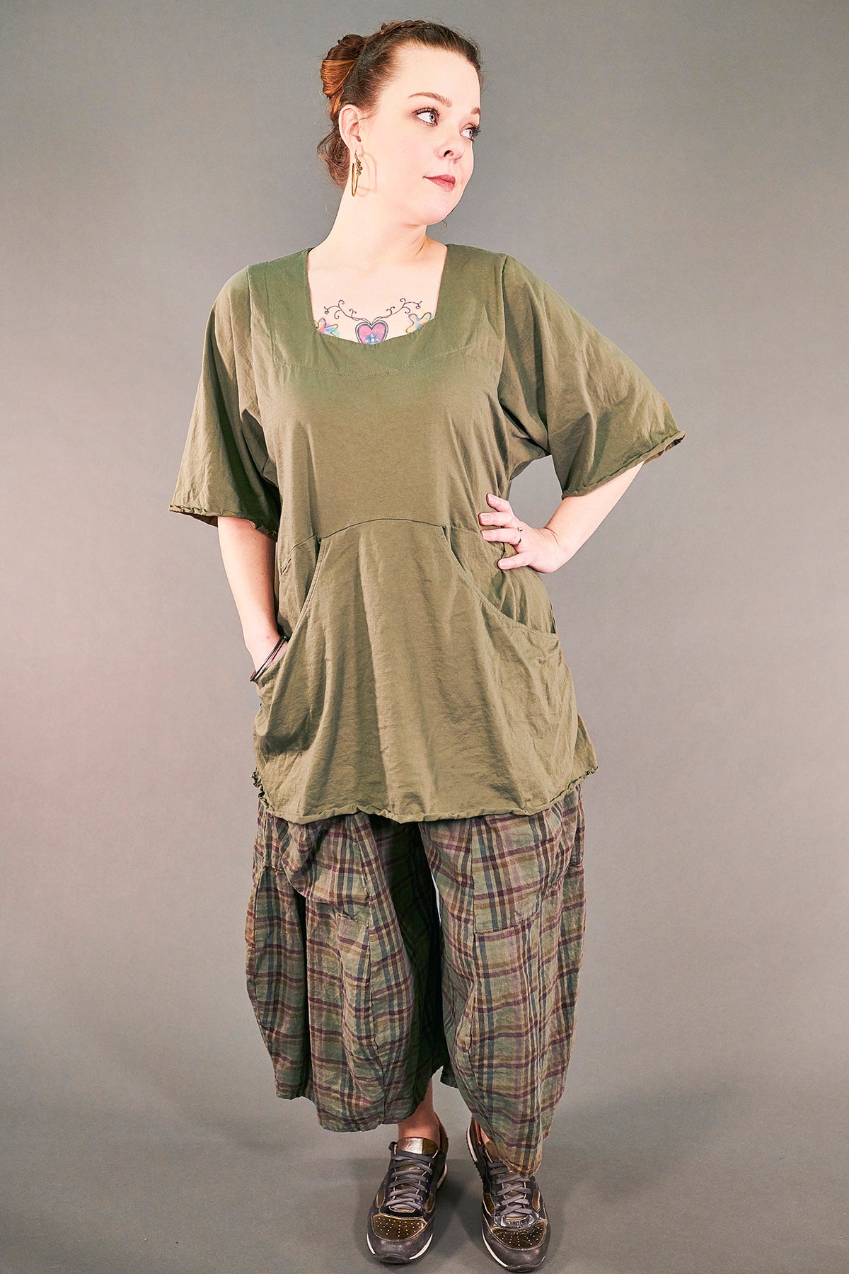 A beautifully feminine top fit for an artful queen of comfort and style. This flattering tunic features a softly squared neckline and gentle shaping through the bodice, ending in a slightly flared hemline. Set-in functional pockets and the softest organic cotton jersey make this top a dream to wear. Sleeves hit just above the elbow. This limited edition tunic will sell out quickly, order now for best selection!