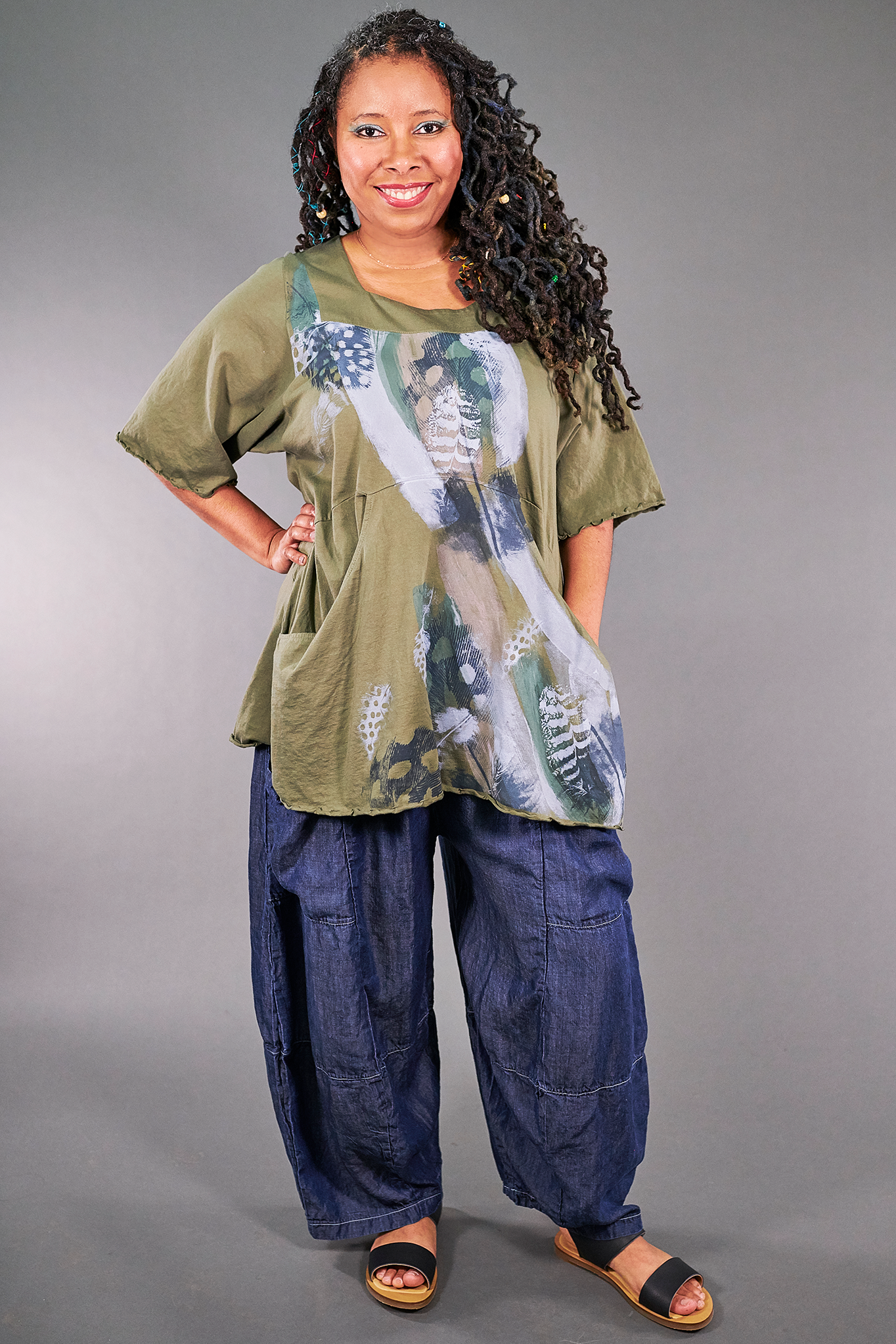 A beautifully feminine top fit for an artful queen of comfort and style. This flattering tunic features a softly squared neckline and gentle shaping through the bodice, ending in a slightly flared hemline. Set-in functional pockets and the softest organic cotton jersey make this top a dream to wear. Sleeves hit just above the elbow.  This limited edition tunic will sell out quickly, order now for best selection!