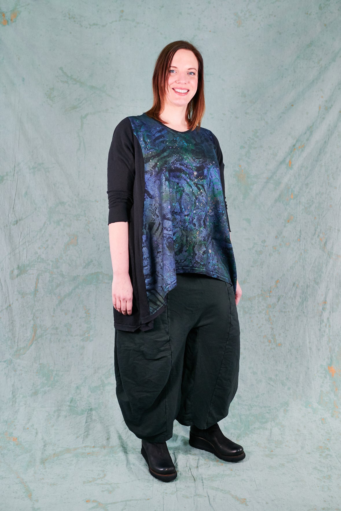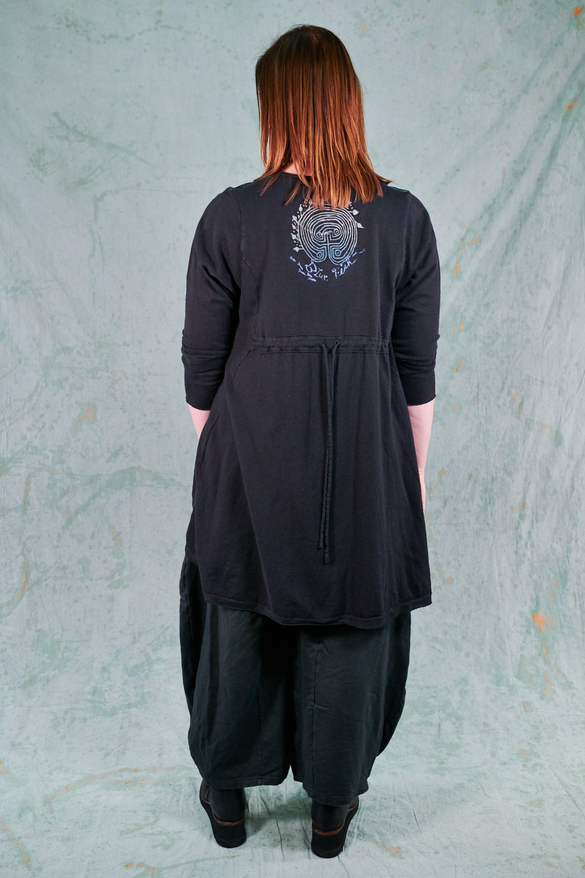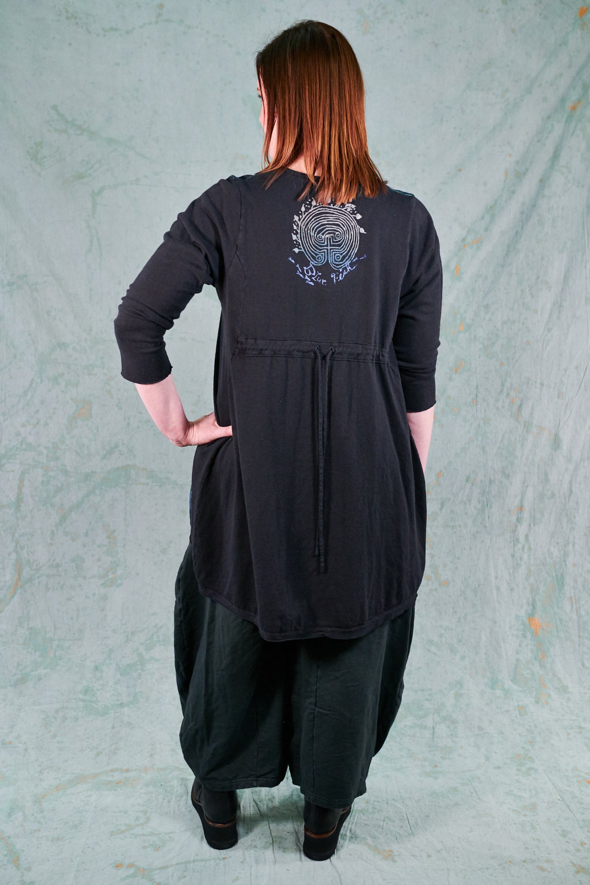 A very popular high-low cut design with flattering princess seaming in front. Made from a hemp/organic cotton knit. There is a tie in the back to adjust shape to fit, or leave loose and flowing.