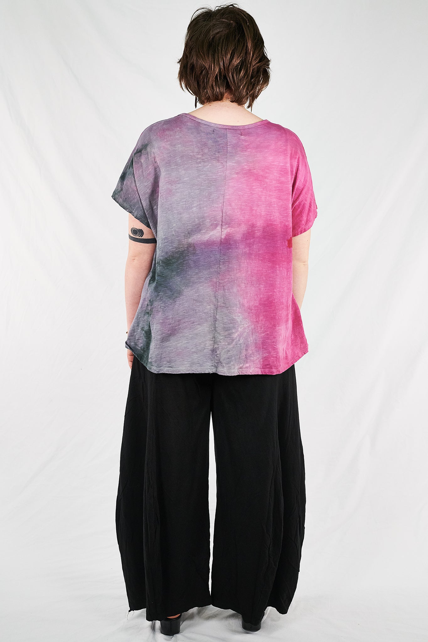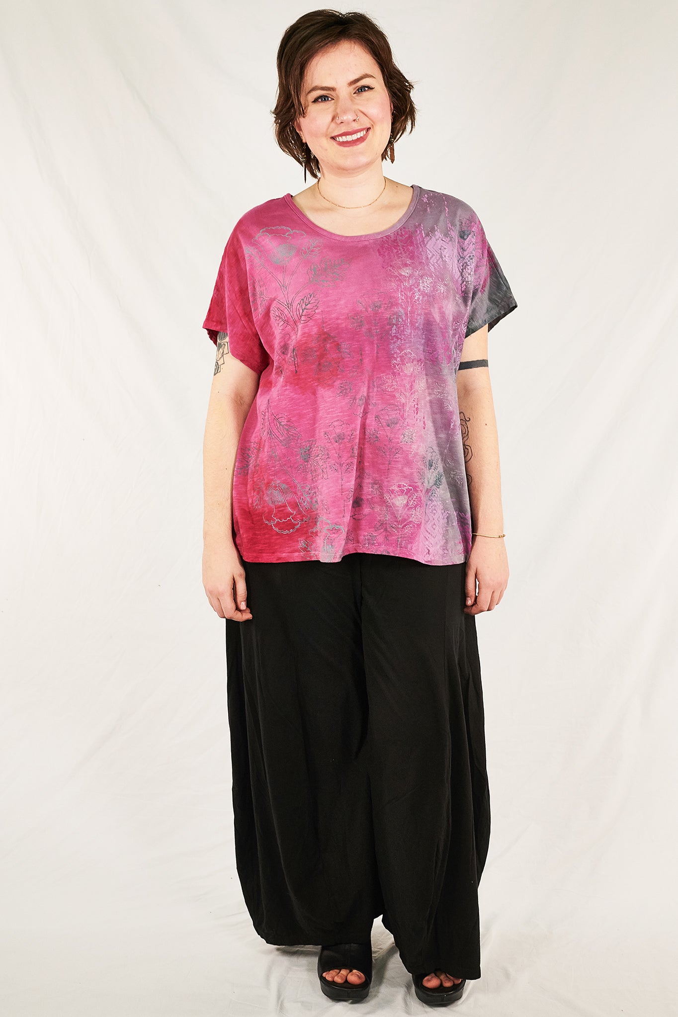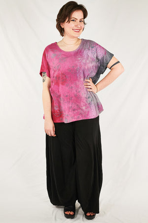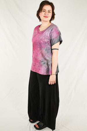 Pink and storm tones, pretty organic cotton art tunic to wear now and all summer...New colorful & magical multi-layered designs in color drenched shades that we have hand printed for maximum effect. Limited quantities. Double hand dyed and layered multi-tonal printing.