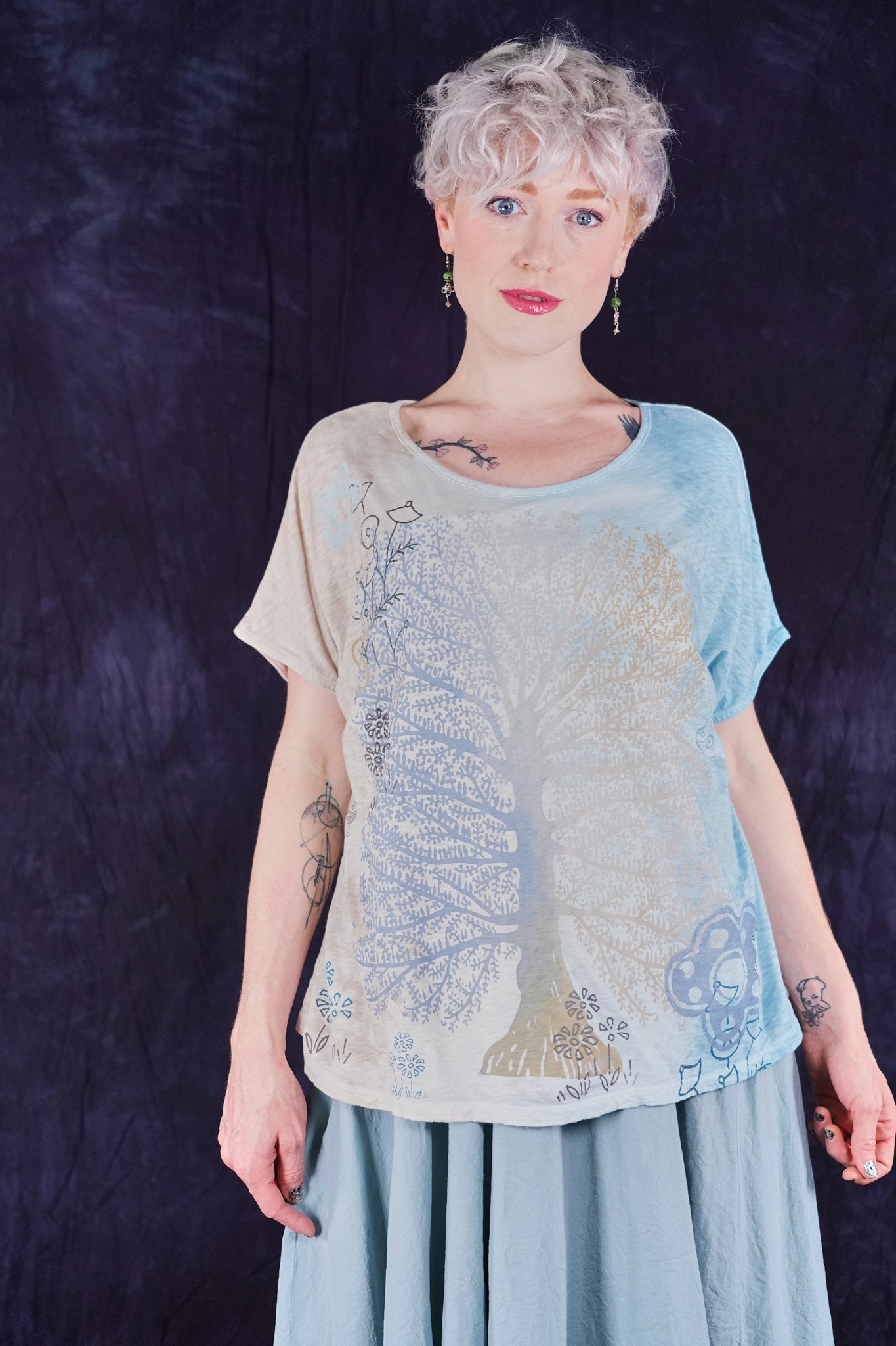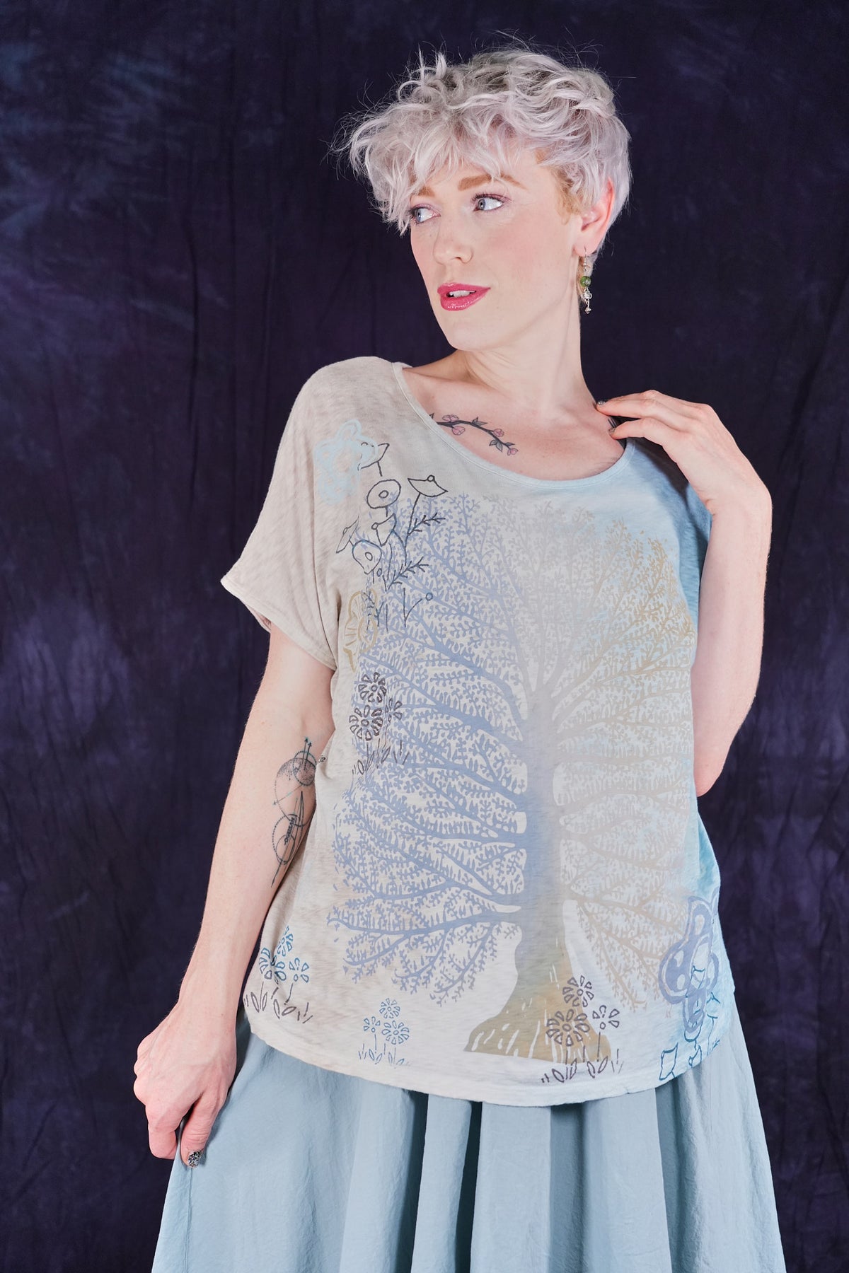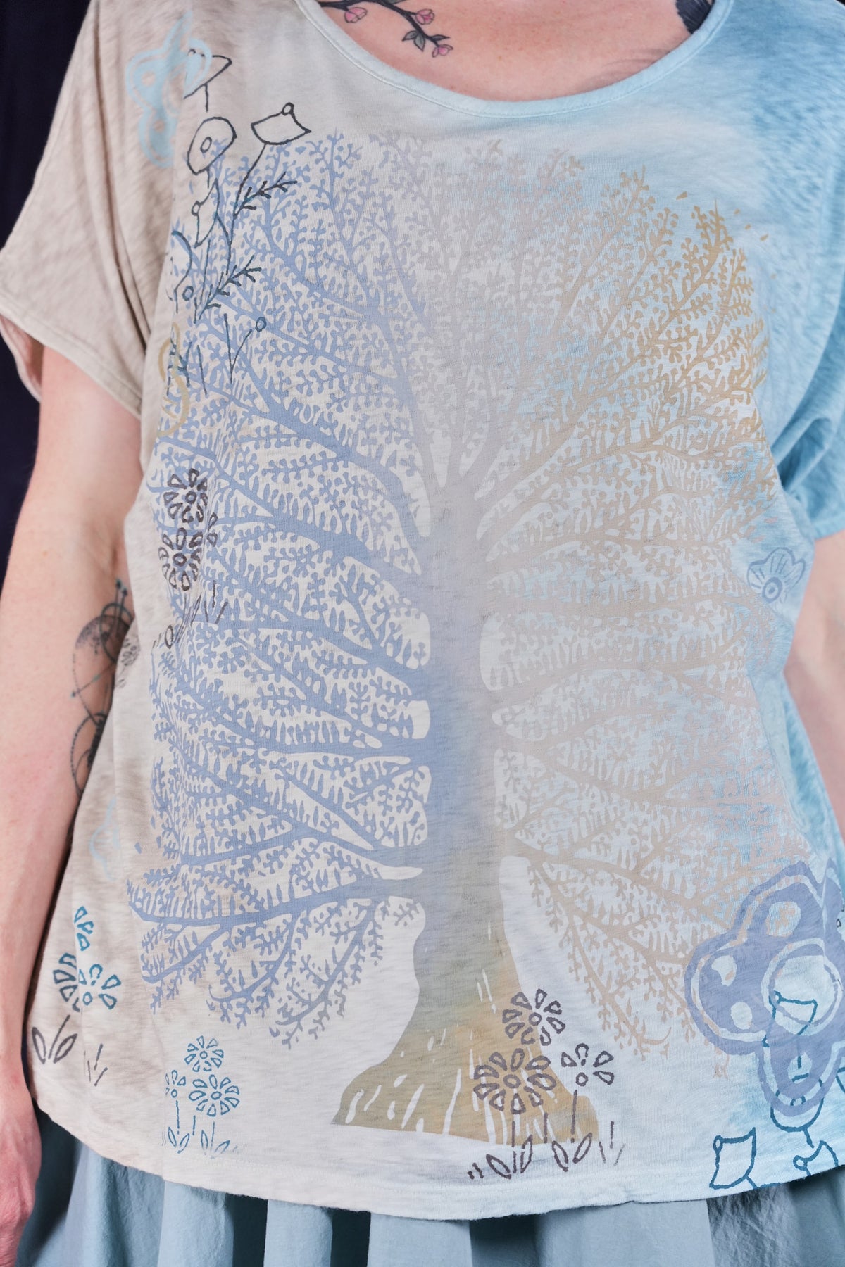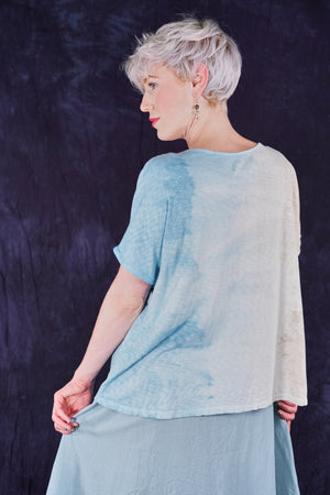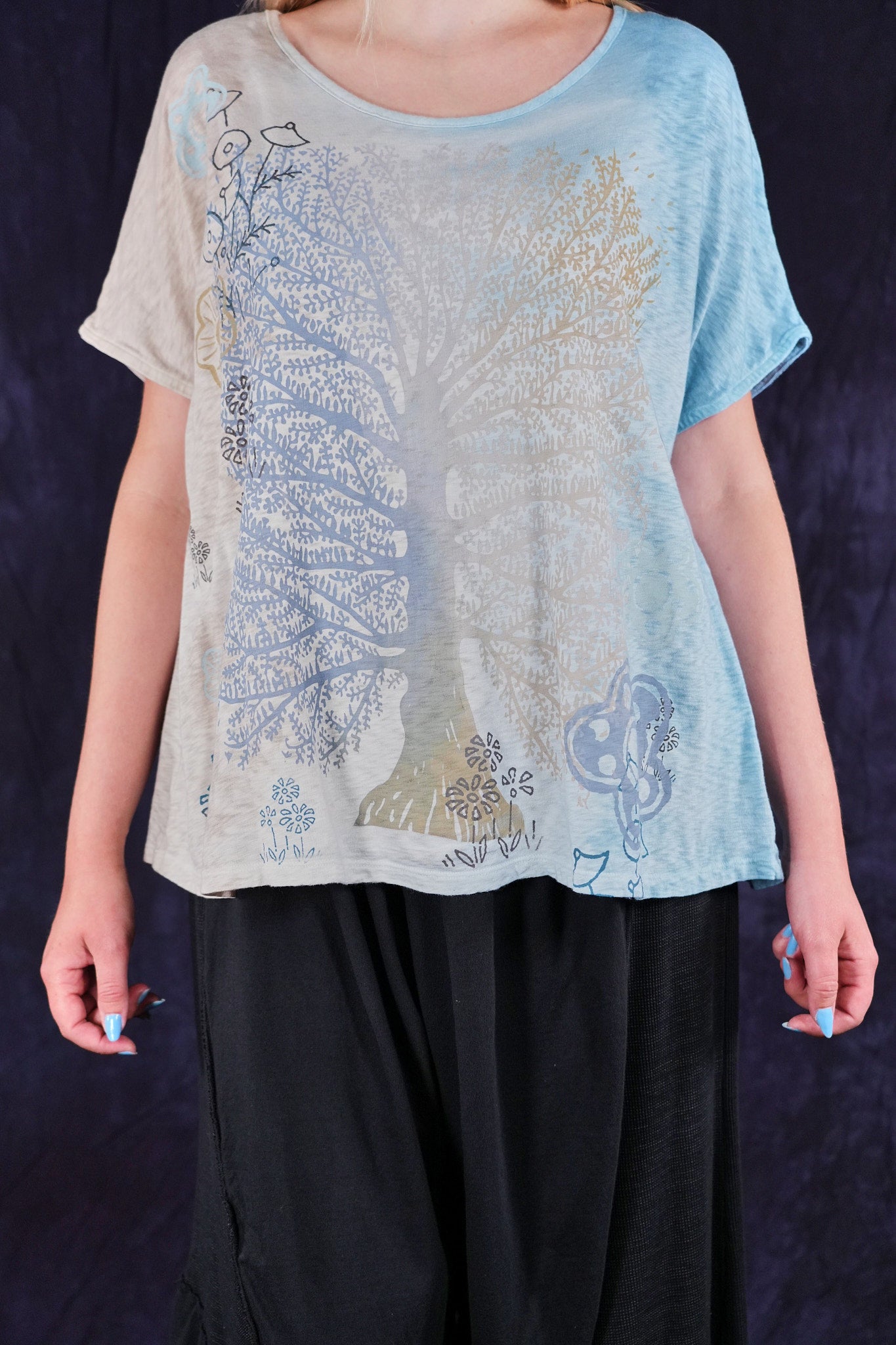 A fun, artful, & creative organic cotton top bound to make you smile! New colorful & magical multi-layered designs in color drenched shades that we have hand printed for maximum effect. Limited quantities. Perfect for layering! Wear over the #6229 Chambray shift with the crop #3242 Mojo Pant and create a summer wardrobe staple!