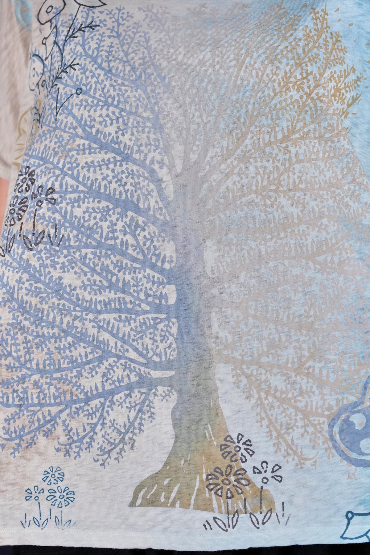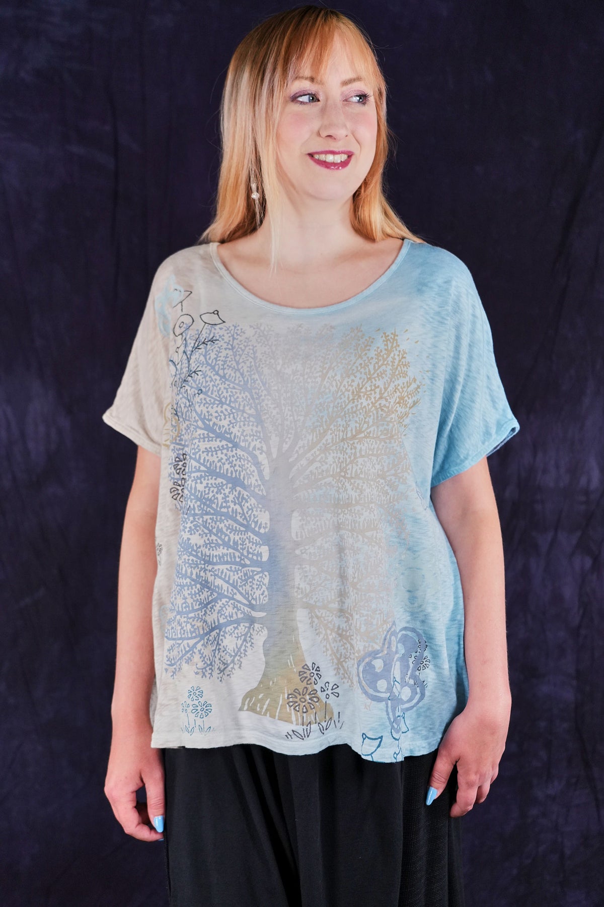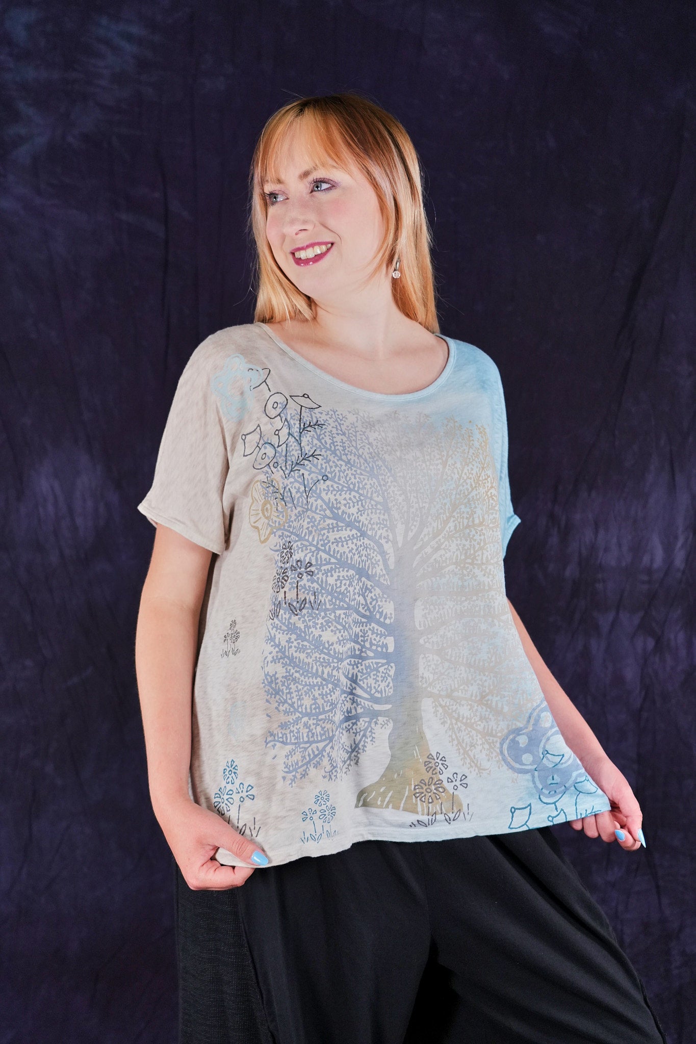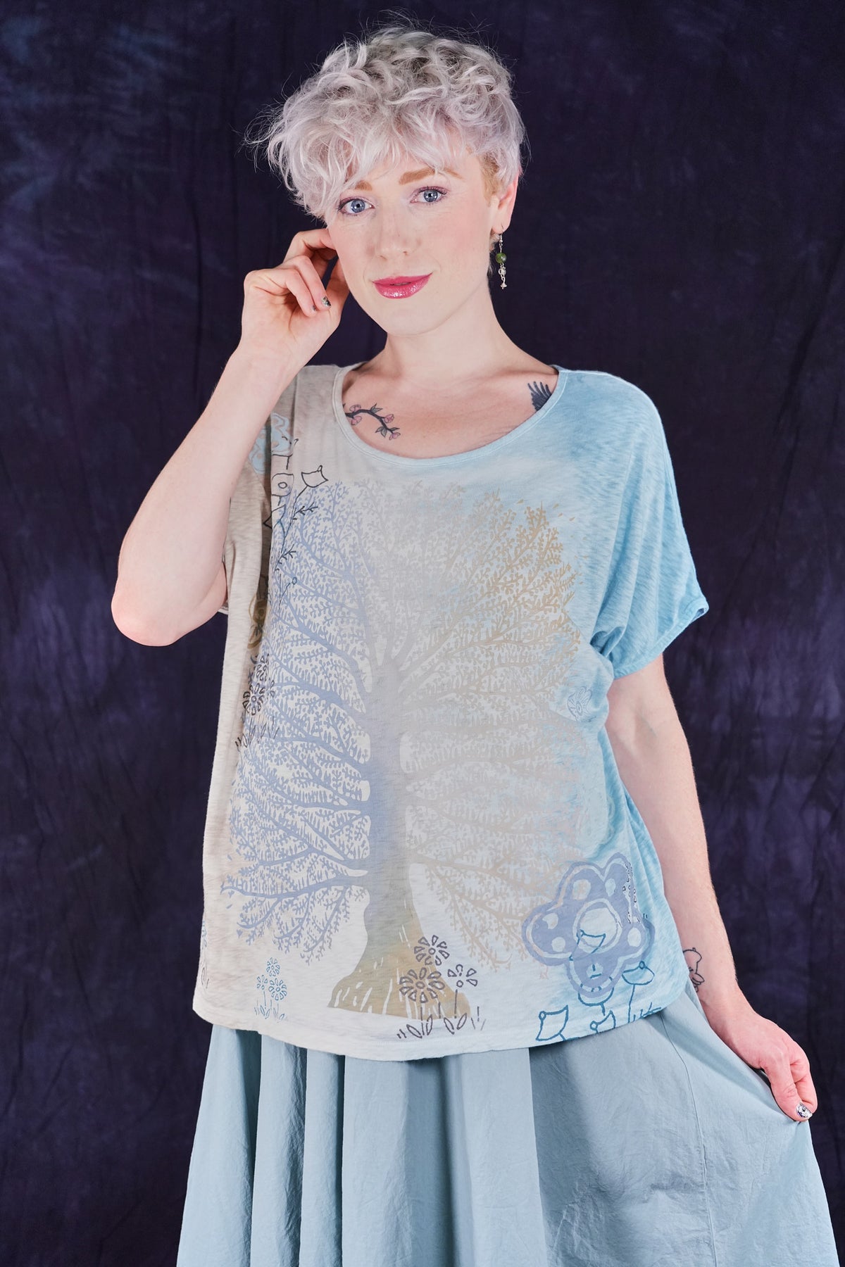 A fun, artful, & creative organic cotton top bound to make you smile! New colorful & magical multi-layered designs in color drenched shades that we have hand printed for maximum effect. Limited quantities. Perfect for layering! Wear over the #6229 Chambray shift with the crop #3242 Mojo Pant and create a summer wardrobe staple!
