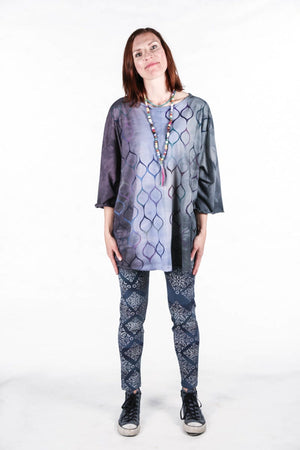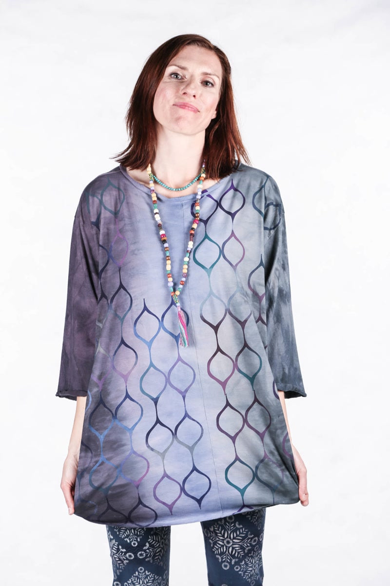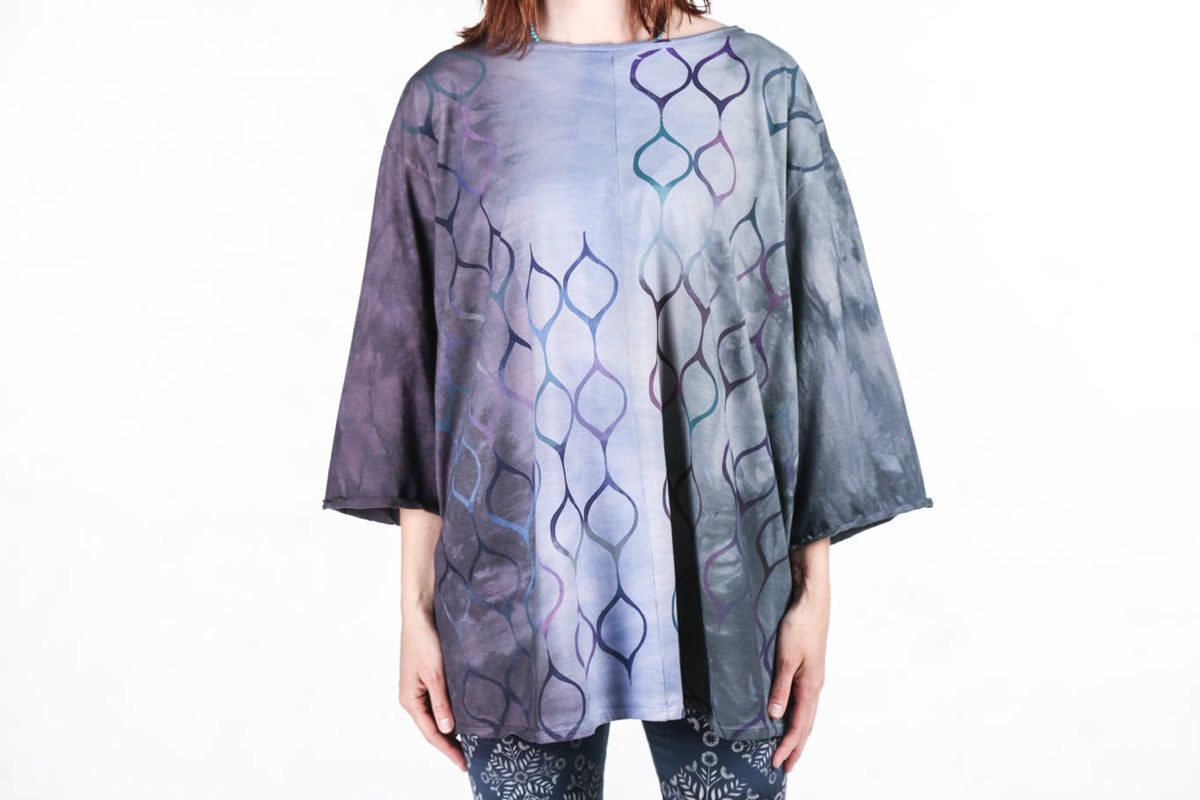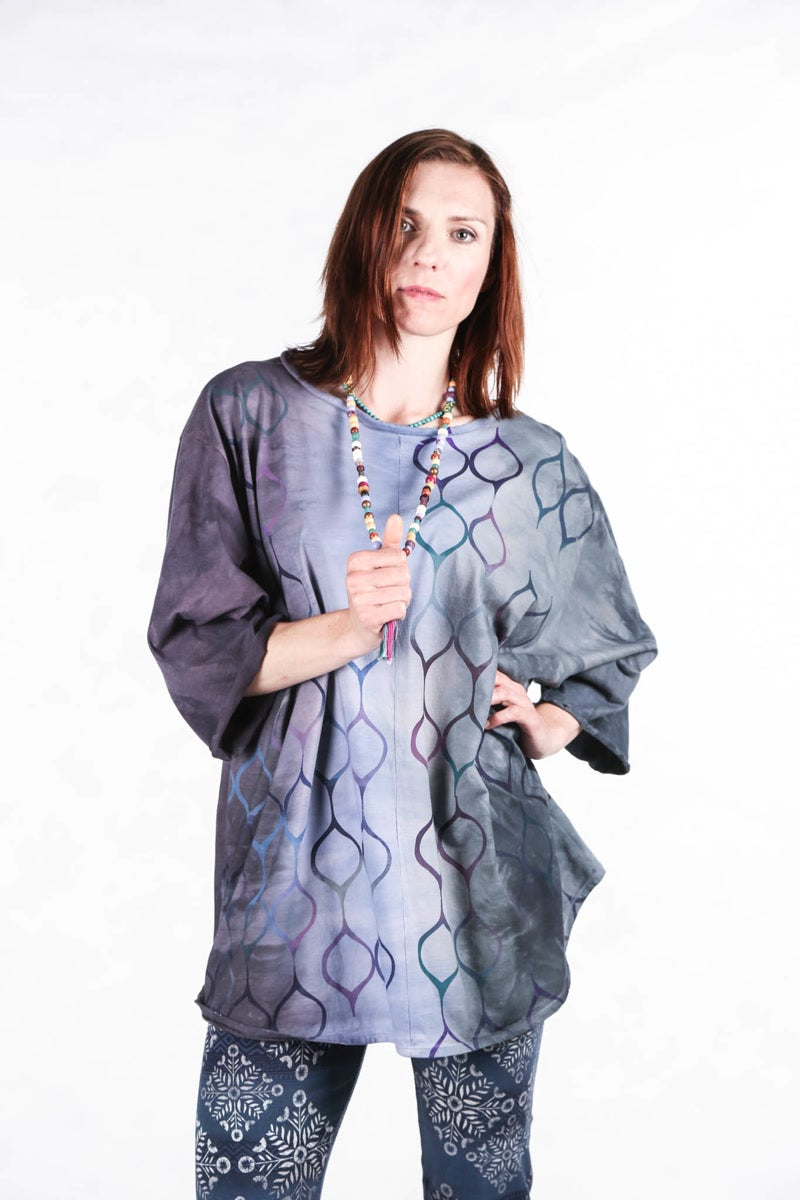 Perfect one-size soft, organic cotton tunic to wear now and all summer...New colorful & magical designs in color drenched shades that we have hand printed for maximum effect. Limited quantities. Double hand dyed and layered multi-tonal printing. Very oversized. Perfect for lounging.