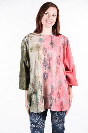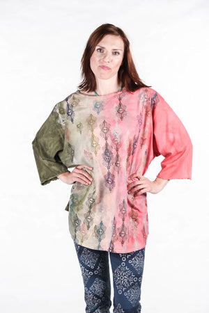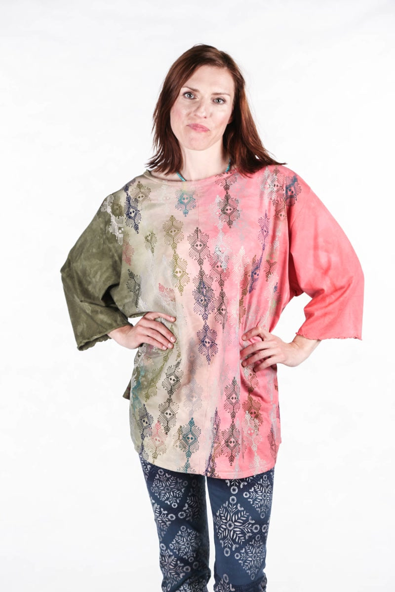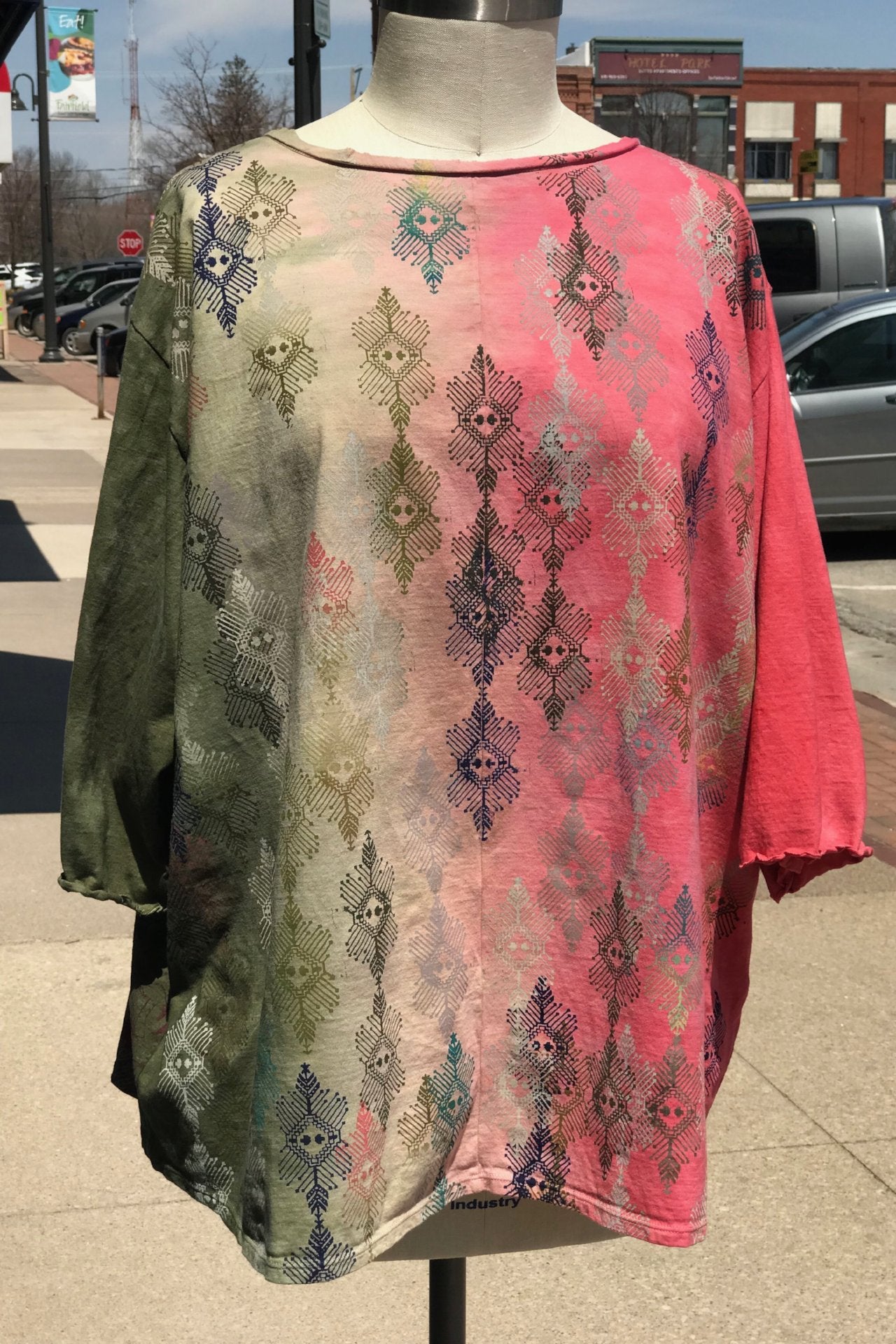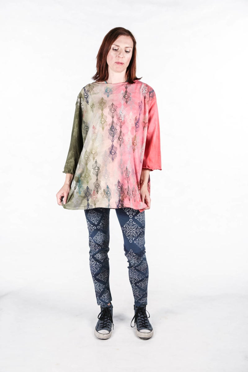 Perfect one-size soft, organic cotton tunic to wear now and all summer...New colorful  & magical designs in color drenched shades that we have hand printed for maximum effect. Limited quantities. Double hand dyed and layered multi-tonal printing. Very oversized. Perfect for lounging.