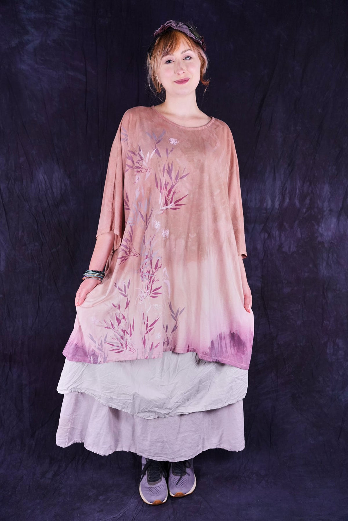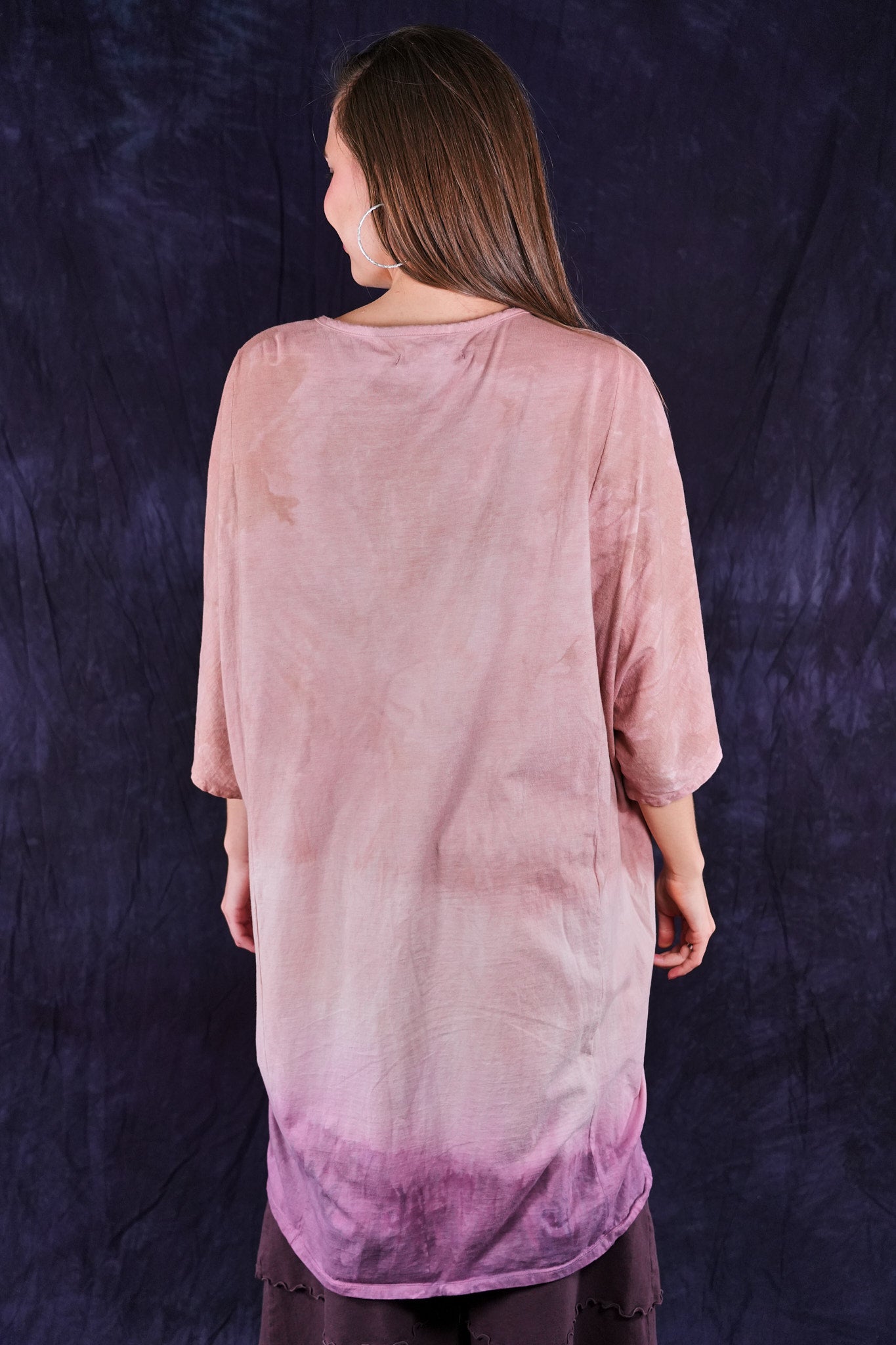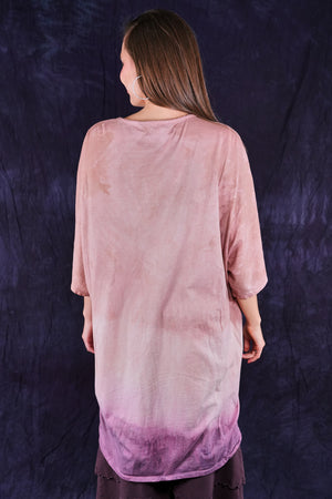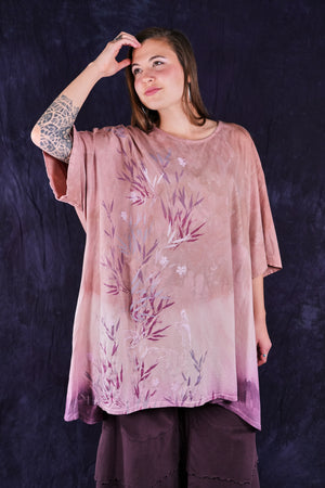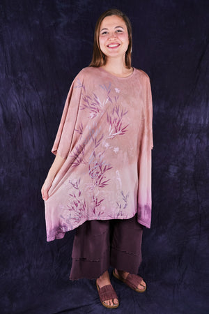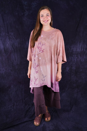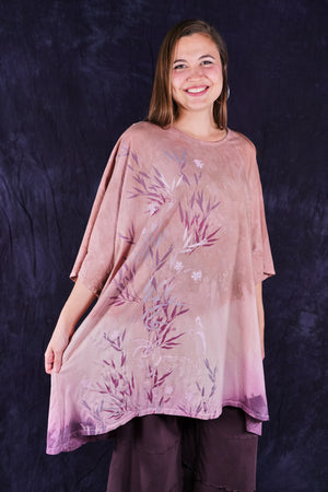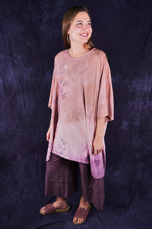 This one-size, organic cotton tunic is hand dyed in a Studio Intensive Process including special layered hand dyeing process, plus hand printing in multiple subtle shades adorn the front with layers & layers of delicate, imaginative imagery from our Fairfield, Iowa studio. Our artists loved decorating these! The large, square size gives us lots of space for printing--each is a “walking canvas” of visual artistic delight.