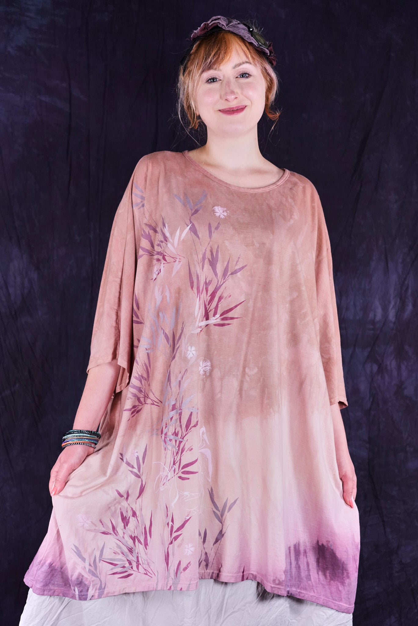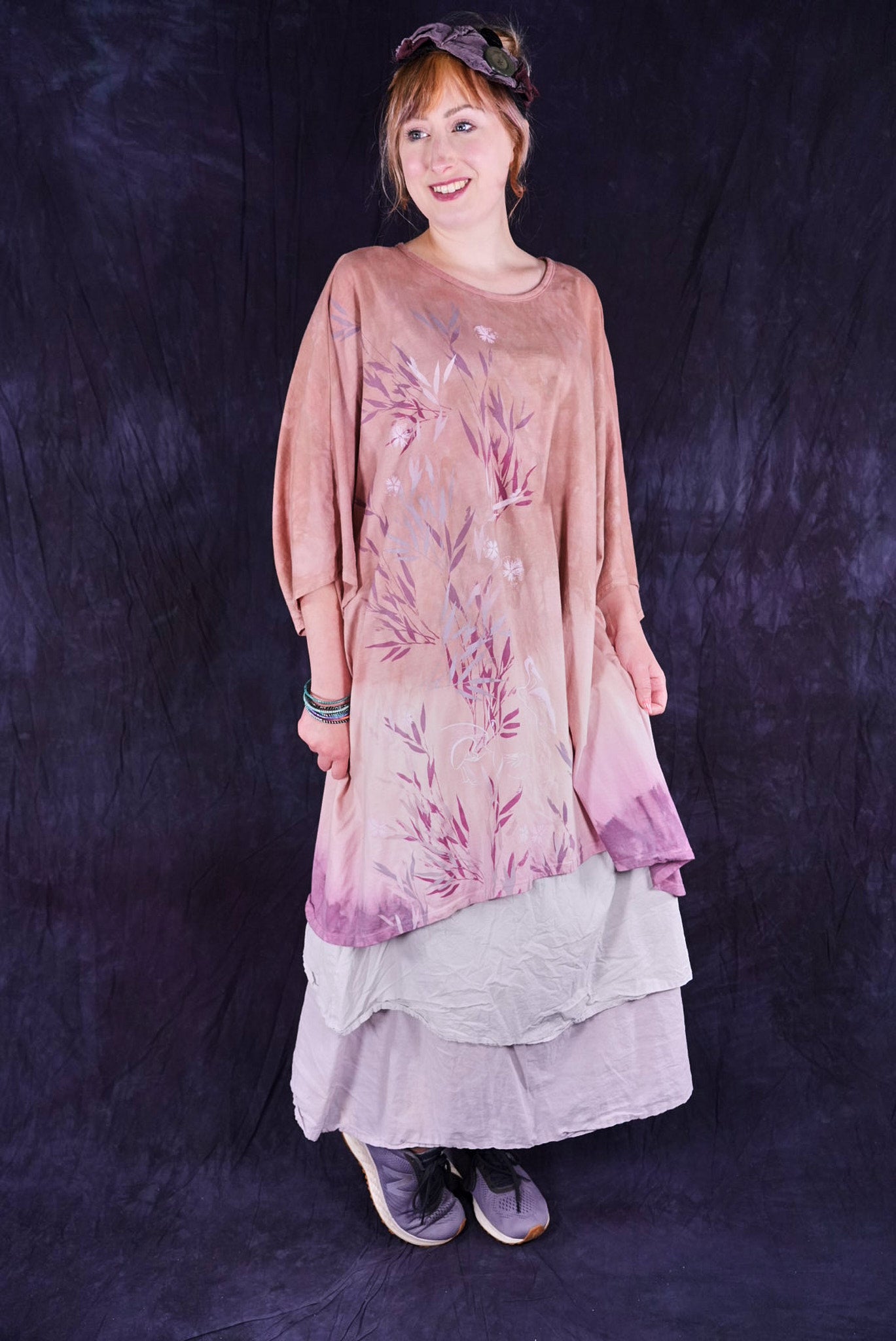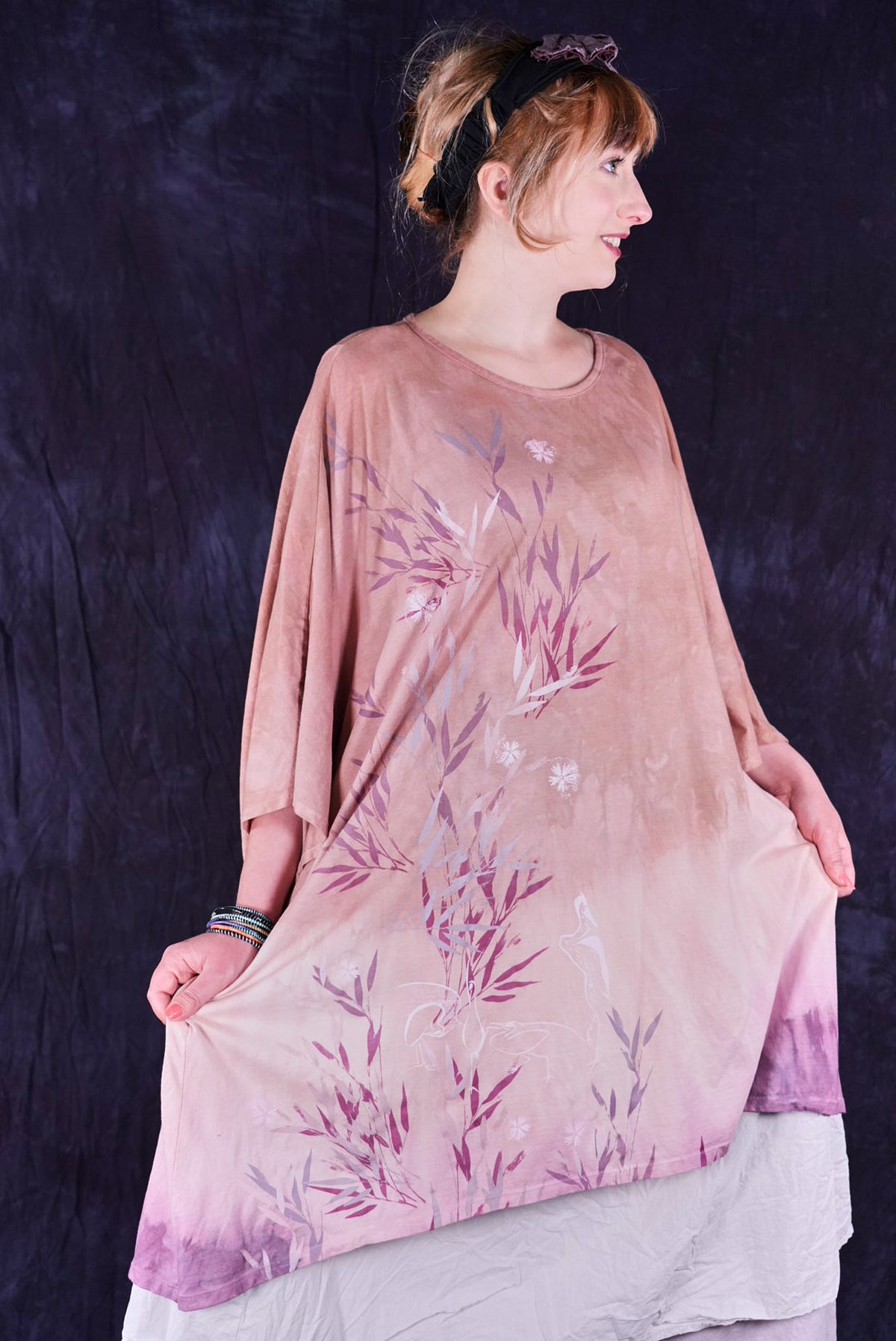 This one-size, organic cotton tunic is hand dyed in a Studio Intensive Process including special layered hand dyeing process, plus hand printing in multiple subtle shades adorn the front with layers & layers of delicate, imaginative imagery from our Fairfield, Iowa studio. Our artists loved decorating these! The large, square size gives us lots of space for printing--each is a “walking canvas” of visual artistic delight.