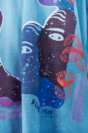 This one-size, organic cotton tunic is adorned all over the front with layers & layers of delicate, imaginative imagery from our Fairfield, Iowa studio. Our artists loved decorating these! The large, square size gives them lots of space for printing--each is a “walking canvas” of visual artistic delight.