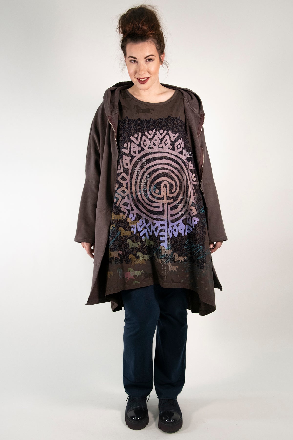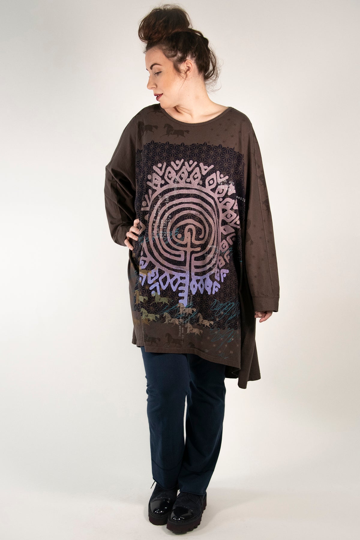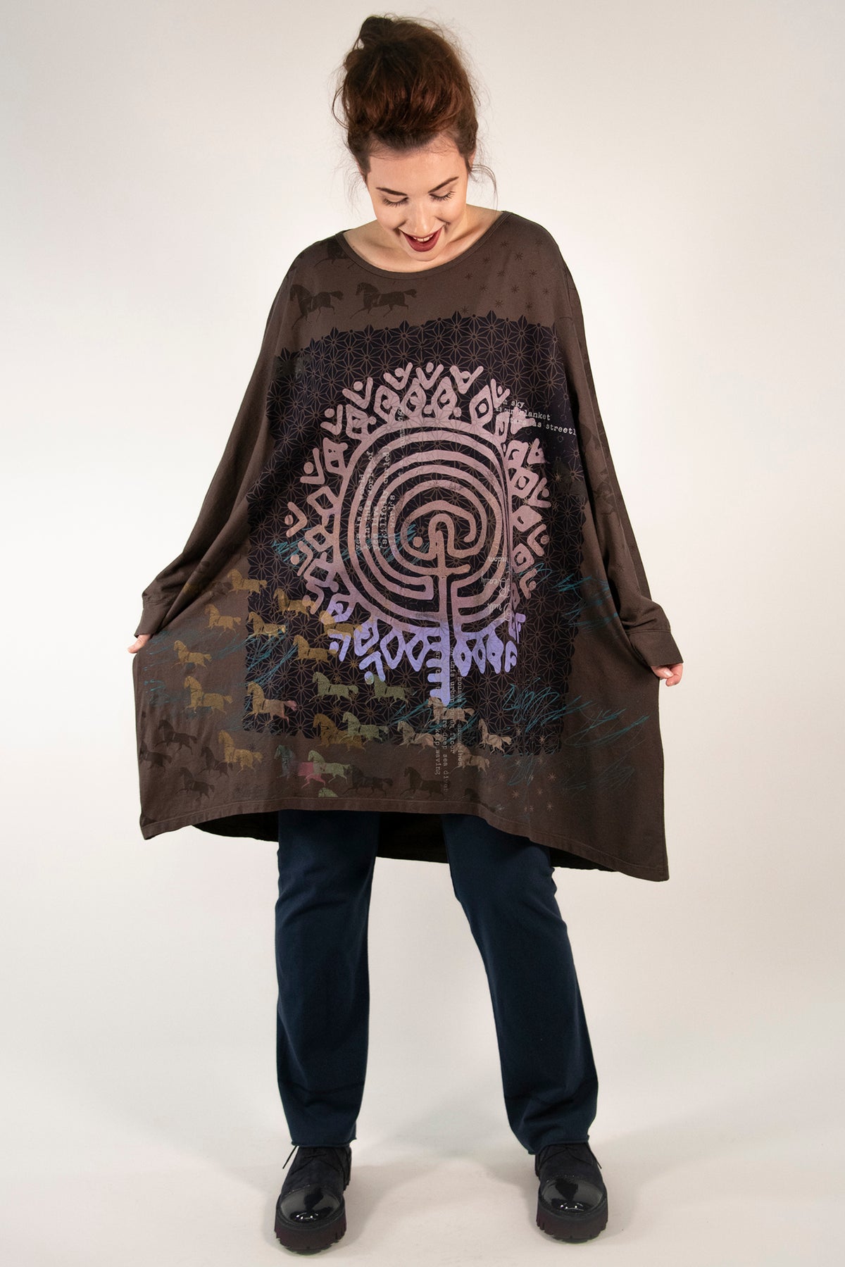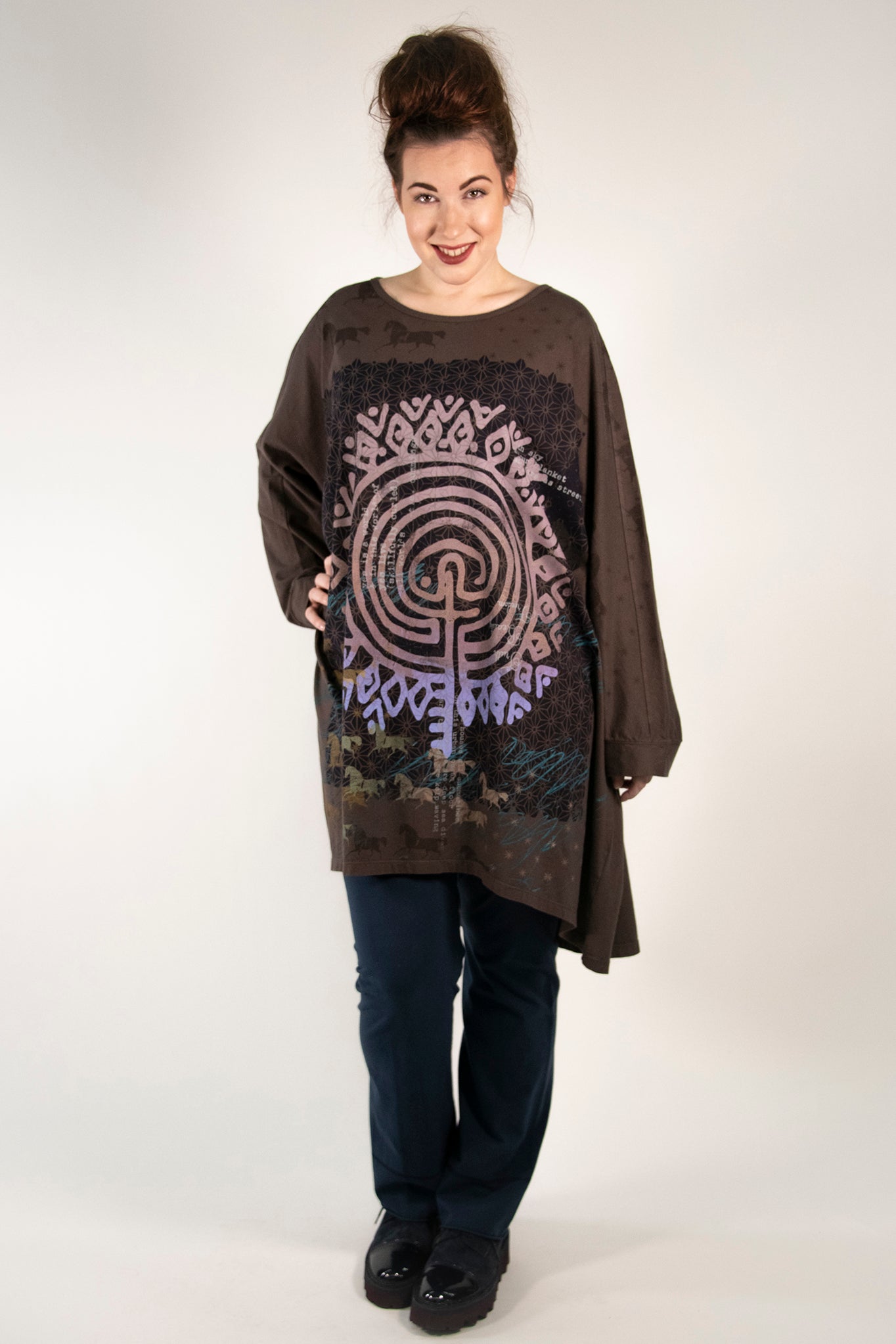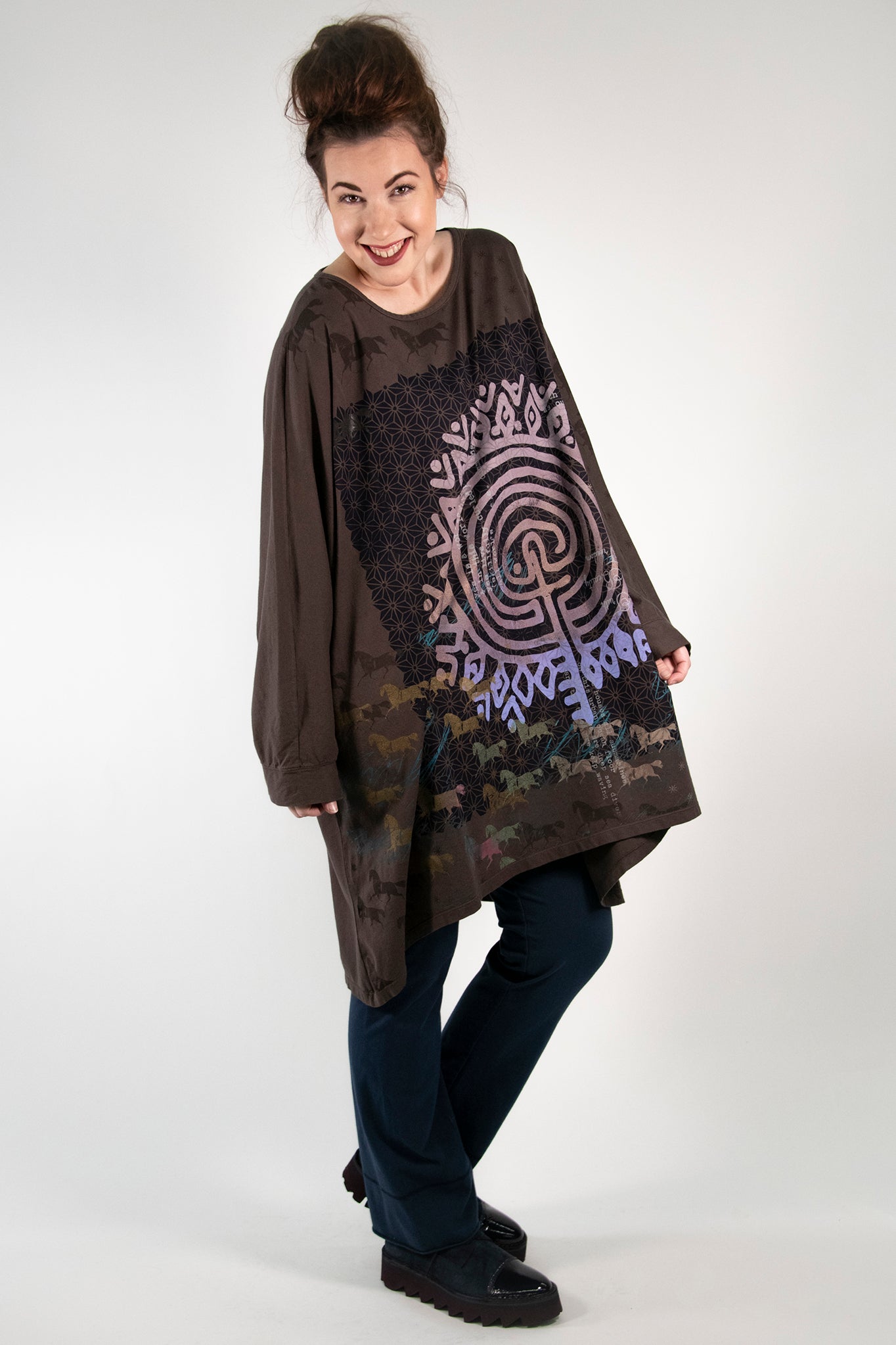 This ONE-SIZE organic cotton tee/tunic is a favorite style, updated with long sleeves for the cold weather! 4 inches longer in the back at the hem. Long...hits approximately a few inches above the knee. Layered prints created by hand cover the front from seam to seam and neck to hem (just get it! you'll never find anything like it in a million years)... If you like our Line Tee, you'll love this style as well.