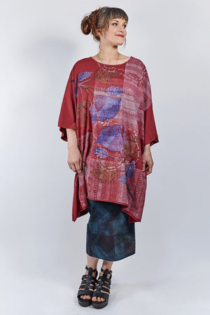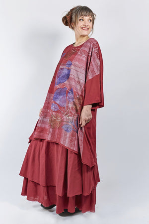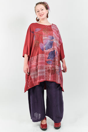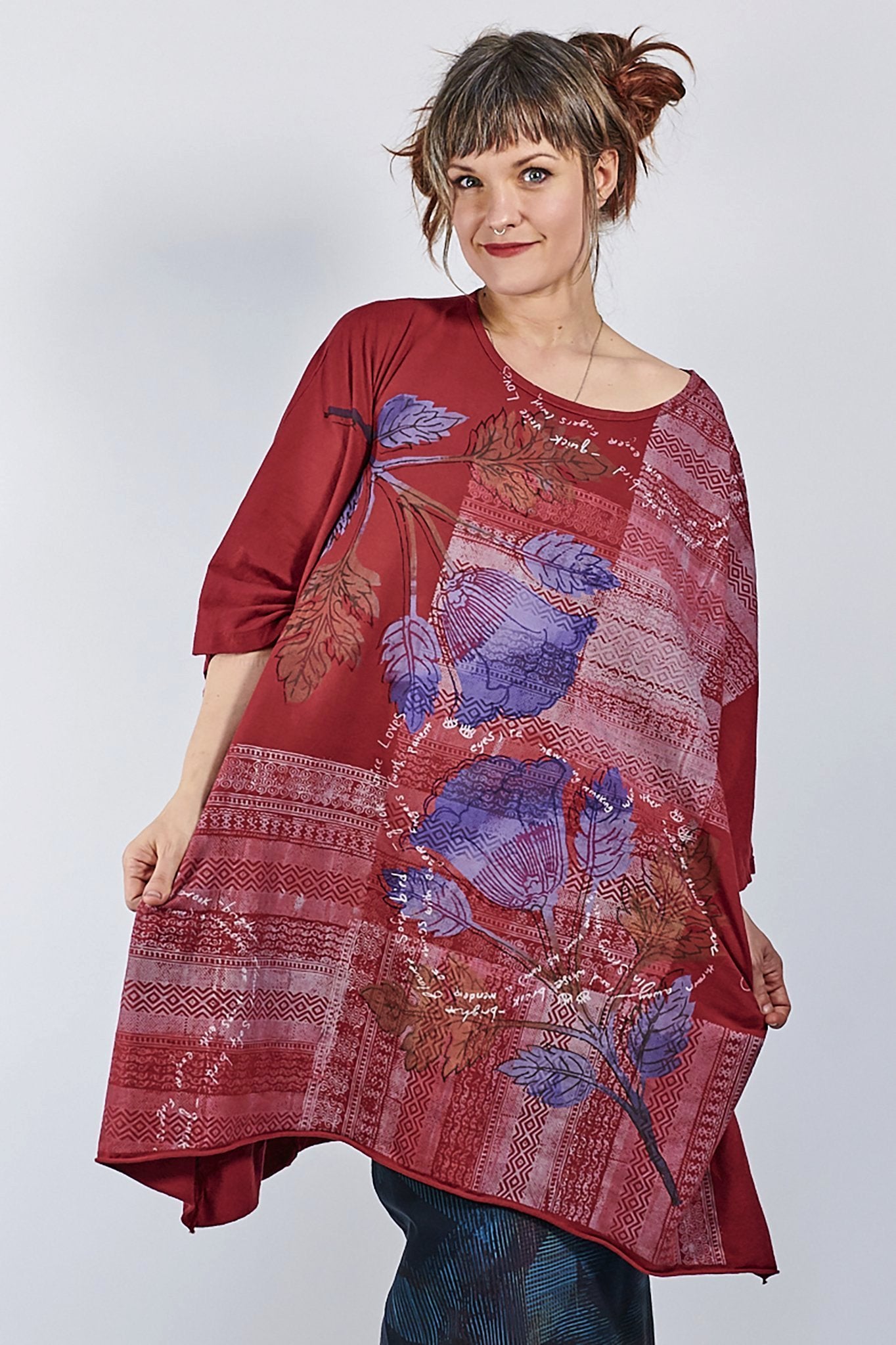 Graceful flowers & woven textures dance along with poetic verses that twist & sing in elegant style--This ONE-SIZE organic cotton tee/tunic is a new style we think you'll love. Throw it on over leggings, linen pants, or wear it as a beach cover-up. 4 inches longer in the back at the hem, sleeves come past the elbow. Long...hits approximately a few inches above the knee. Layered prints created by hand, cover the front from seam to seam and neck to hem (just get it! you'll never find anything like it in a million years)... If you like our Line Tee, you'll love this style as well. It's longer and has a different look than our Line Tee, but it shares the "I want to throw that on and feel absolutely relaxed,"